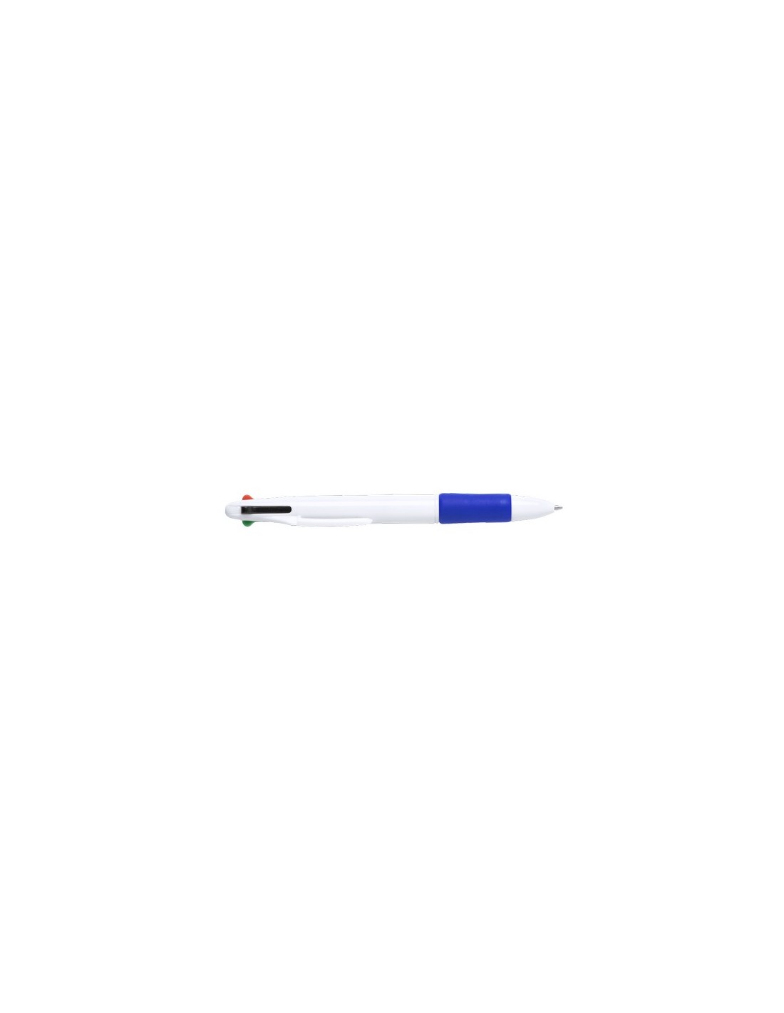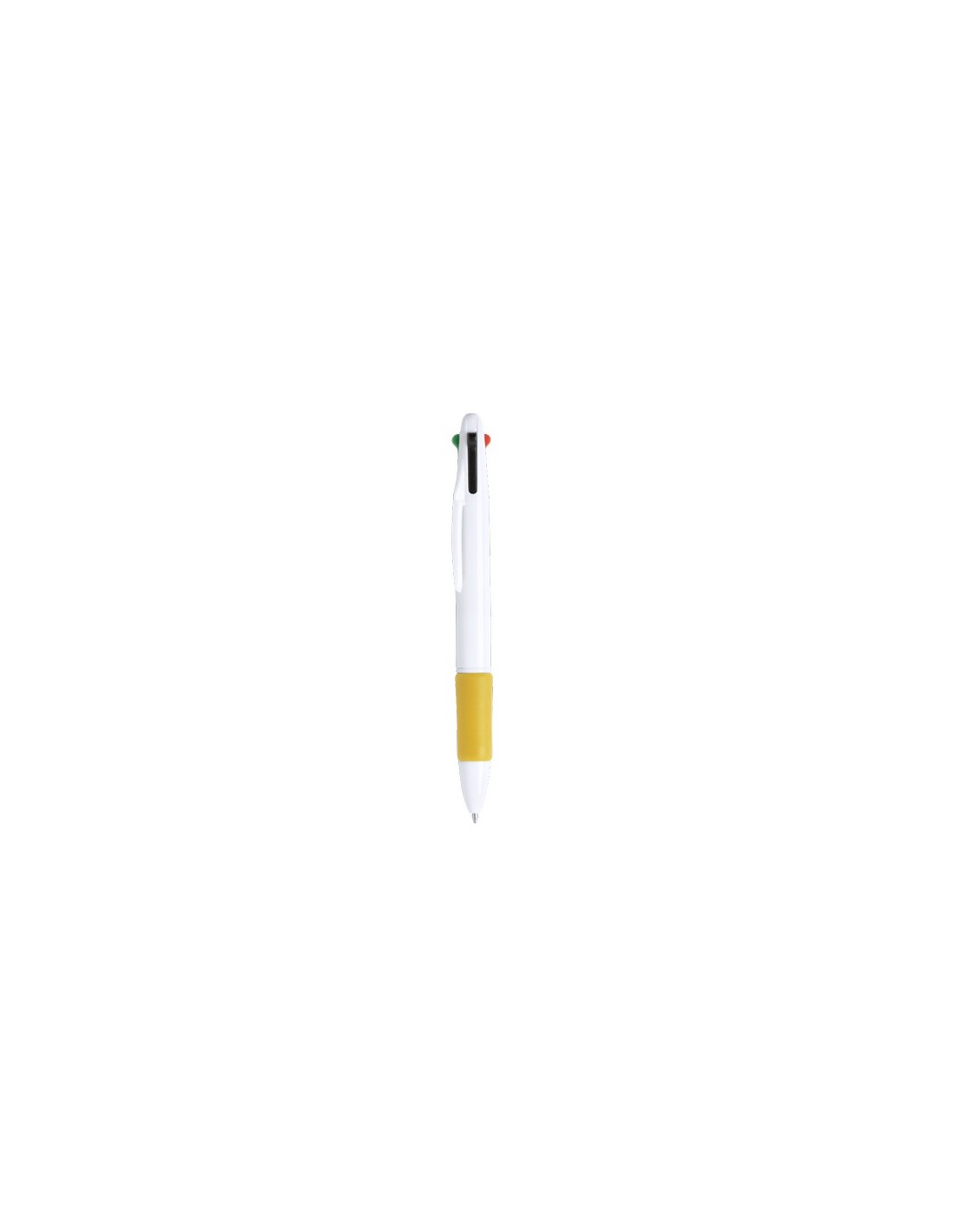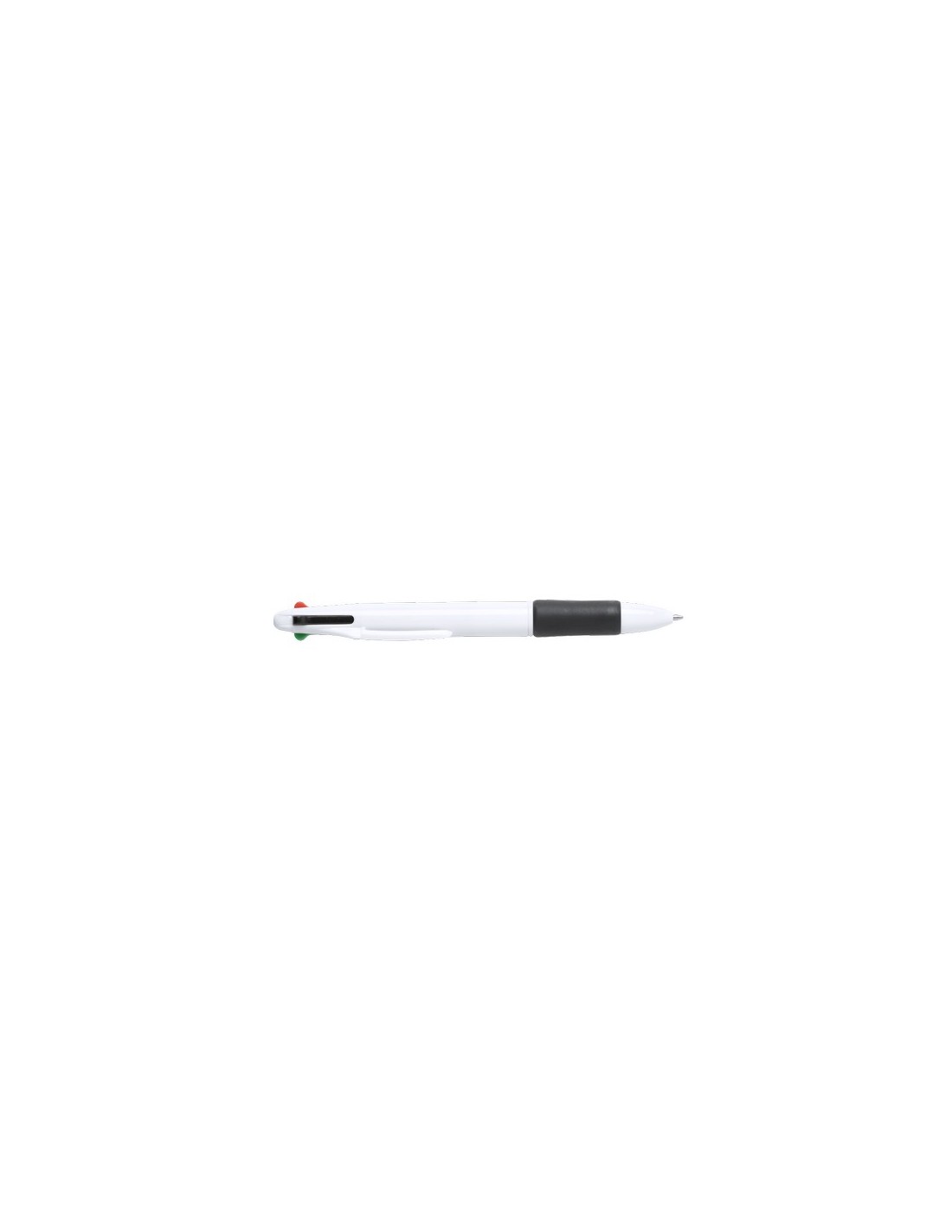 Bolígrafo 4 en 1 de mecanismo pulsador retráctil, de clásico diseño y cuerpo de suave acabado sólido en color blanco. Suave empuñadura a juego en vivos colores. De 4 cartuchos, en tintas azul, negra, roja y verde. Escritura 4 Colores