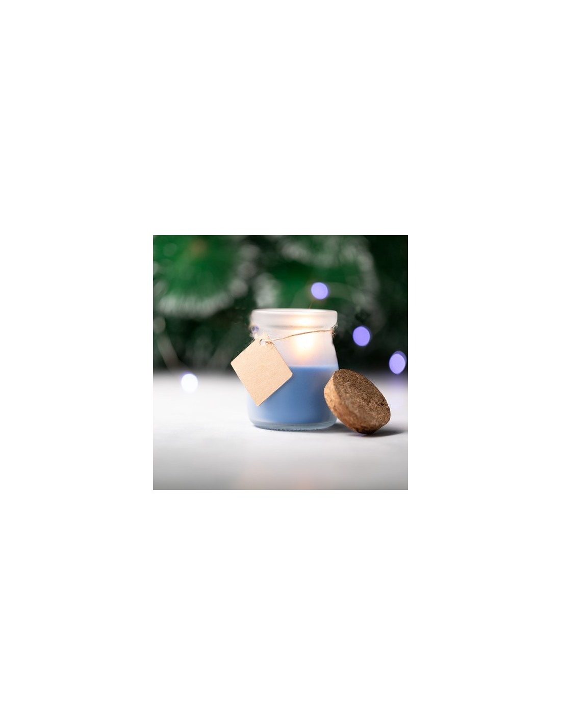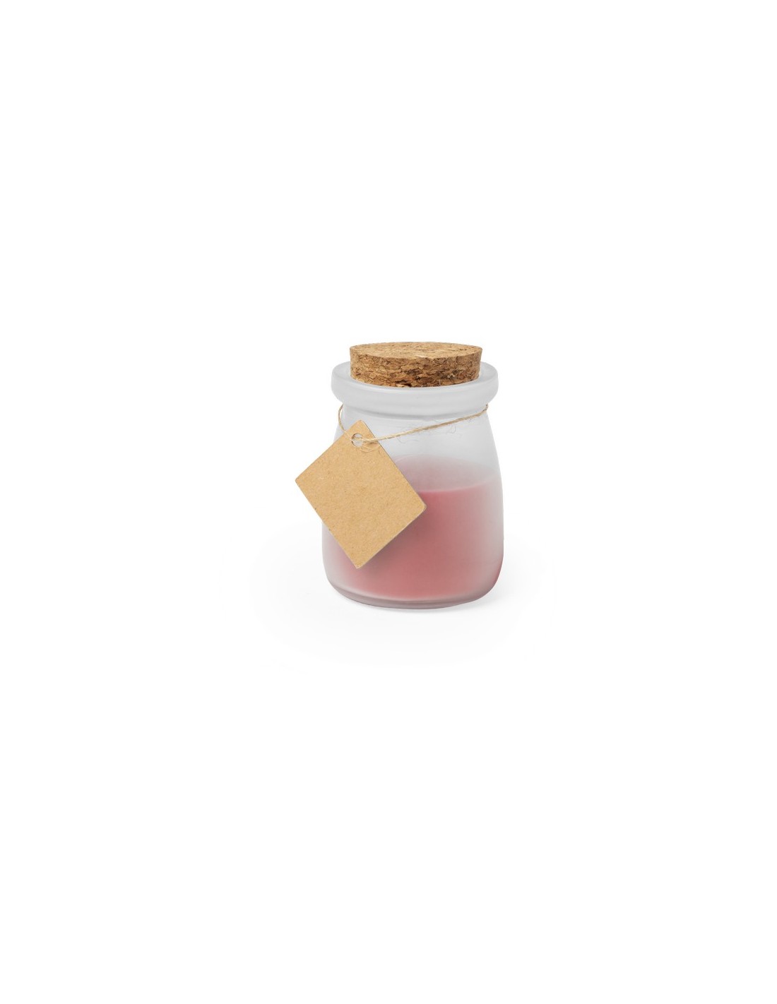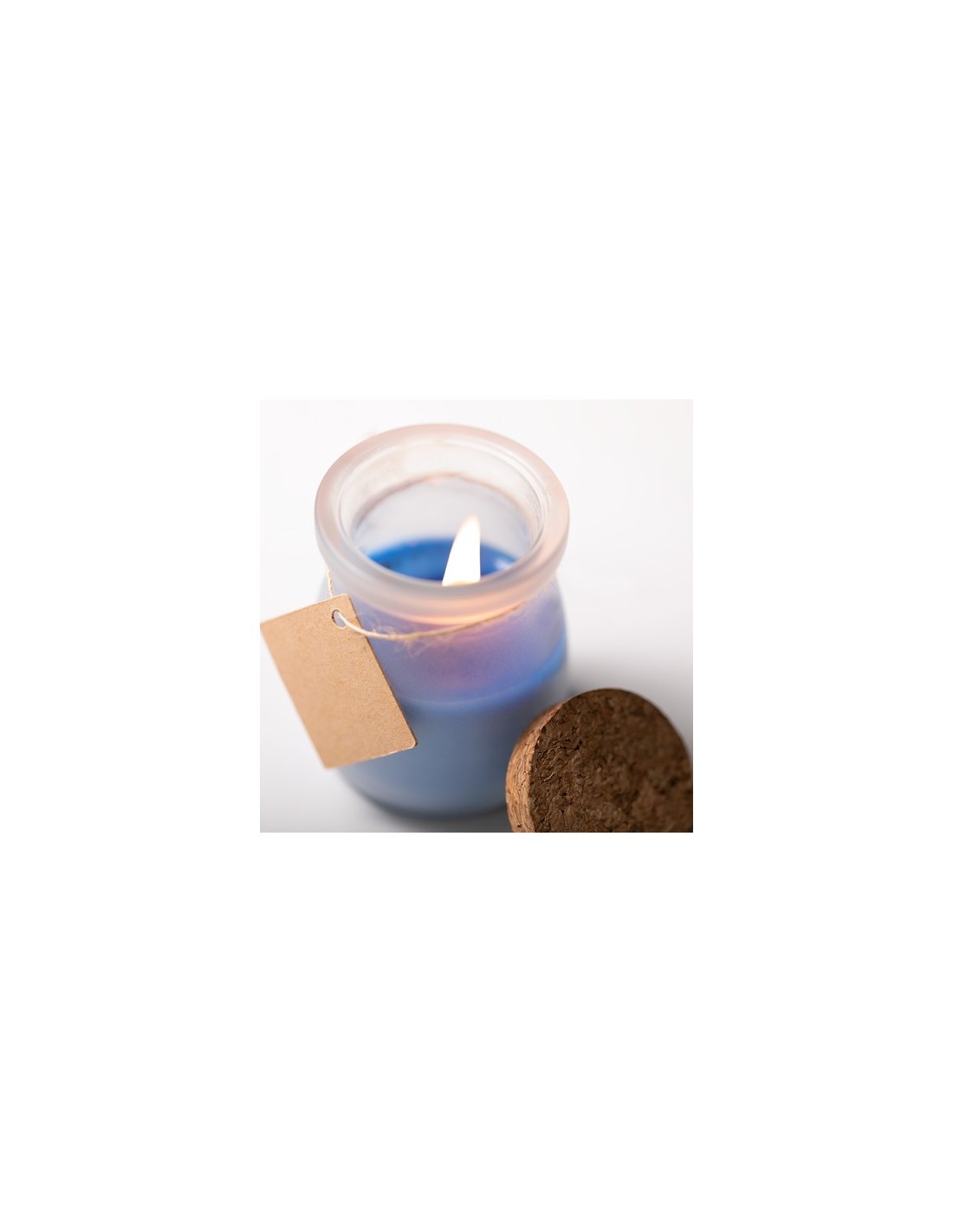 Original vela tarrito de cristal. Con tapón de corcho y etiqueta de cartón reciclado con hilo para mensajitos. Disponible en varios colores y presentada en caja blanca individual. Composition : Cristal/ Corcho.