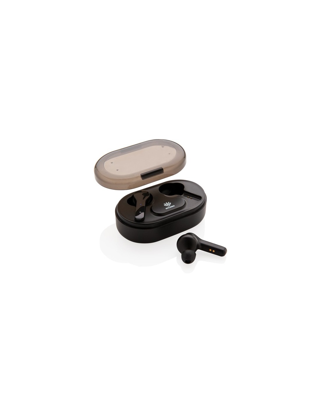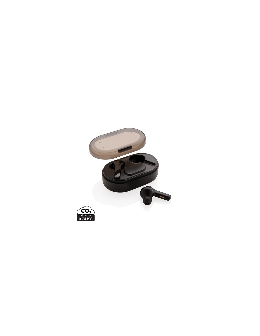 Máxima libertad al escuchar tu música desde tu dispositivo móvil. Estos auriculares TWS vienen en un estuche de carga inalámbrica de 300 mah con opción adicional para agregar un logo que se iluminará cuando se cargue el estuche. Los auriculares se recargan en 1,5 horas y tienen un tiempo de reproducción de hasta 3 horas. BT 5.0 para emparejamiento automático con tu dispositivo móvil y emparejar los auriculares juntos. Distancia de funcionamiento hasta 10 metros. Incluye cable micro usb TPE sin PVC para recargar la funda de carga. Con función de captura para contestar llamadas. Incluye 3 almohadillas de recambio de diferentes tamaños. Material : ABS Recycled Content Percent : 0 Conforme directiva equipamientos Radio y Telecomunicaciones 2014/53/EU, Conforme directiva de sustancias peligrosas 2011/65/EC & 2015/863, Hoja de datos de seguridad del material disponible, Conforme PAHS content in Reach & ZEK 01-4-08, Conforme directiva Phtalate content, Conforme directiva Battery transportation safety UN38.3, Certificado para transporte aéreo, Conforme directiva seguridad baterias Alcalinas EN62133, Libre de parafinas cloradas de cadena corta y media. WEEE Battery : 3 Li-poli - 9 g. Packaging : Caja de regalo All print codes : CO2 Engraving 2 - Print code default : Grabado CO2 - en interior - 20 x 10 mm - max color : 1 Social Audits : BSCI Total CO2 emissions : 0,74.
