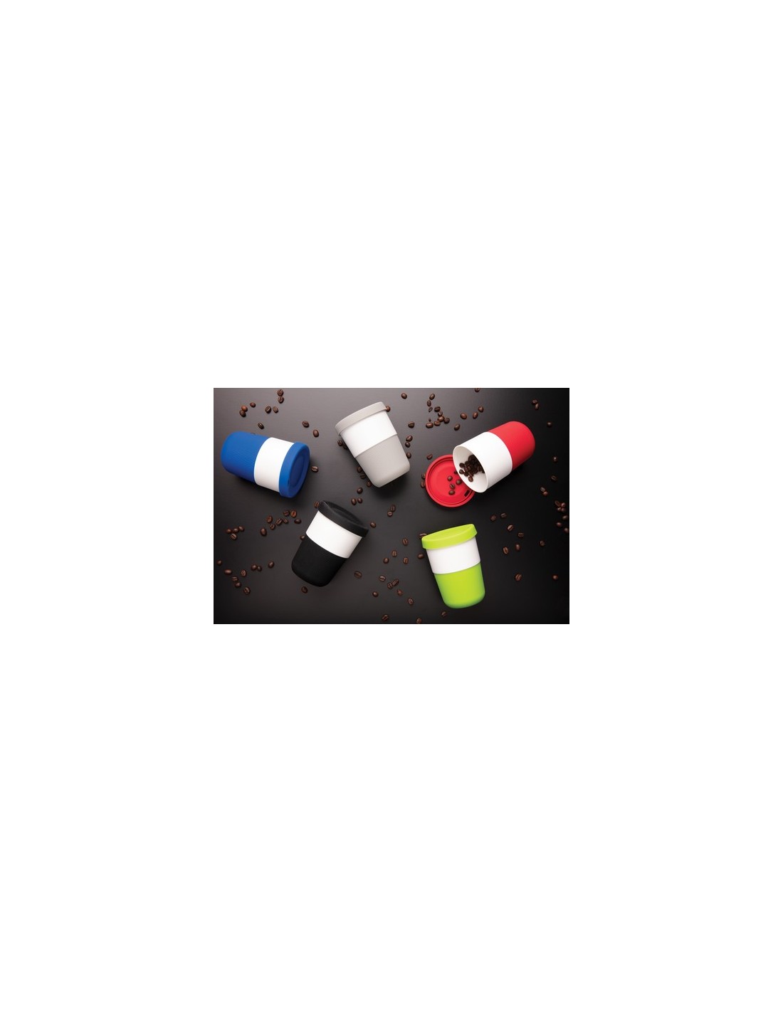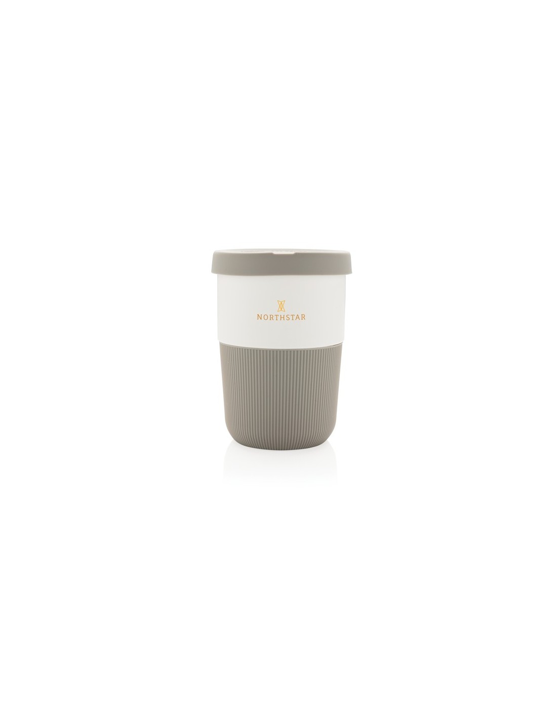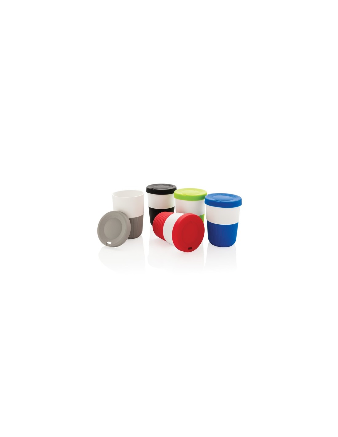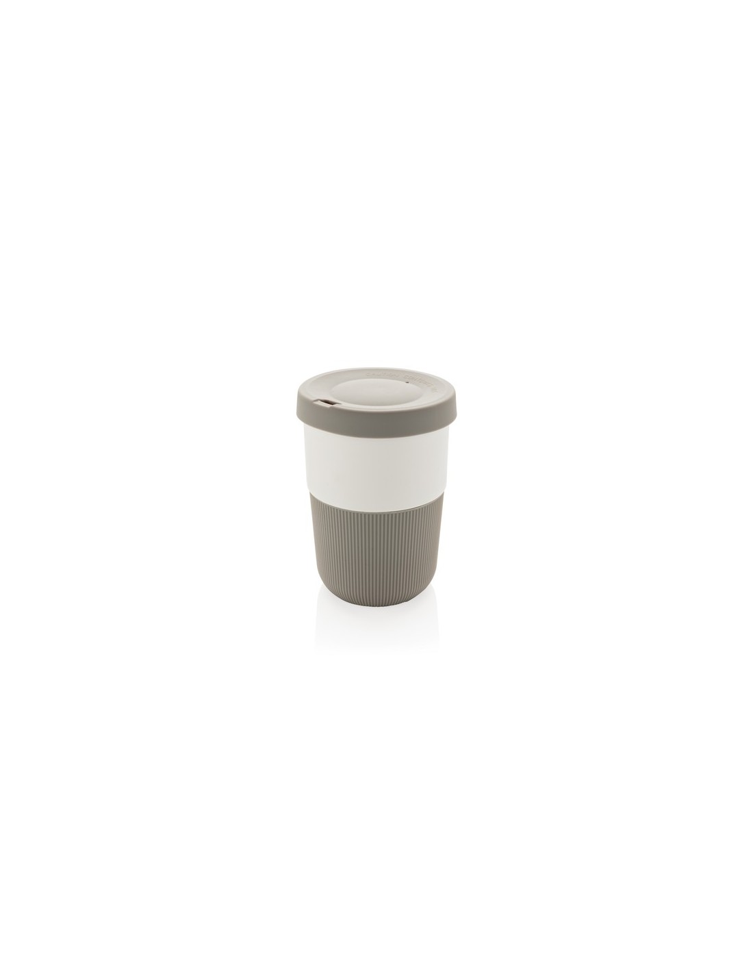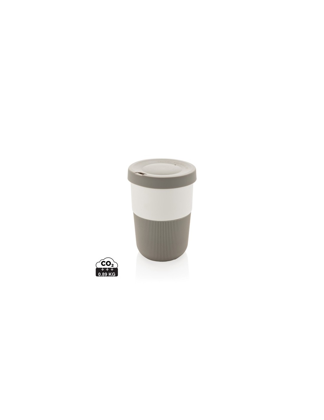Una alternativa sostenible a las tazas tradicionales! Dando estilo y practicidad a tu viaje matinal, esta taza de café PLA es ideal para llevar tu bebida caliente favorita. Esta taza no solo es elegante sino también amable para el planeta. Viene con un agarre de silicona y una tapa para tu comodidad. 100% libre de melamina. Capacidad 380ml. Material : PLA, Silicona Recycled Content Percent : 0 Sin materiales Bisphenol A, Conforme legislación alimentos Alemania, Conforme directiva Phtalate content, Libre de parafinas cloradas de cadena corta y media. Packaging : Bolsa de plástico y caja individual All print codes : Pad Print Drinkware,Digital round 360-1,CO2 Engraving 3 - Print code default : Tampografía - parte frontal/alta del artículo - 25 x 20 mm - max color : 5 Social Audits : BSCI Total CO2 emissions : 0,89.