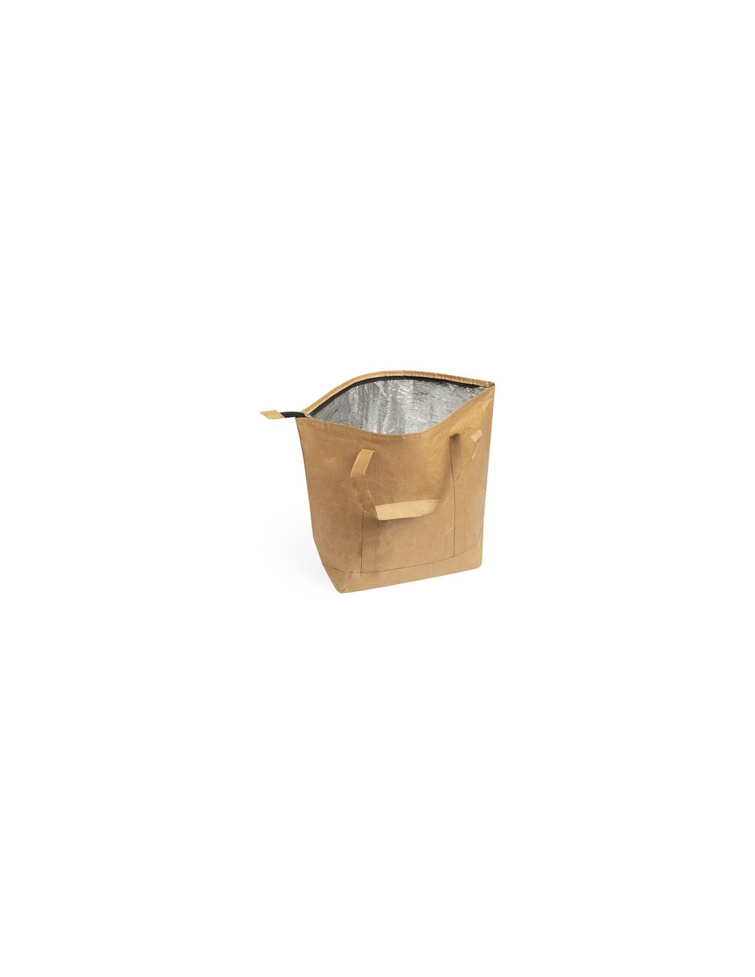 Innovadora bolsa térmica en papel laminado, resistente a las salpicaduras de agua y con interior en aluminio. Tamaño 43x33+14 cm, con cierre de cremallera y amplio bolsillo en frontal. Asas medianas reforzadas de 45 cm, libre de BPA. Composition : Papel Reciclado Laminado/ Aluminio.