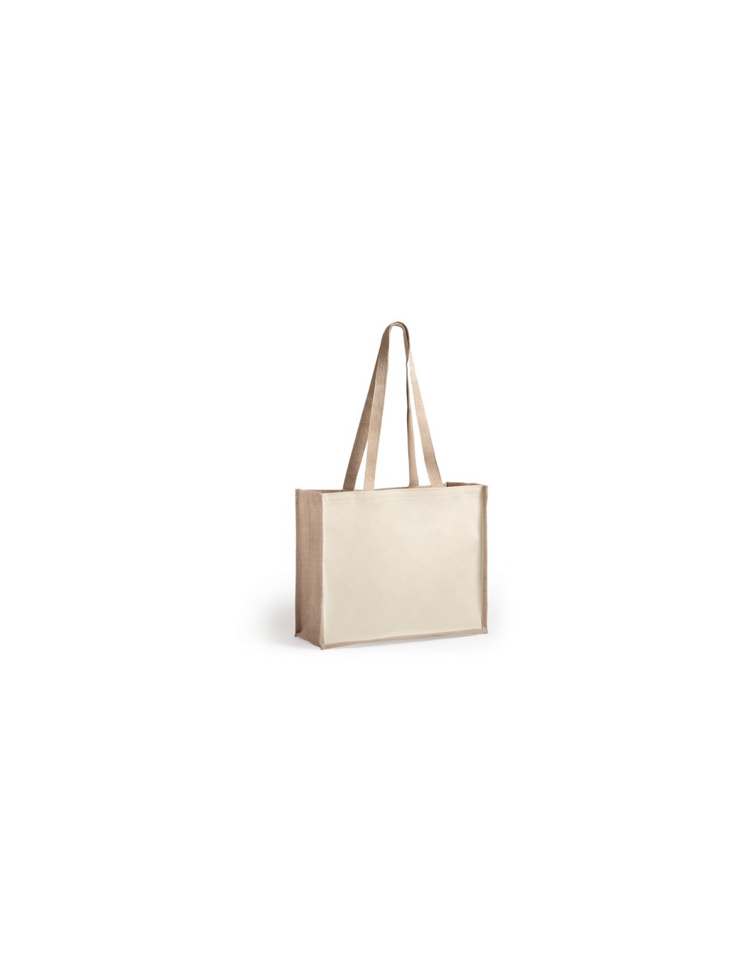 Bolsa de línea nature, en combinación de materiales yute laminado y algodón laminado. Tamaño 39 x 31,5 + 16 cm, de acabado cosido y con asas largas reforzadas de 76 cm. Resistencia de hasta 12 kg de peso. Composition : Yute Laminado/ Algodón Laminado.