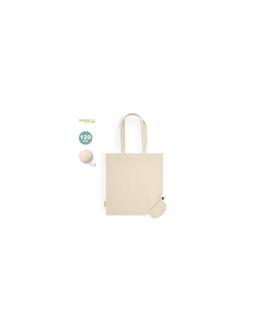 Bolsa plegable de línea nature en material 100% algodón orgánico natural de 120 g/m2. Asas largas de 70cm con refuerzo y de acabado cosido. Distintivo organic en etiqueta lateral y resistencia hasta 9 kg de peso. Plegado de pequeño tamaño para fácil transporte. Composition : 100% Algodón Orgánico 120 g/ m2.