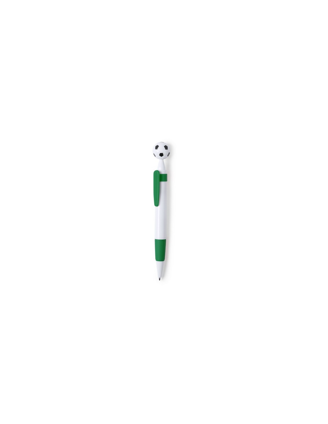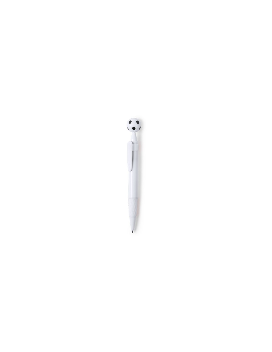 Bolígrafo para los más futboleros con detalle en forma de balón. De mecanismo pulsador y en desenfadado diseño bicolor. Con cuerpo en color blanco, con clip y empuñadura a juego, en variada gama de colores. Amplia superficie de impresión y en tinta azul.