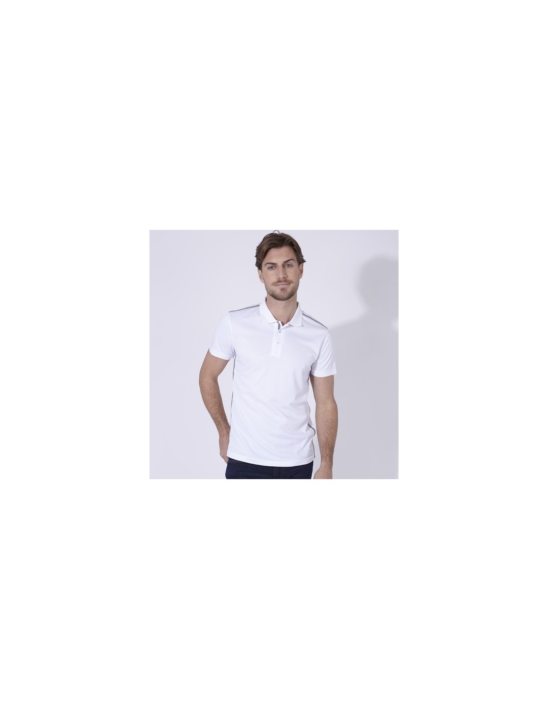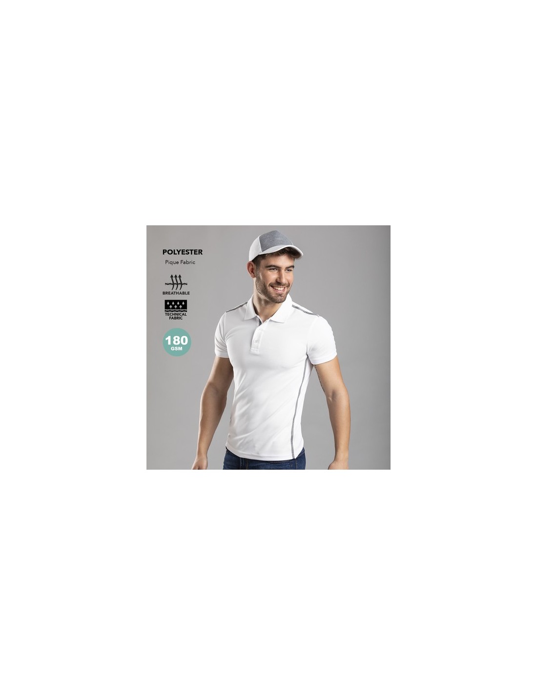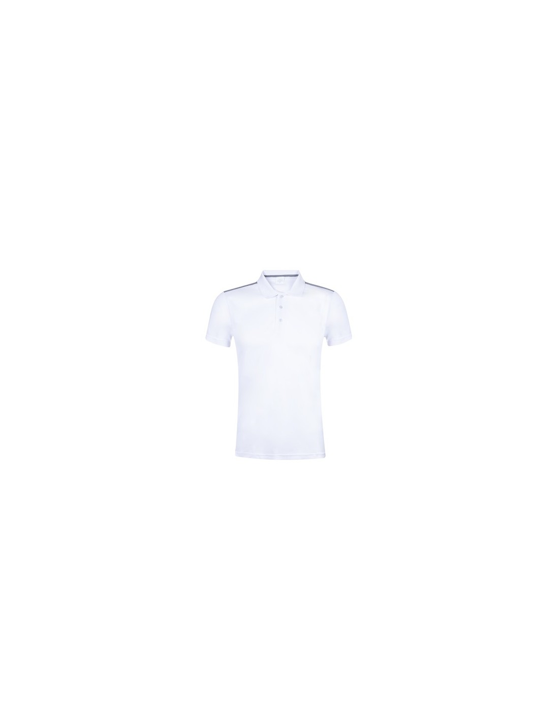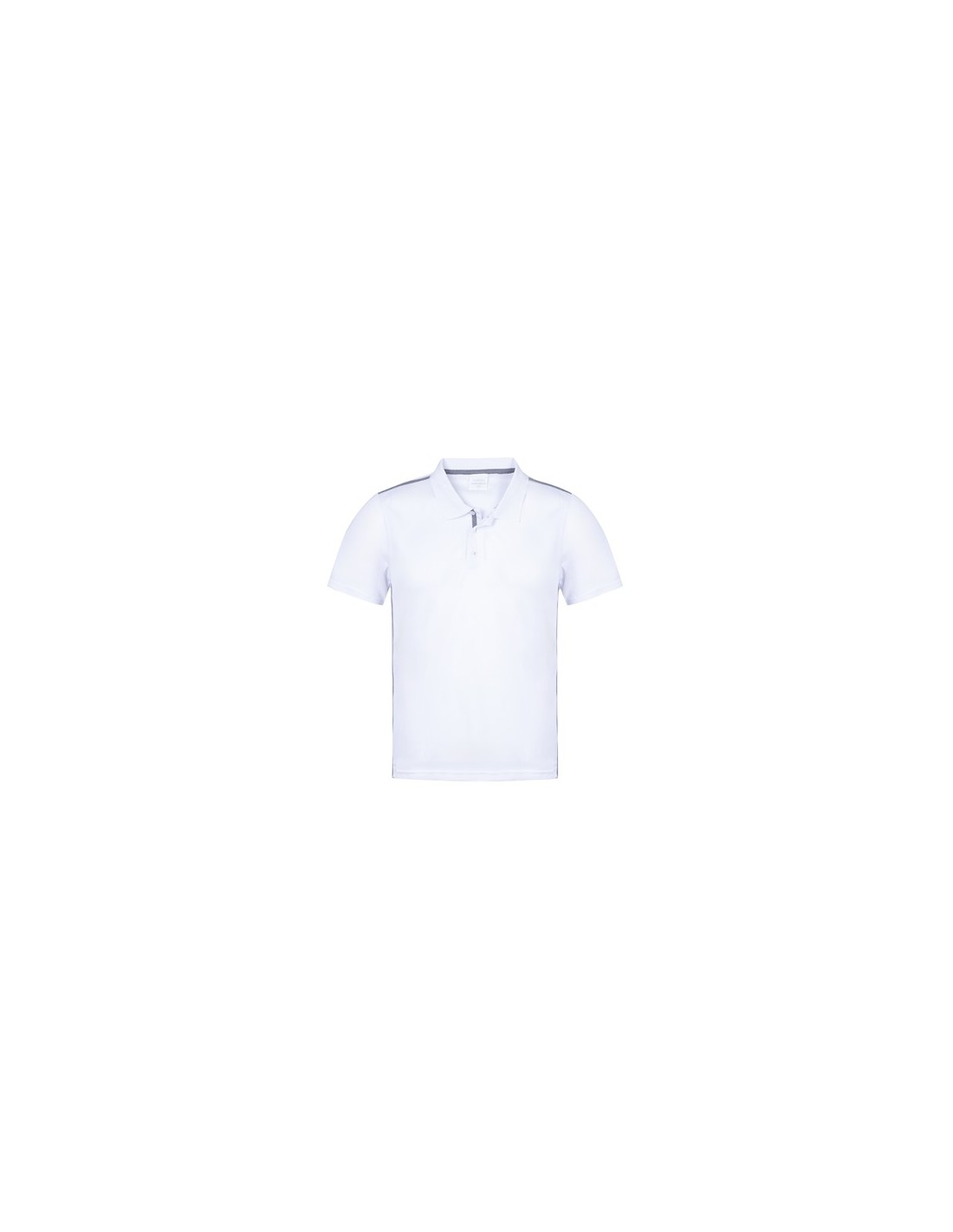 Polo técnico para adulto en poliéster transpirable de 180g/m2. De elegante diseño bicolor, en color blanco con contraste de detalles en gris. Disponible en tallas S, M, L, XL, XXL. Color blanco especialmente fabricado para marcaje en sublimación. Transpirable Composition : 100% Poliéster, Pique 180 g/ m2.