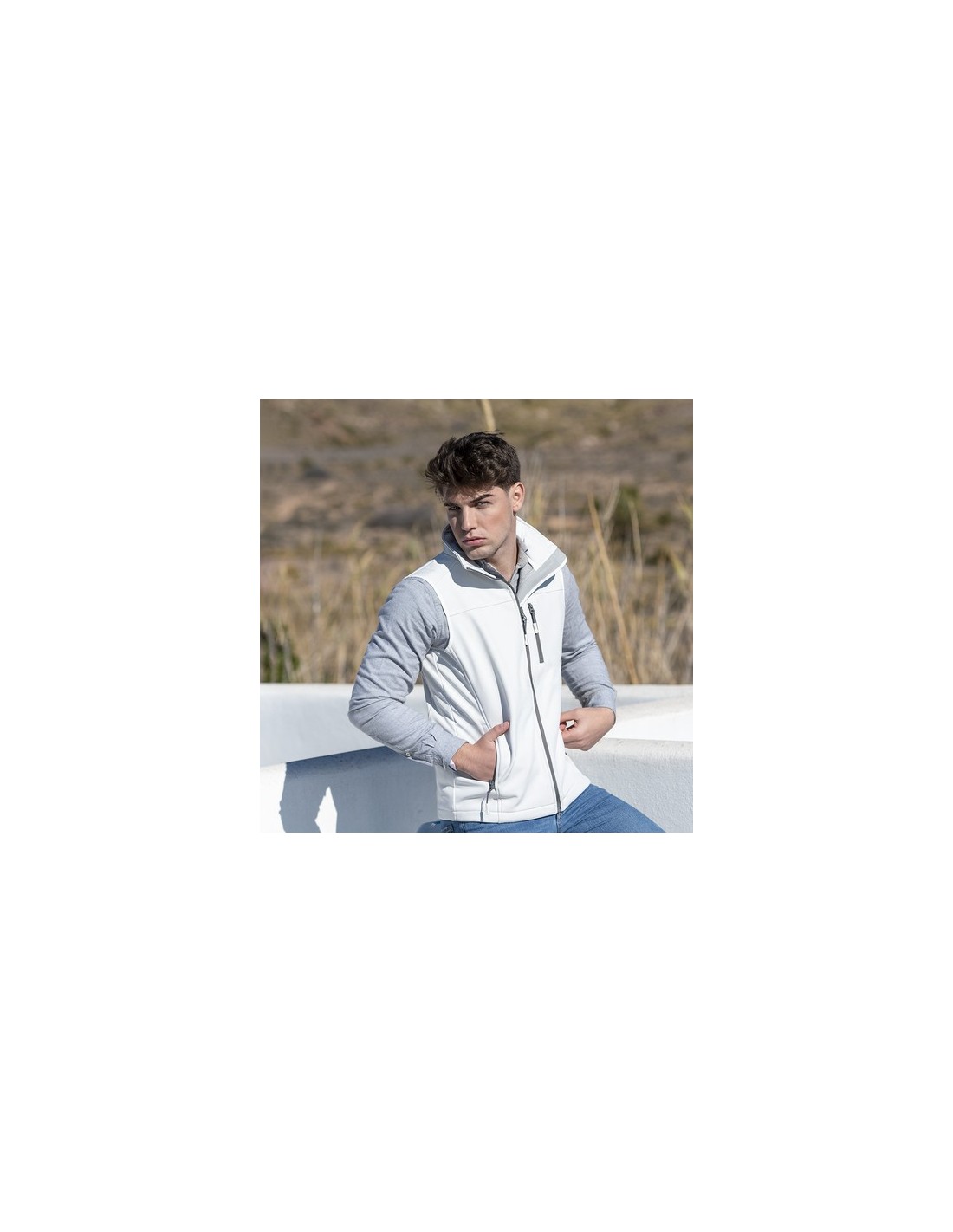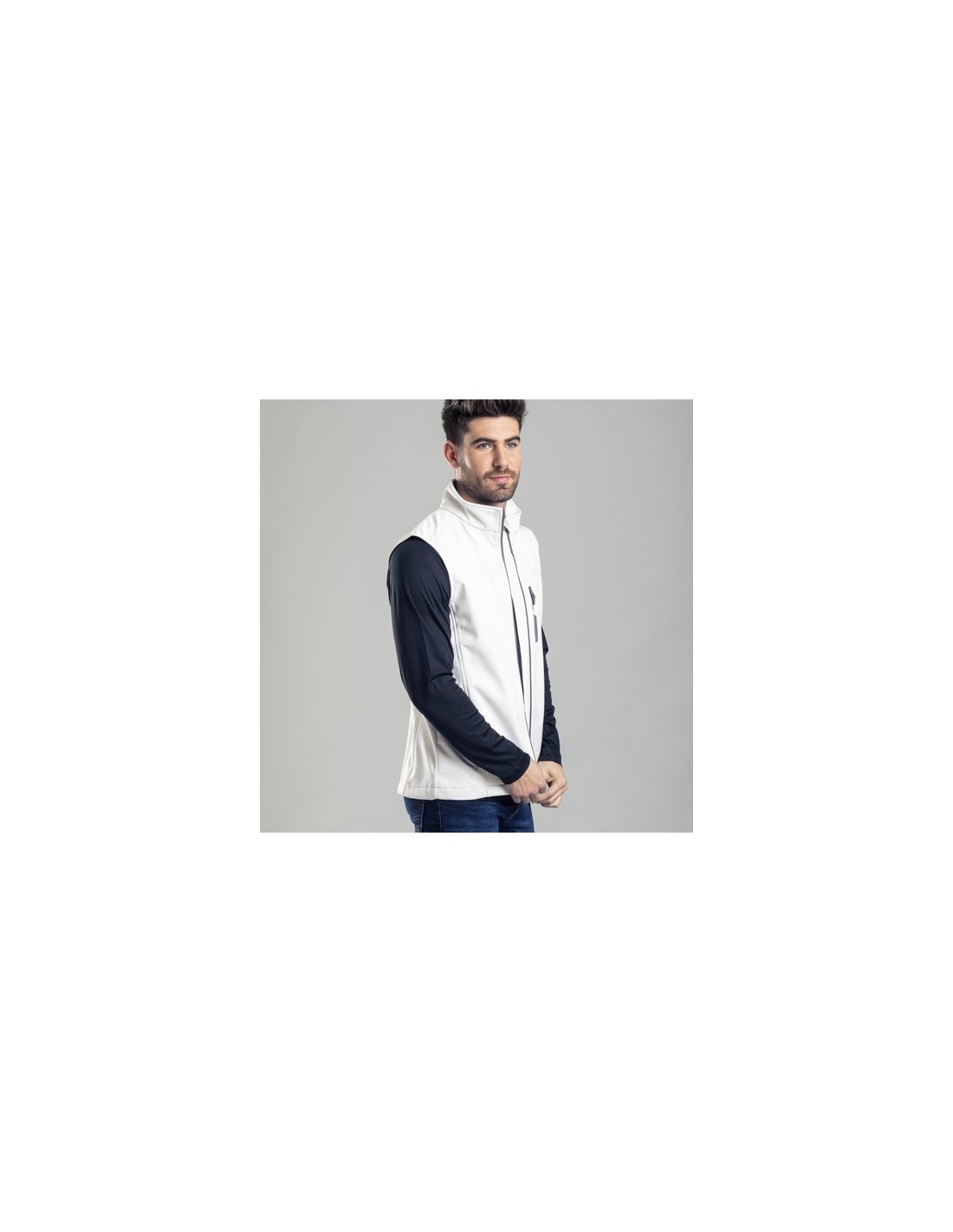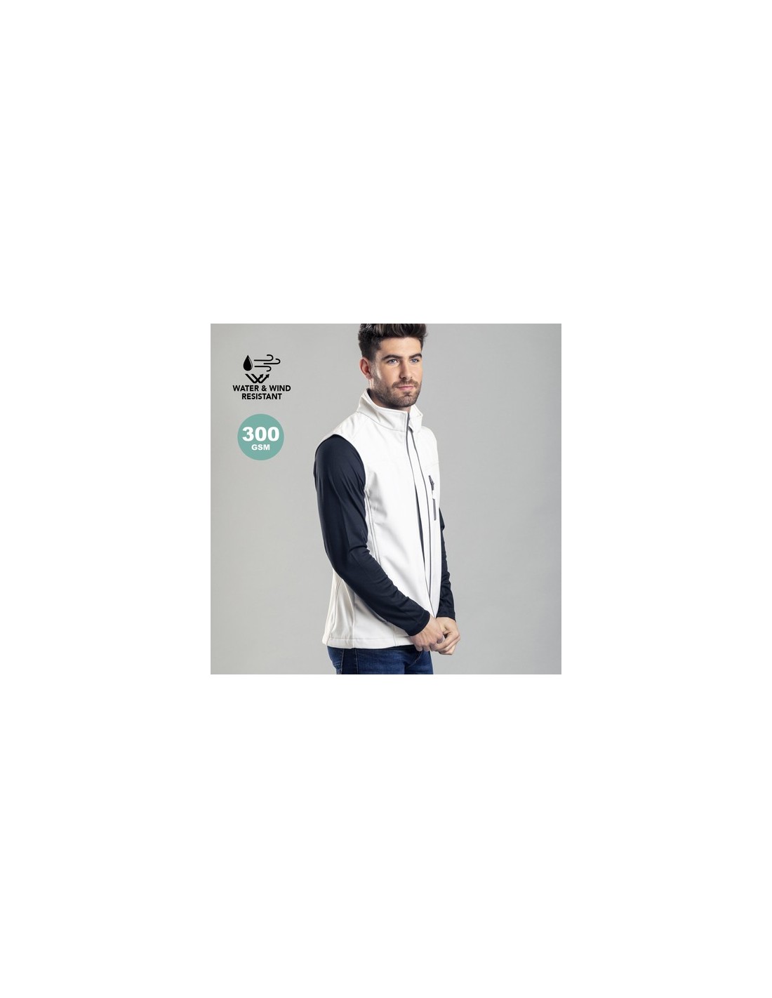 Chaleco impermeable y transpirable en material soft shell de 300g/m2. De elegante diseño bicolor, en color blanco con contraste de detalles en gris. Cierre de cremallera y bolsillos frontal y laterales de cremallera. Disponible en tallas S, M, L, XL, XXL. Resistente al Viento y al Agua Composition : Exterior: Soft Shell. 92% Poliéster/ 8% Elastano. Interior: 100% Poliéster Micropolar 300 g/ m2.