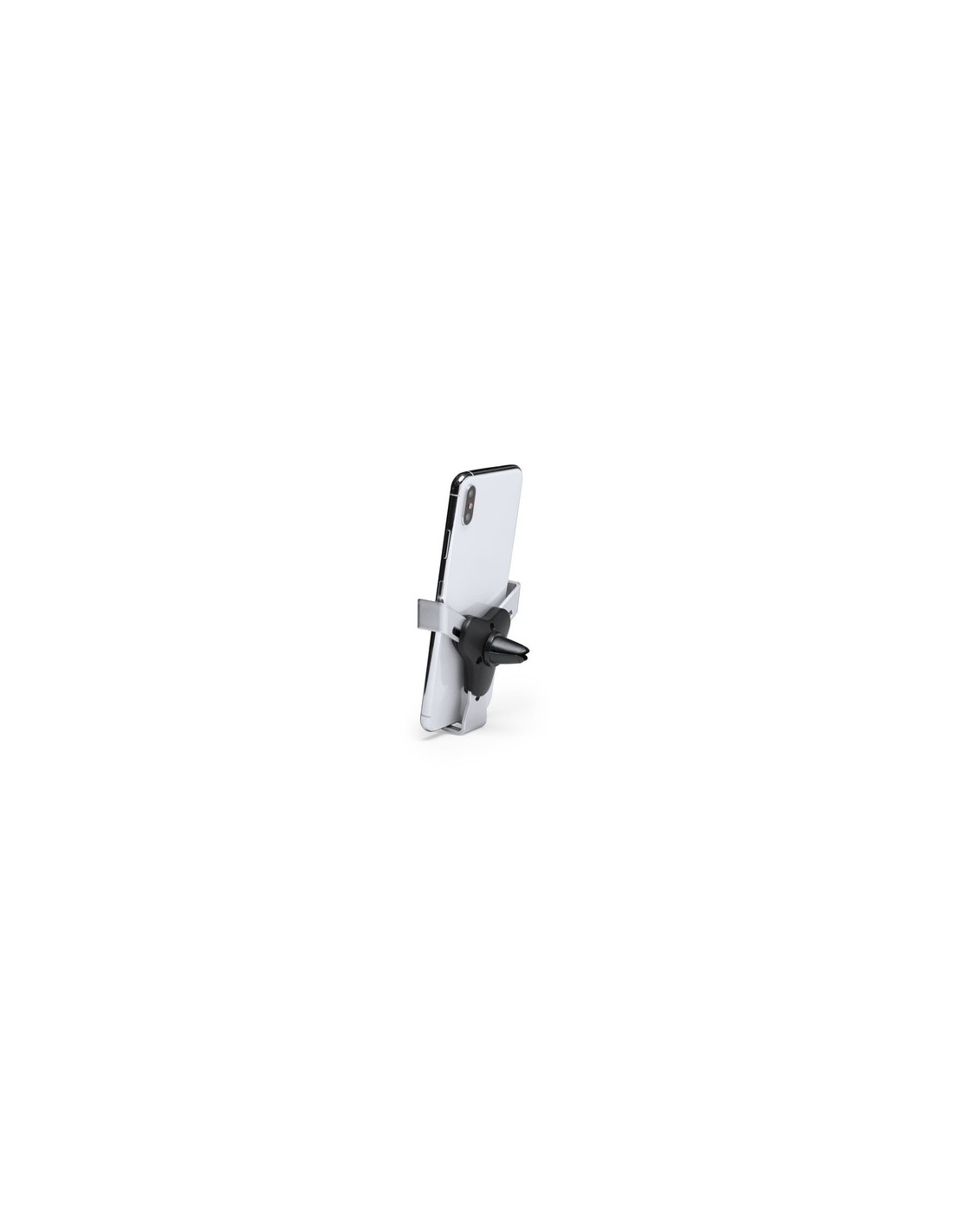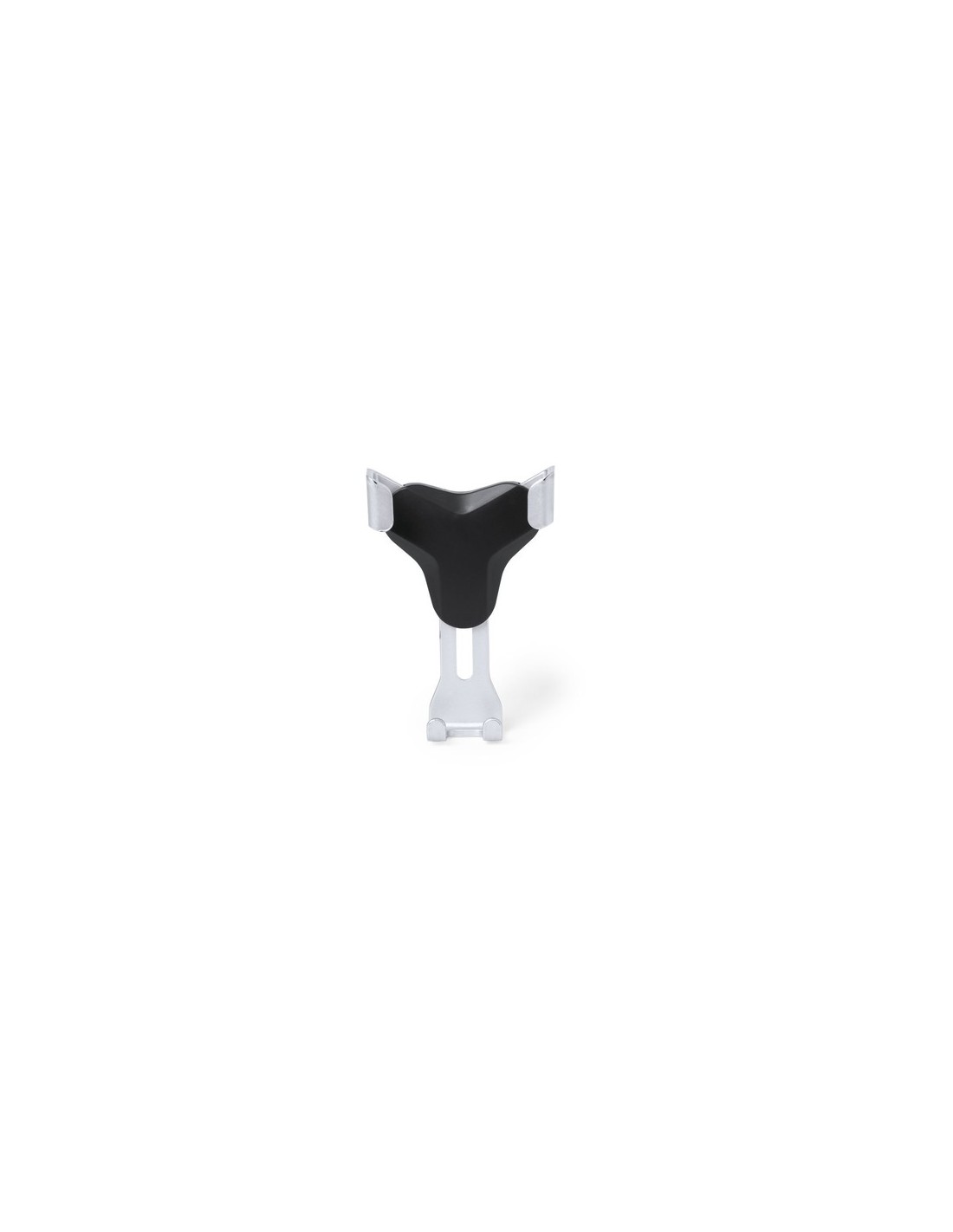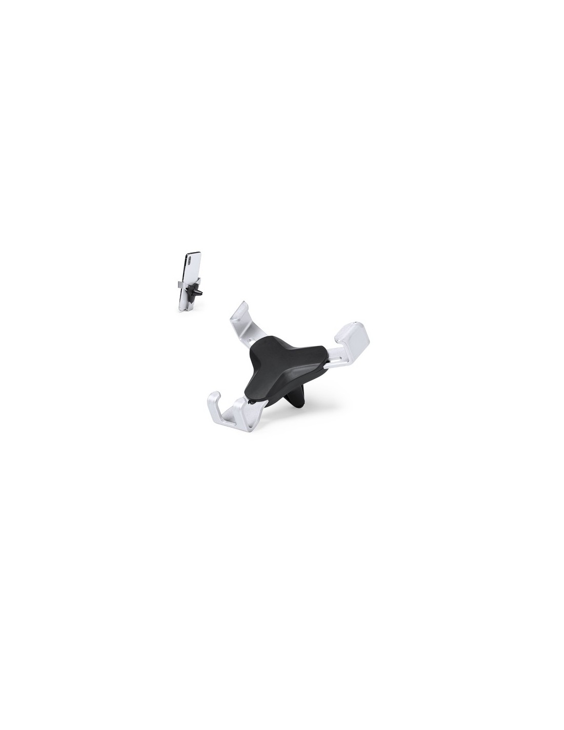 Ingenioso soporte para smartphone de diseño minimalista y especialmente diseñado para smartphones tamaño XXL. Con sistema de fijación universal que se activa por el propio peso del teléfono, ajustando las pinzas de agarre una vez que se sitúa el dispositivo en el soporte. Para rejilla de ventilación del automóvil y con frontal especialmente diseñado para marcaje en tampografía. Ajustable