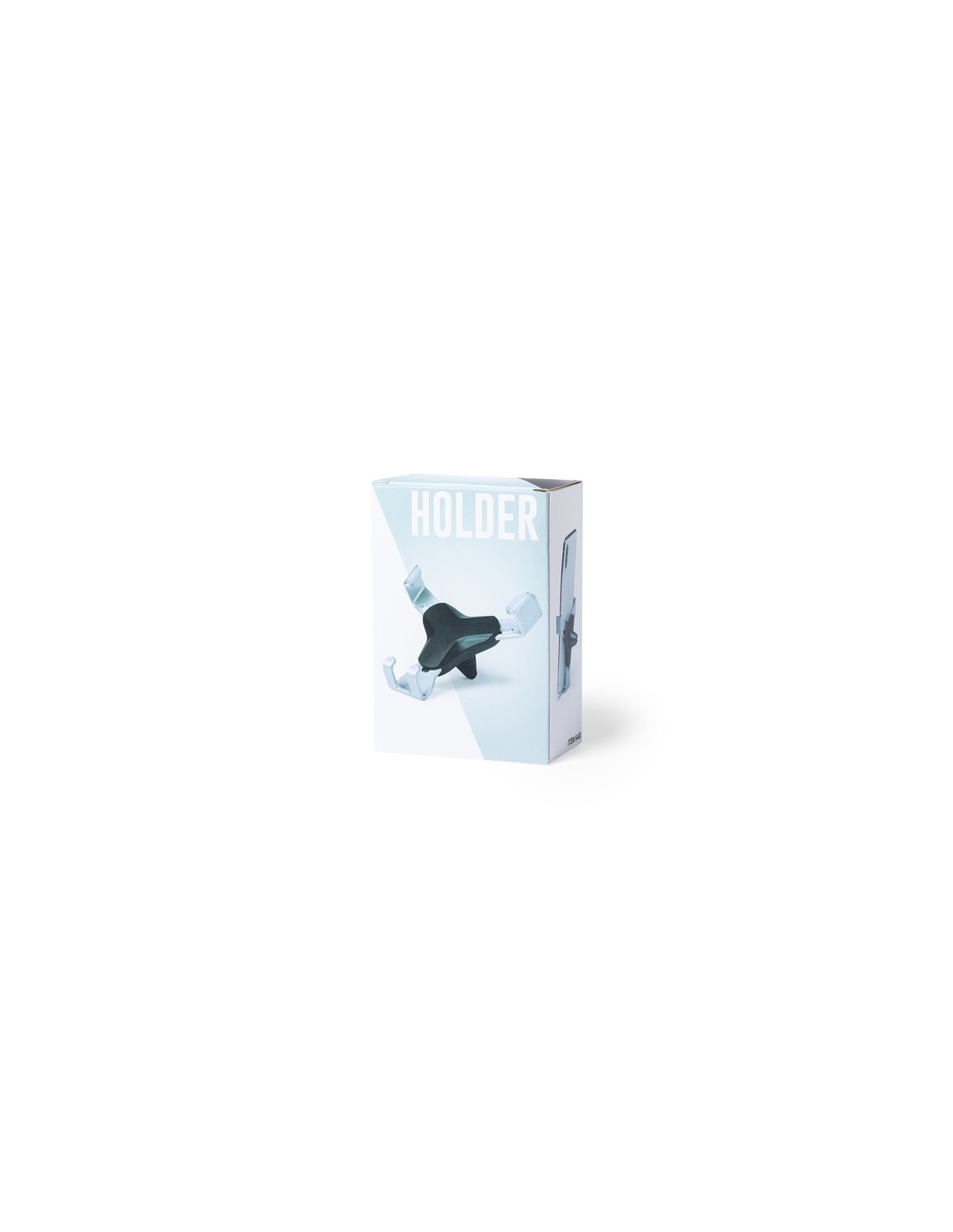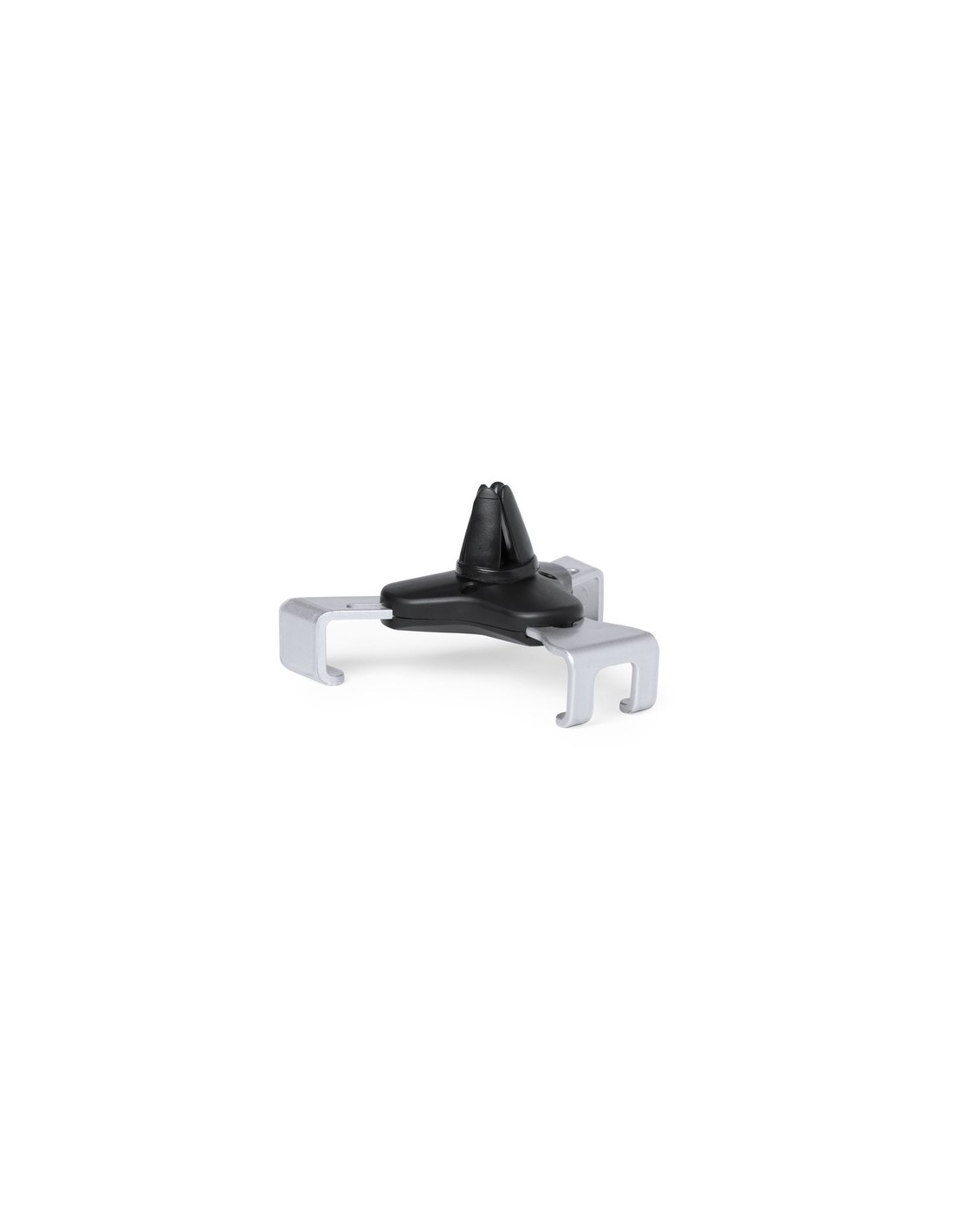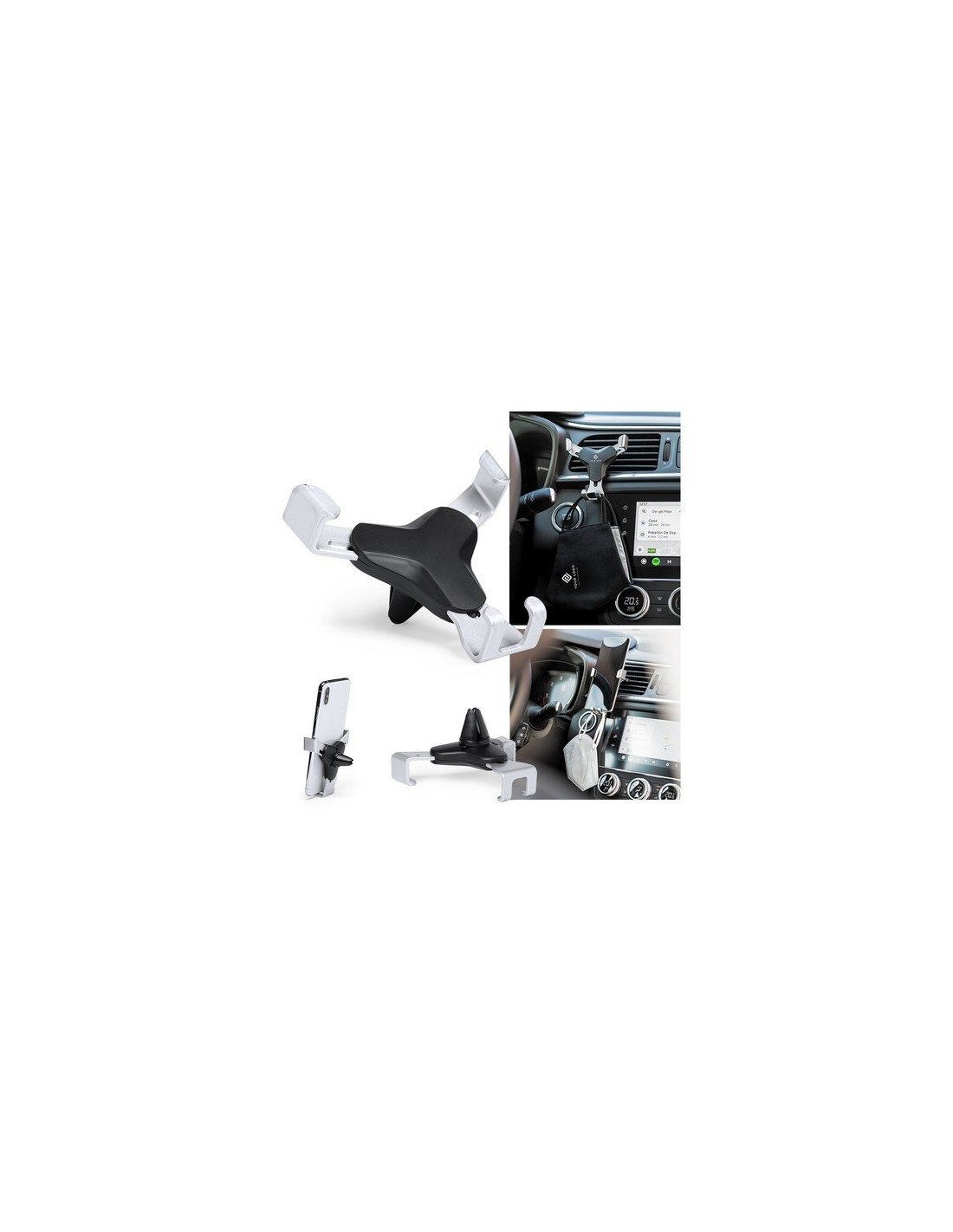 Ingenioso soporte para smartphone de diseño minimalista y especialmente diseñado para smartphones tamaño XXL. Con sistema de fijación universal que se activa por el propio peso del teléfono, ajustando las pinzas de agarre una vez que se sitúa el dispositivo en el soporte. Para rejilla de ventilación del automóvil y con frontal especialmente diseñado para marcaje en tampografía. Ajustable
