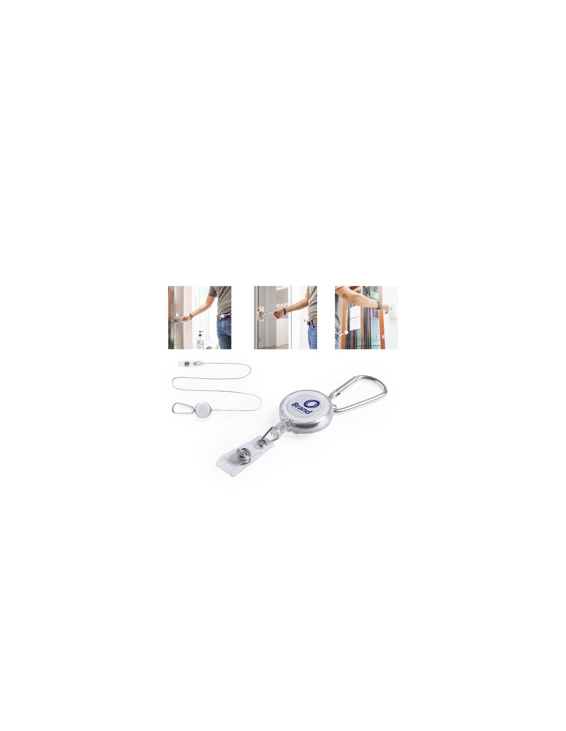 Porta objetos extensible de sobrio diseño, con cinta de fijación de cierre de botón y mecanismo extensible de hasta 65 cm. Incluye mosquetón metálico de enganche. Especialmente diseñado para fijar objetos de uso cotidiano y obtener fácil acceso a los mismos (llaveros anticontacto, punteros de seguridad...). Amplia superficie de marcaje en la pieza central. Extensible. Clip Incluido