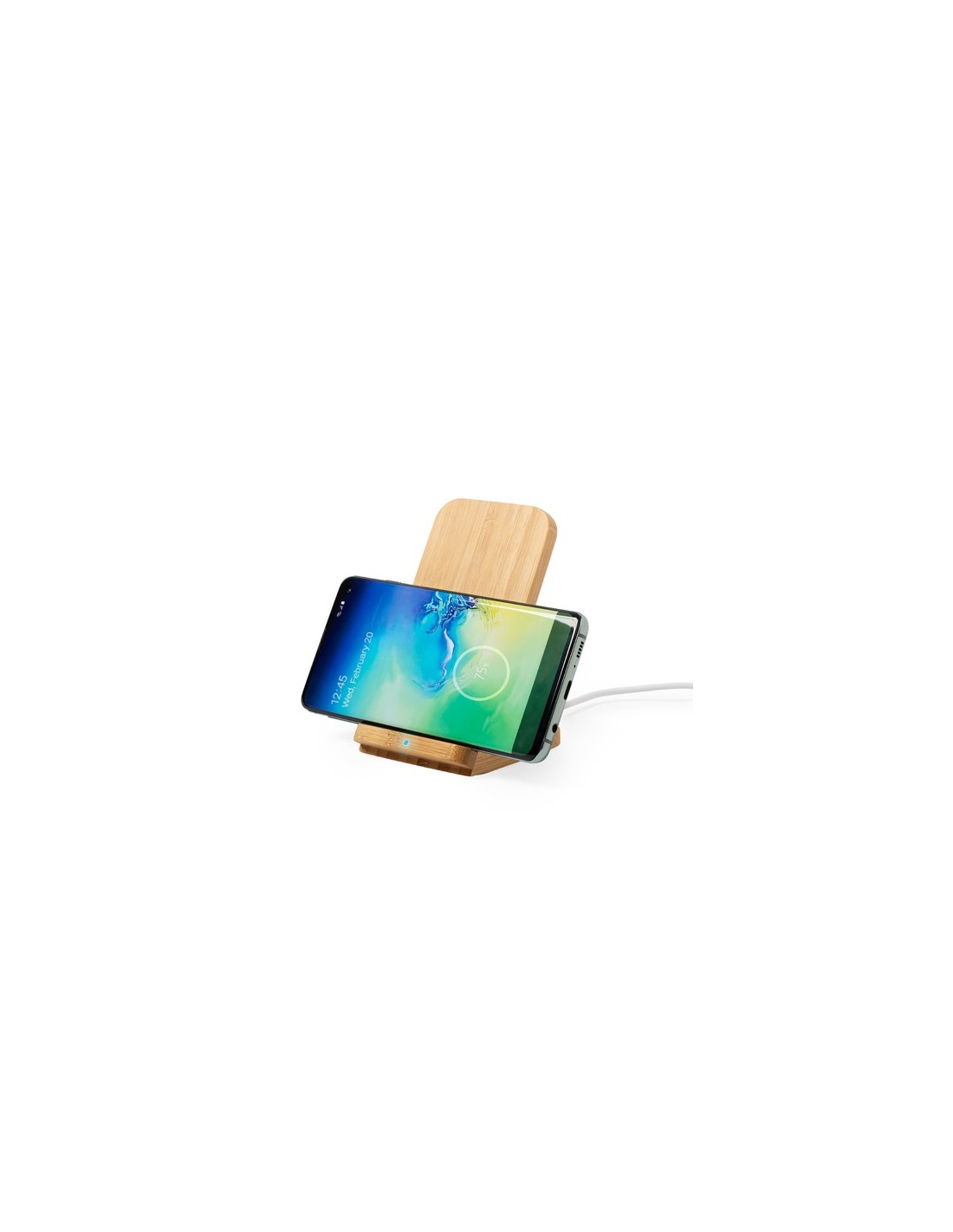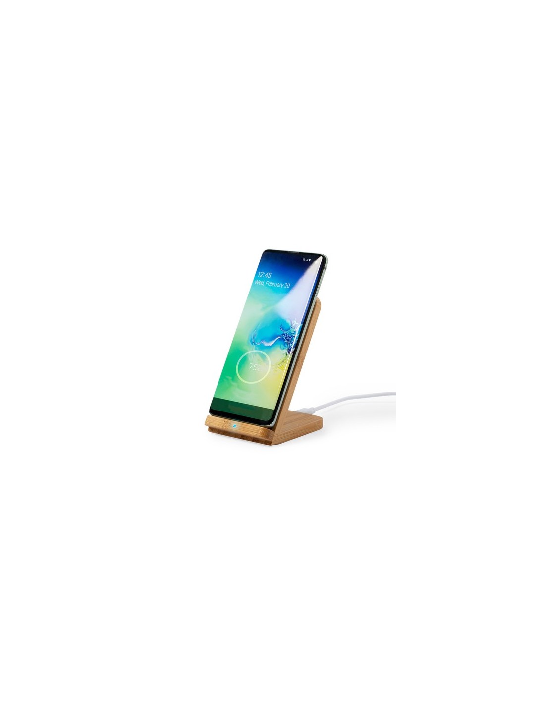 Cargador inalámbrico de línea nature con función soporte para smartphone. Hecho en bambú procedente de cortes naturales. Indicador de estado de carga y compatible con dispositivos equipados con tecnología de carga inalámbrica. Amplia superficie de marcaje y presentado en atractiva caja de diseño eco. Inalámbrico 10W Composition : Bambú.