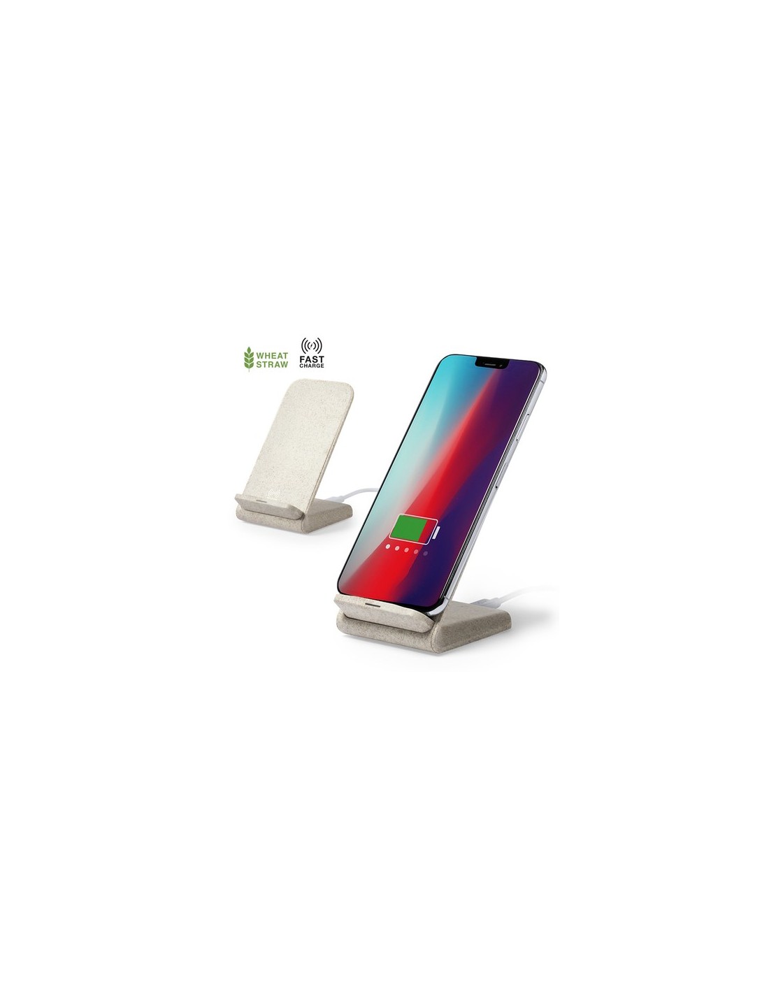 Cargador inalámbrico de línea nature con función soporte para móvil. Carcasa en caña de trigo, para así fomentar la utilización de materias primas naturales y reducir las emisiones contaminantes. Con función carga rápida de 10W y compatible con dispositivos equipados con tecnología de carga inalámbrica. Con luz indicadora de estado de carga y cable de 100 cm. Amplia superficie de marcaje, presentado en atractiva caja de diseño eco. Inalámbrico 10W Composition : Caña de Trigo/ ABS.