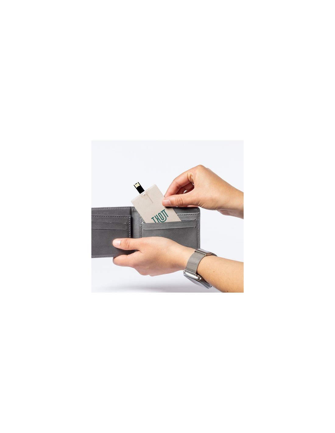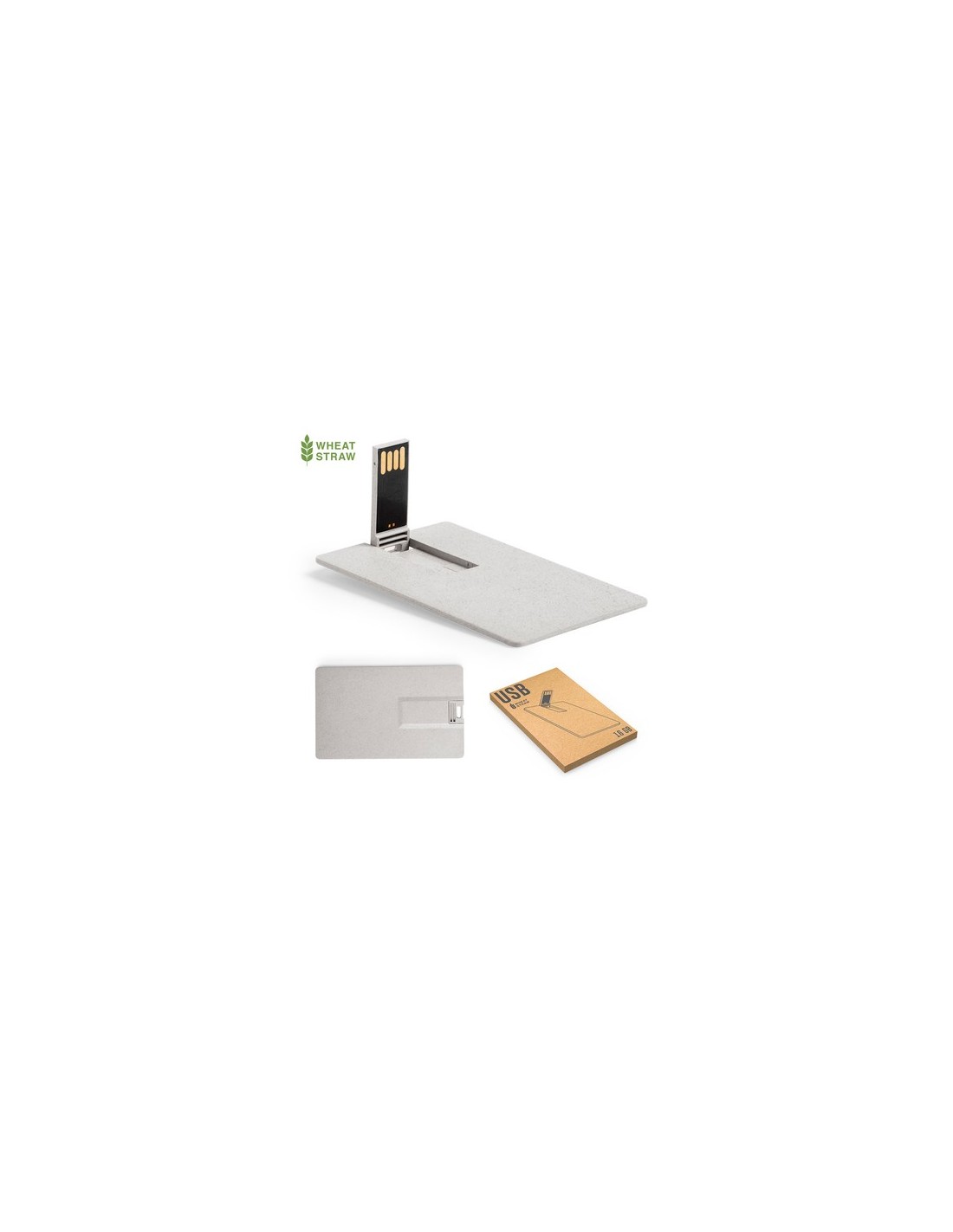 Memoria USB tarjeta de 16GB de capacidad en línea nature. De diseño extra plano en caña de trigo, para así fomentar la utilización de materias primas naturales y reducir las emisiones contaminantes. Con mecanismo plegable y presentada en atractiva caja de diseño eco. Composition : Caña de Trigo/ ABS.