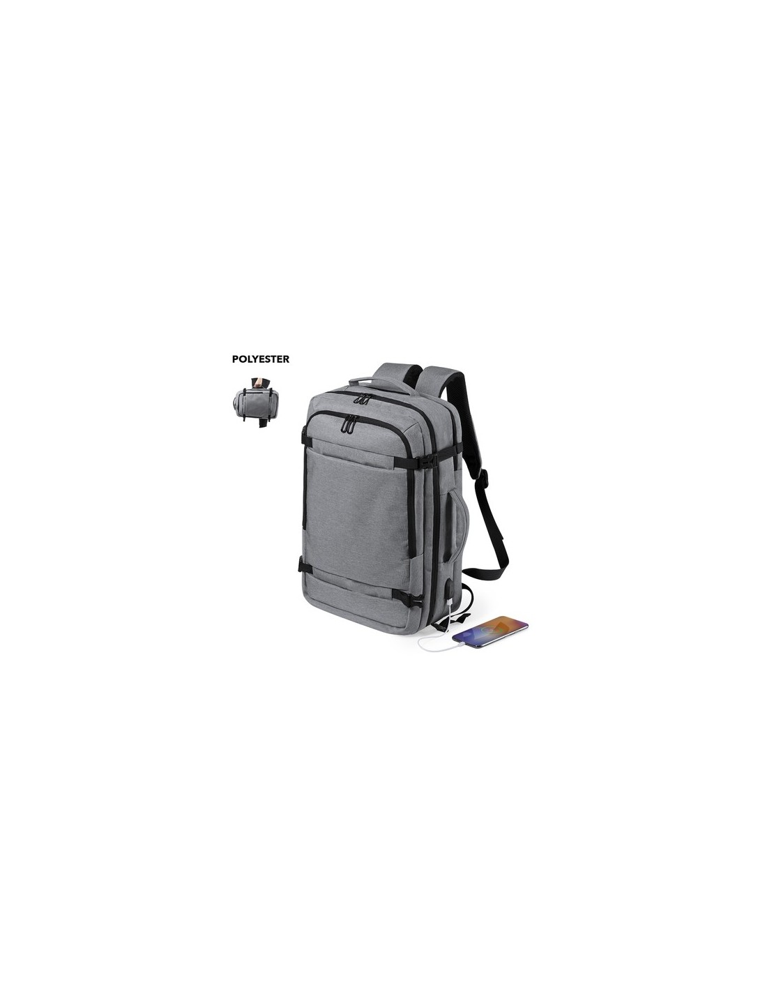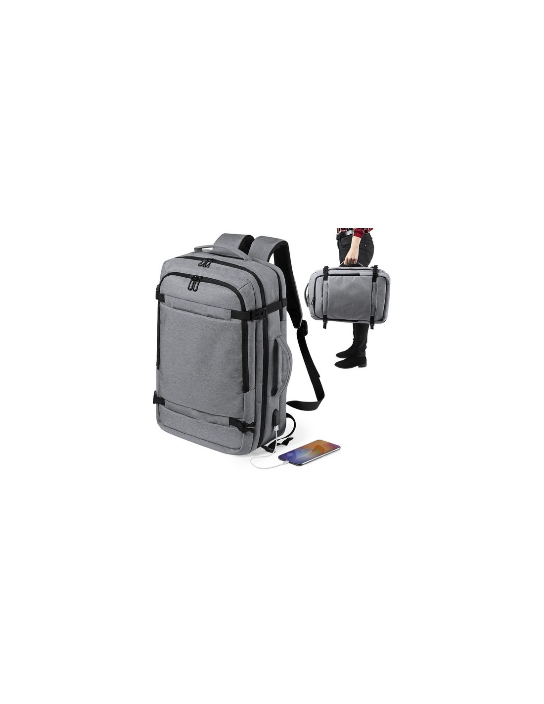 Mochila portadocumentos en resistente poliéster 600D de acabado denim. En diseño urbano, con bolsillo antirrobo, incluye conexión USB para carga de dispositivos móviles (cable incluido, batería auxiliar no incluida) y bolsillo acolchado para portátil de hasta 17 pulgadas. Refuerzos en fuelles con cierre de hebilla de seguridad y compartimentos con cierre de cremallera de doble tirador, con cintas de hombros y espalda acolchadas, de ajuste regulable. Accesorio para ajuste en trolley y bolsillo para ocultar las cintas de la espalda cuando se usa como portadocumentos. Conexión USB. Acolchada. Bolsillo Acolchado para Portátil Composition : Poliéster 600D.