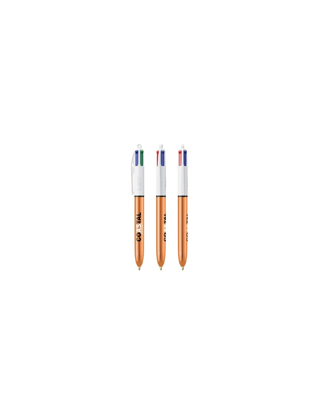 El icónico BIC® 4 Colours presentado en colores metálicos brillantes. Cuenta con 4 colores de tinta estándar: azul, negro, rojo y verde. Nuestro icónico BIC® 4 Colores® es cada vez más sostenible ¡Ahora con un 13% menos de plástico en la parte superior! Tenga en cuenta que a partir de Junio de 2023 y hasta Junio de 2024 podrá recibir su línea de pedido con el clip estándar o el nuevo clip con menos plástico. ¡4 bolígrafos en 1! Gran área de impresión, casi 360º. Mecanismo de retracción confiable: los cartuchos no bloquean. Fabricación completa interna. La pelota de carburo de tungsteno perfectamente esférica contribuye a una escritura constante. Tinta de larga duración: alta calidad, secado rápido y escritura suave. Diseño icónico con más de 45 años estableciendo la tendencia en los instrumentos de escritura. Materiales : Plástico. Precio incluido marcado.