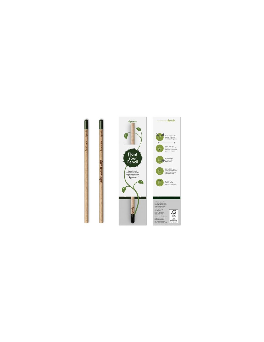 Usa tu lápiz, luego plántalo y lo verás crecer. El lápiz Sprout™ está hecho de madera procedente de bosques sostenibles y no contiene plomo. El lápiz incluye la impresión en grabado láser. De manera opcional, puede incluir un cartón personalizable (FSC) con las instrucciones de plantado (consultar precio). Elige entre 9 semillas diferentes: Abeto; Girasol; Margarita; Nomeolvides; Albahaca; Tomillo; Salvia; Fresa; Tomate cherry. Materiales : Madera, Papel. Precio incluido marcado.