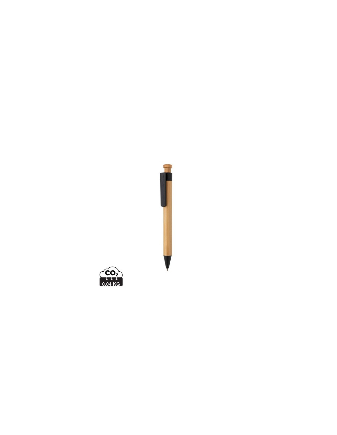 Este hermoso bolígrafo es ideal para apuntar notas e ideas en tus reuniones. Guárdalo en tu bolso o cuaderno para asegurarte de que cada pensamiento esté escrito. Hecho con bambú y paja de trigo. La composición del clip es 40% de trigo y 60% de ABS. Material : Bambú, Paja de trigo Recycled Content Percent : 0 Conforme directiva PCP content 1999/51/EC, Conforme directiva SVHC 1907/2006/EC Packaging : Polybag y a granel All print codes : Pad Print Low,CO2 Engraving 1 - Print code default : Tampografía - al lado del clip - 65 x 6 mm - max color : 5 Social Audits : BSCI Total CO2 emissions : 0,04.