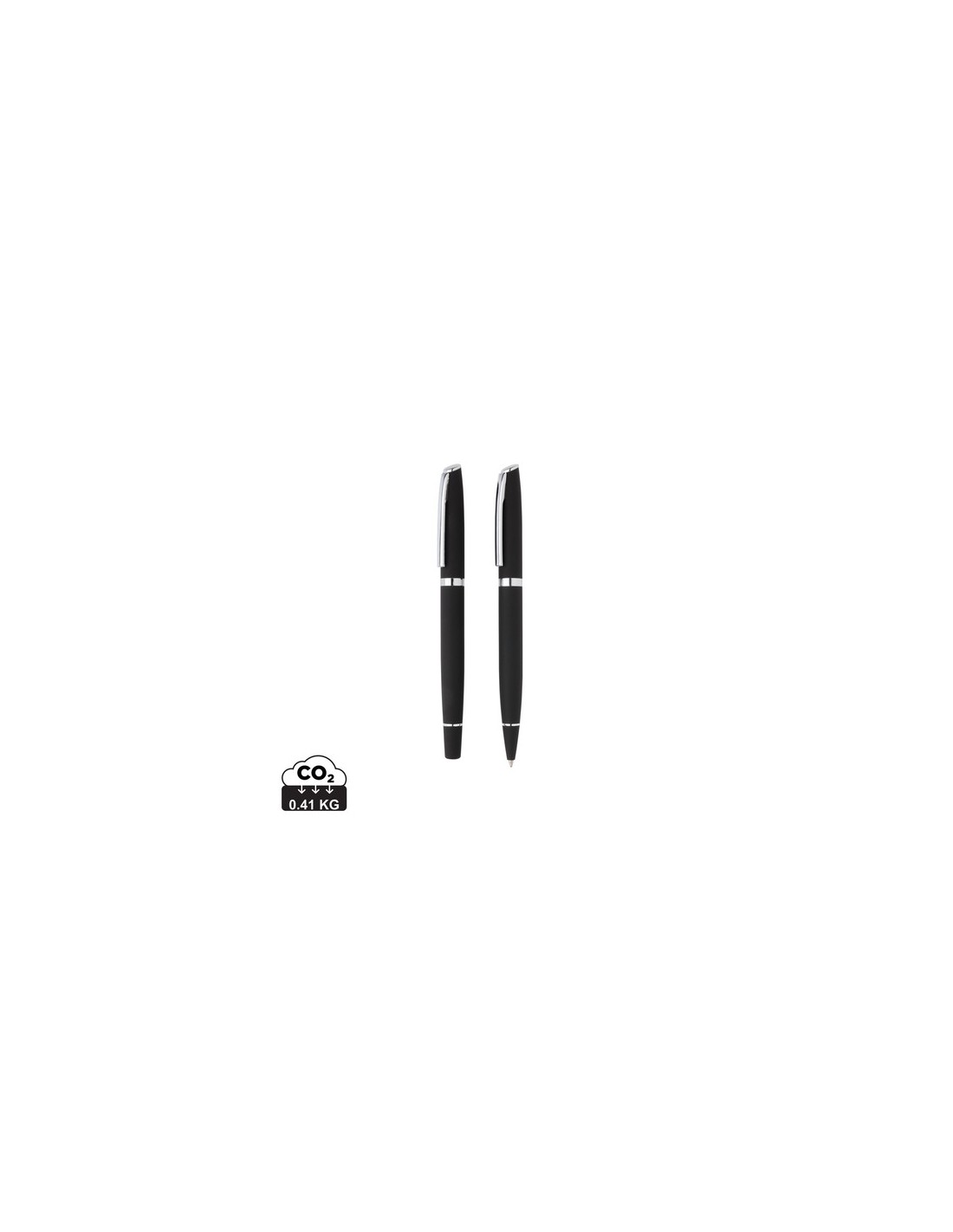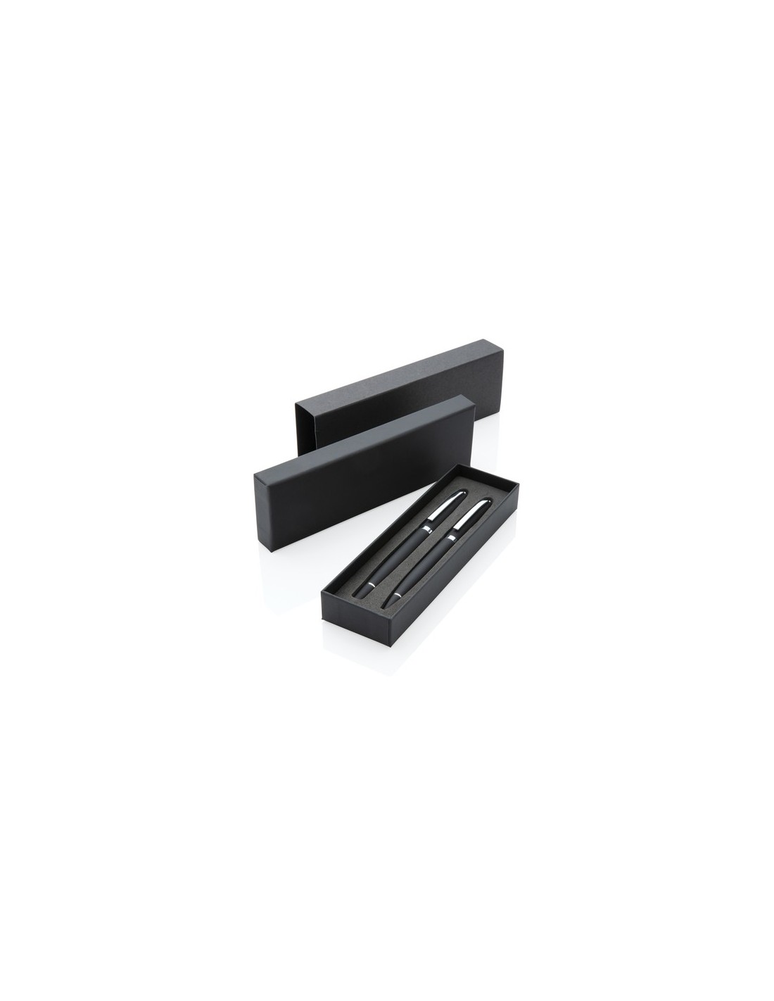 Simple pero elegante. Gracias al acabado mate, este juego de bolígrafos tiene una sensación de lujo y es muy agradable al tacto. El conjunto consta de un bolígrafo y un roller. Ambos contienen tinta alemana Dokumental® para una escritura ultra suave. La longitud de escritura para el bolígrafo es de 1200 metros, para el roller es de 400 metros. Viene en una caja de regalo de color a juego. Material : Aluminio, Hierro Recycled Content Percent : 0 Conforme contenido de plomo U.S, Conforme PAHS content in Reach & ZEK 01-4-08, Conforme directiva Phtalate content, Libre de parafinas cloradas de cadena corta y media., Conforme directiva Cadmio 91/338/EC Packaging : Caja de regalo All print codes : Laser Engraving 1,Pad Print - Print code default : Grabado a láser - al lado del clip - 35 x 5 mm - max color : 1 Social Audits : BSCI Total CO2 emissions : 0,41.