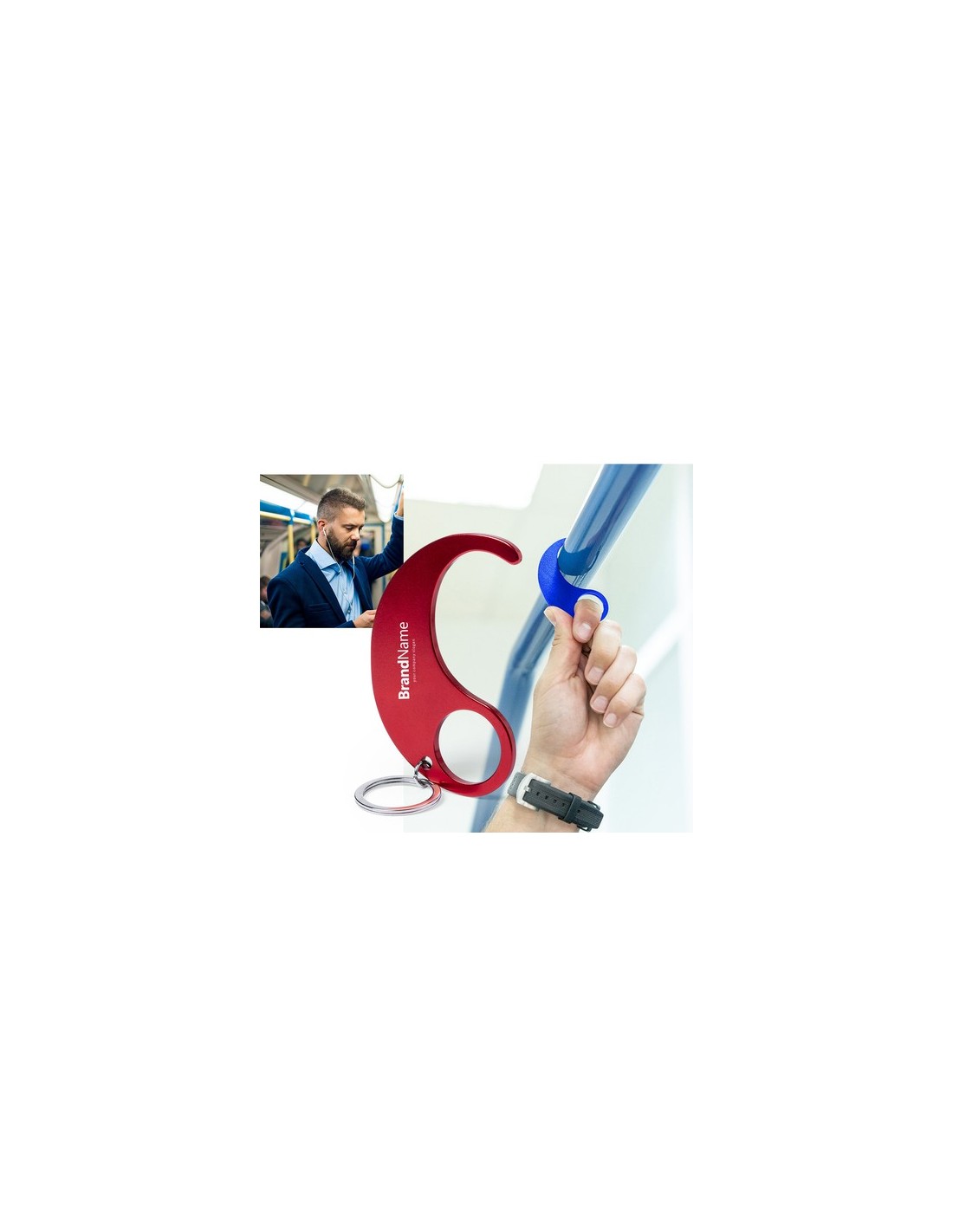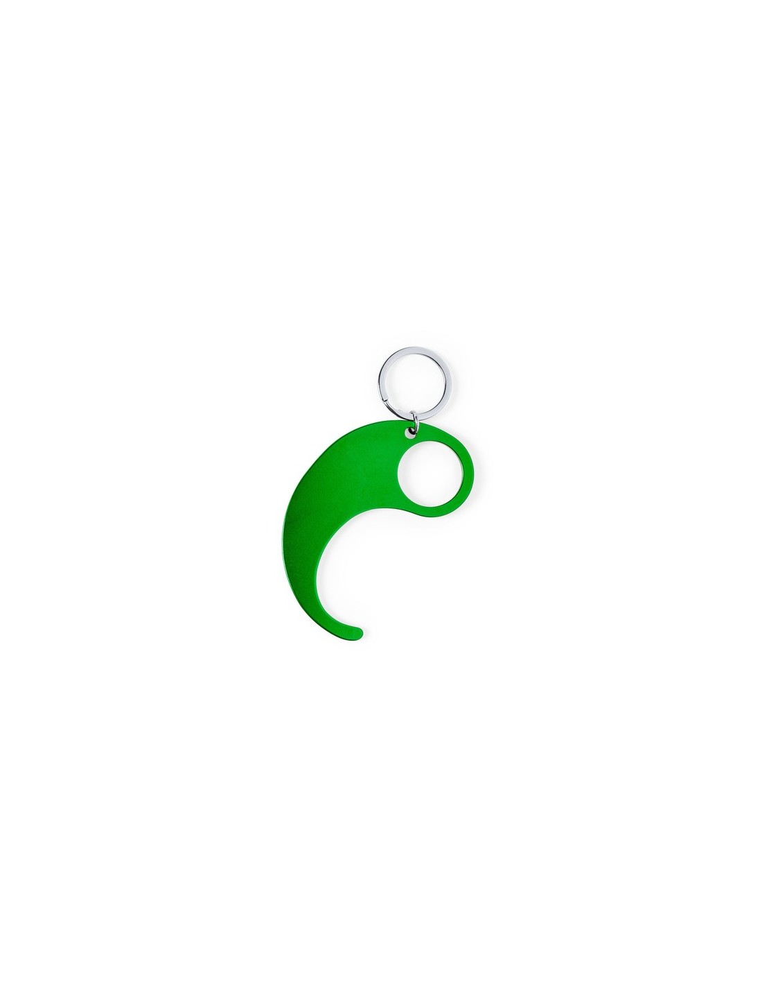 Llavero higiénico anti-contacto, fabricado en resistente Aluminio. El único llavero diseñado especialmente para uso en transporte público y evitar tocar con las manos superficies de uso común (picaportes de puertas, interruptores, grifos de uso público, cajeros automáticos...). Dispone de amplia zona de marcaje y cómodo troquel para el dedo. Acabado en aluminio en vivos y variados colores. Presentado en bolsita de diseño individual. Composition : Aluminio.