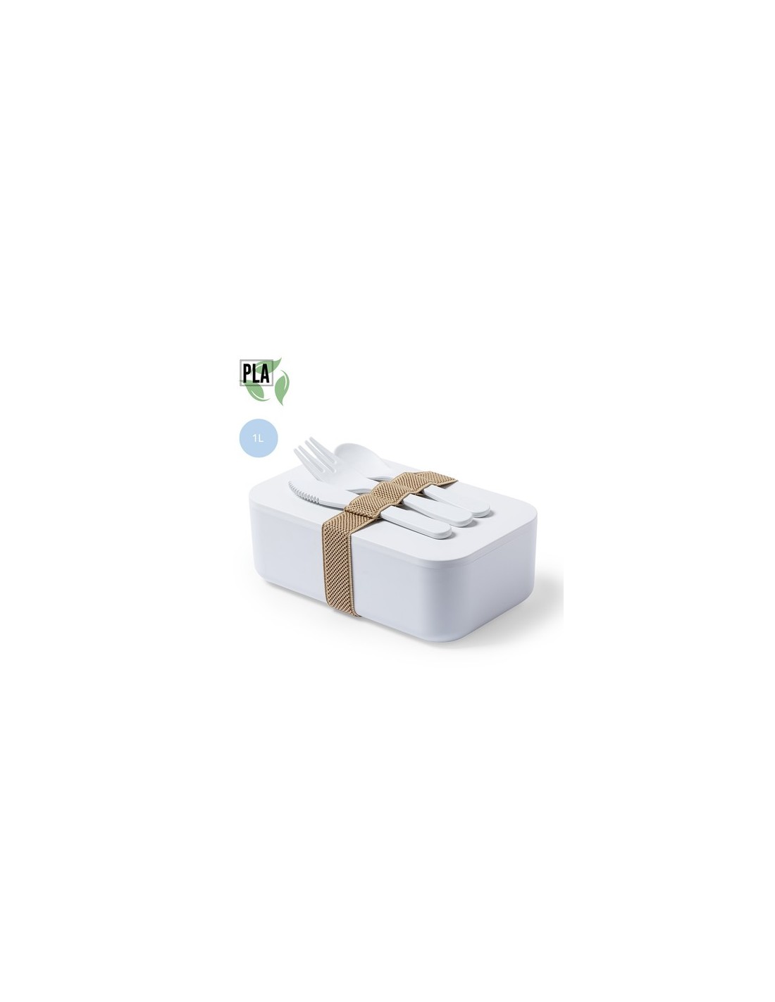 Fiambrera de línea nature, fabricada en PLA 100% compostable libre de BPA. De 1L de capacidad, incluye cinta de seguridad con tenedor, cuchara y cuchillo. Presentada en bolsa individual. Producto fabricado con material PLA, procedente de materias primas renovables, con importantes propiedades como la versatilidad y la resistencia, destacando entre todas ellas la de compostabilidad. 1 L Composition : PLA 100% Compostable.
