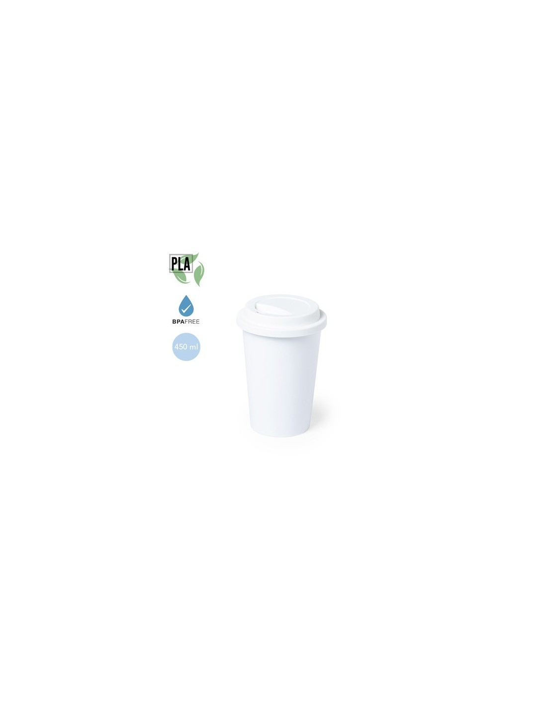 Vaso de linea nature, fabricado en PLA 100% compostable. 450ml de capacidad, de acabado sólido y con tapa dosificador de seguridad en mismo material, libre de BPA. Producto fabricado con material PLA, procedente de materias primas renovables, con importantes propiedades como la versatilidad y la resistencia, destacando entre todas ellas la de compostabilidad. 450 ml Composition : PLA 100% Compostable.