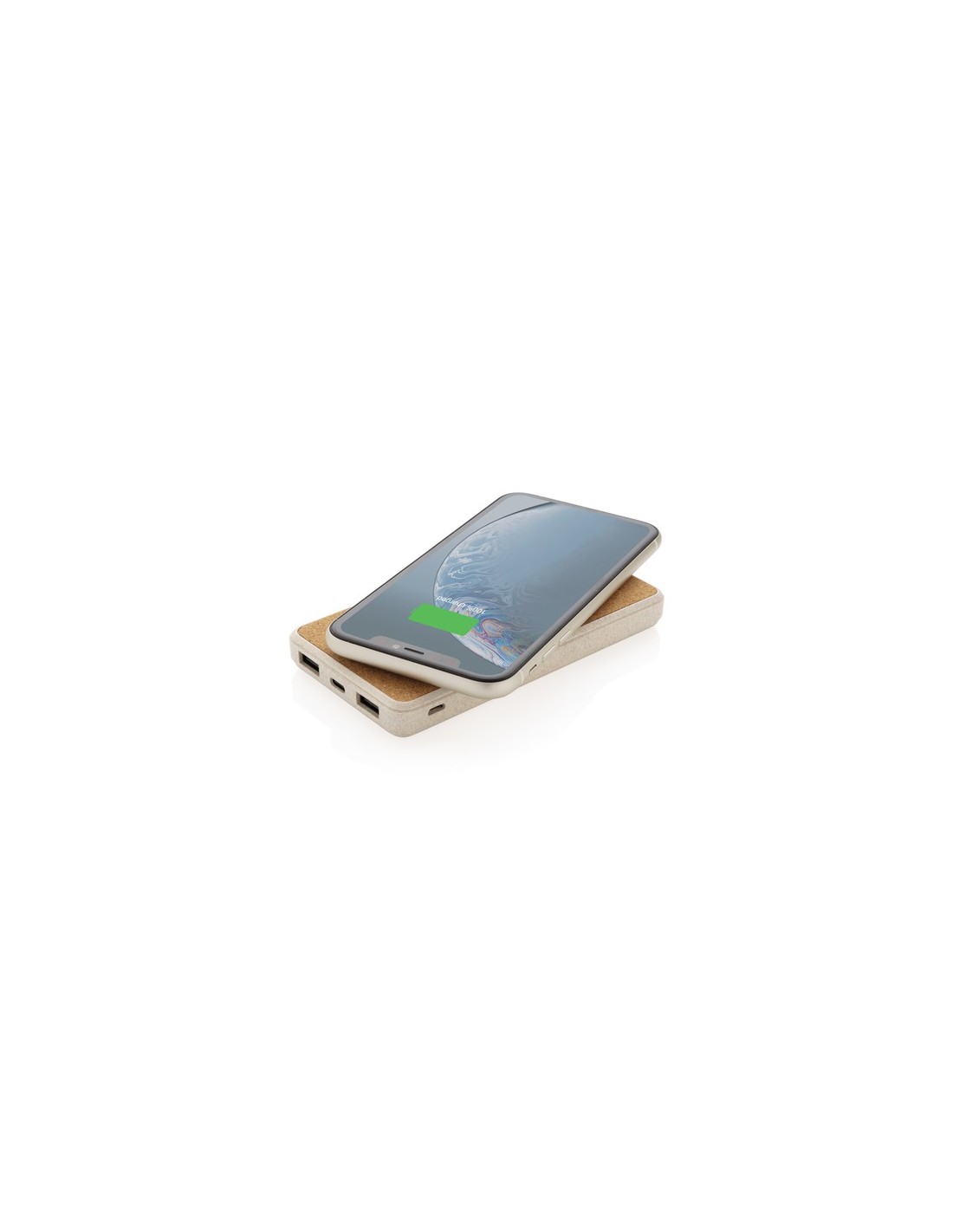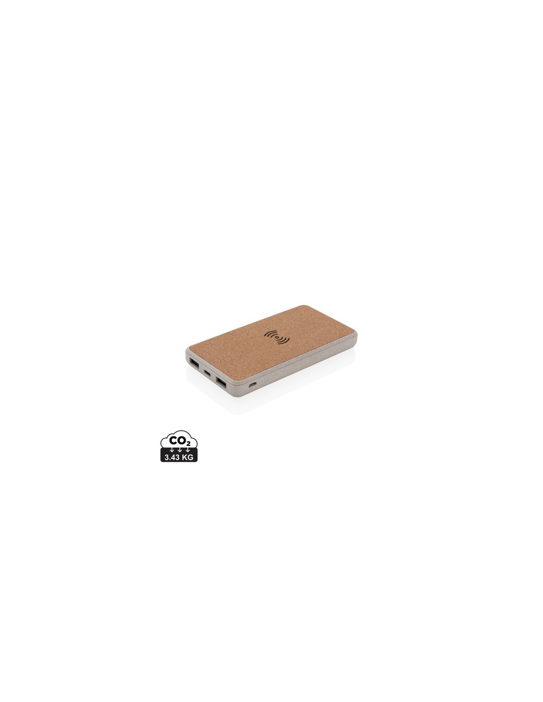 Powerbank inalámbrico de 8000 mah con cargador inalámbrico de 5W en la parte superior. La parte superior está hecha de corcho natural y el núcleo está hecho de 35% de paja de trigo mezclado con ABS. Entrada opcional tanto a través de micro USB como tipo C. Cuando esté completamente cargada te proporcionará la energía suficiente para recargar tu teléfono móvil hasta cuatro veces. El powerbank contiene una batería de polímero de litio de grado A de 8.000 mAh de larga duración. Los indicadores de energía indicarán el nivel de energía restante para que siempre sepas cuándo recargar. Carga inalámbrica compatible con todos los dispositivos habilitados para QI como Android de última generación, iPhone 8, 8S y X. Entrada micro 5V/2A Entrada tipo C 5V/2A Salida USB 5V/2.1A. Salida inalámbrica 5W 5V/1A. Artículo y accesorios 100% libre de PVC. Material : Corcho, Paja de trigo Recycled Content Percent : 0 Conforme directiva bateria 2006/66EC, Conforme directiva equipamientos Radio y Telecomunicaciones 2014/53/EU, Conforme directiva de sustancias peligrosas 2011/65/EC & 2015/863, Hoja de datos de seguridad del material disponible, Conforme PAHS content in Reach & ZEK 01-4-08, Conforme directiva Phtalate content, Conforme directiva Battery transportation safety UN38.3, Detección de objetos extraños, Certificado para transporte aéreo, Libre de parafinas cloradas de cadena corta y media., Una corriente en reposo máxima de 0,3 W cuando no se utiliza, Componentes duraderos y de alta calidad, Control de temperatura, Protección contra cortocircuito, Protección contra sobrecorriente, Conforme directiva seguridad baterias Alcalinas EN62133, Protección contra sobrecarga WEEE Battery : 1 Li-poli - 117,7 g. Packaging : Bolsa de plástico y caja individual All print codes : CO2 Engraving 2,Pad Print,Digital Print 2 - Print code default : Grabado CO2 - parte frontal y baja del artículo - 55 x 45 mm - max color : 1 Social Audits : BSCI Total CO2 emissions : 3,43.