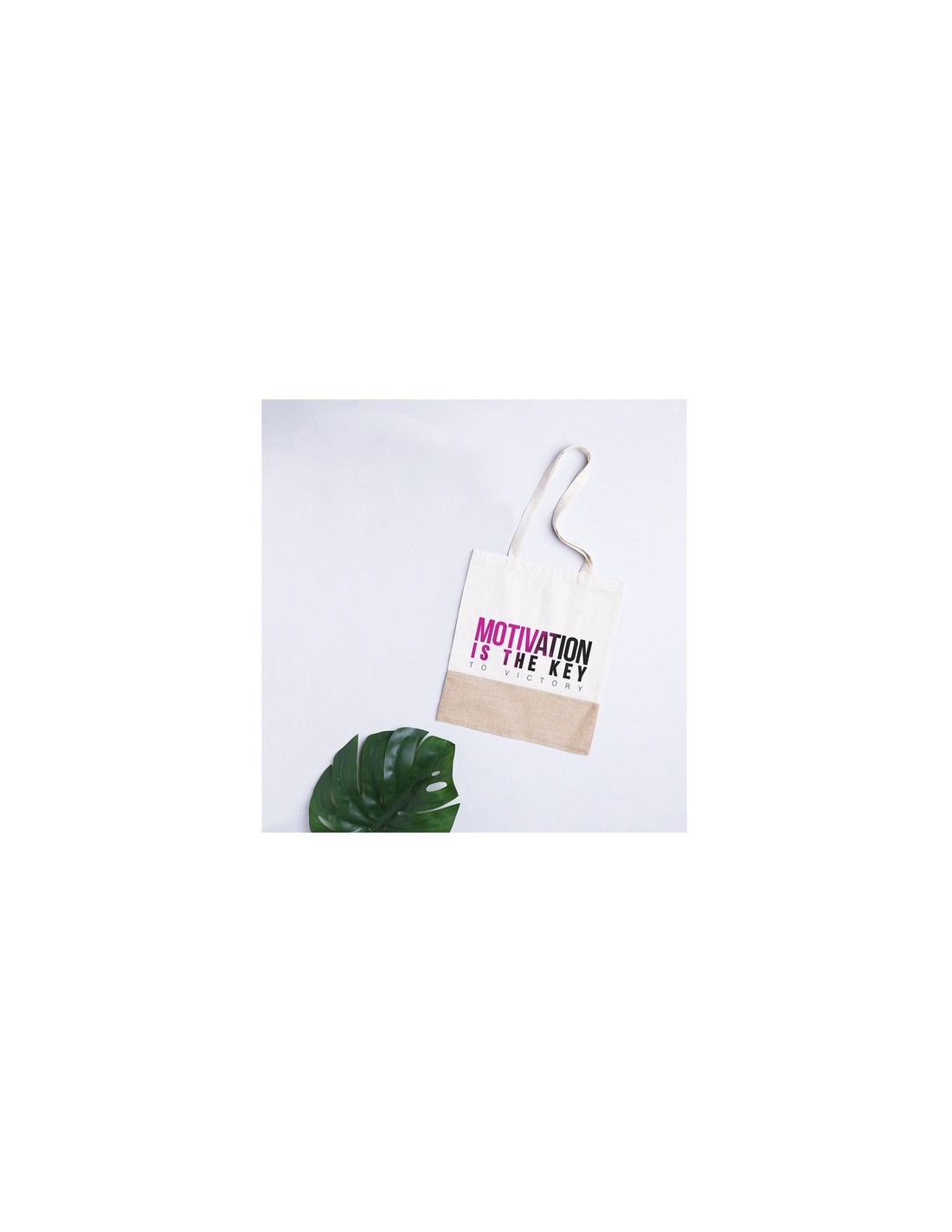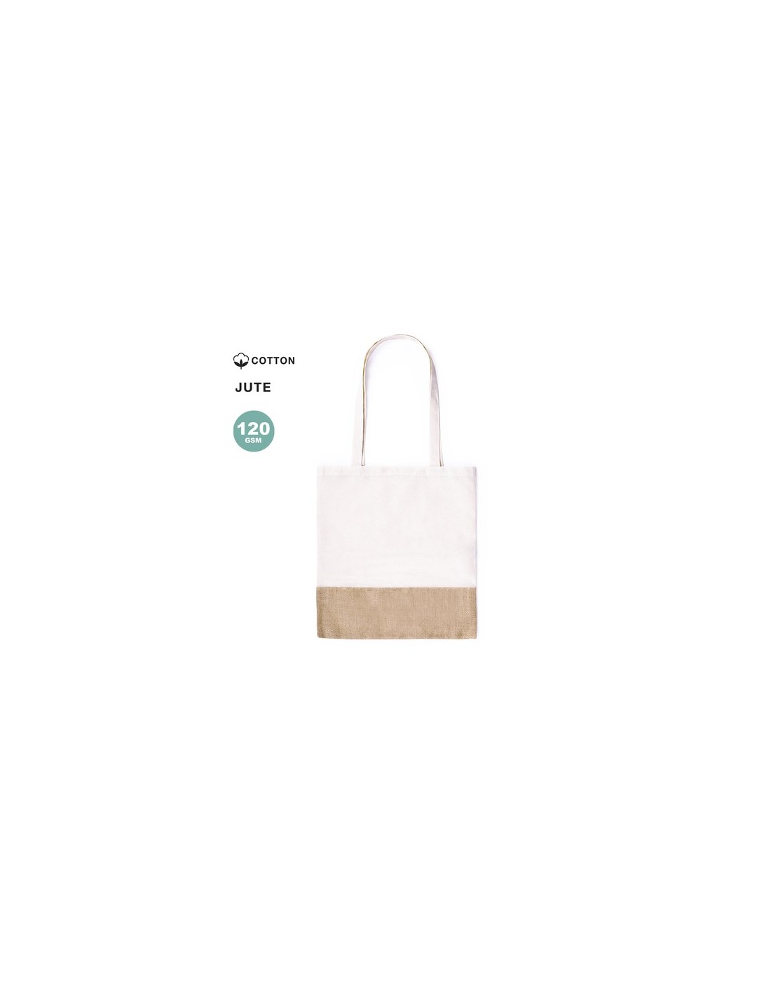 Bolsa ecológica en resistente combinación de materiales naturales -yute y algodón- de 245g/m2. Con atractivo diseño bicolor y acabado cosido. Asas largas de 70 cm reforzadas y resistencia hasta 8kg de peso. Composition : 100% Algodón 120 g/ m2/ Yute.