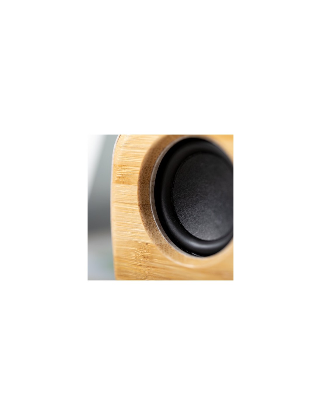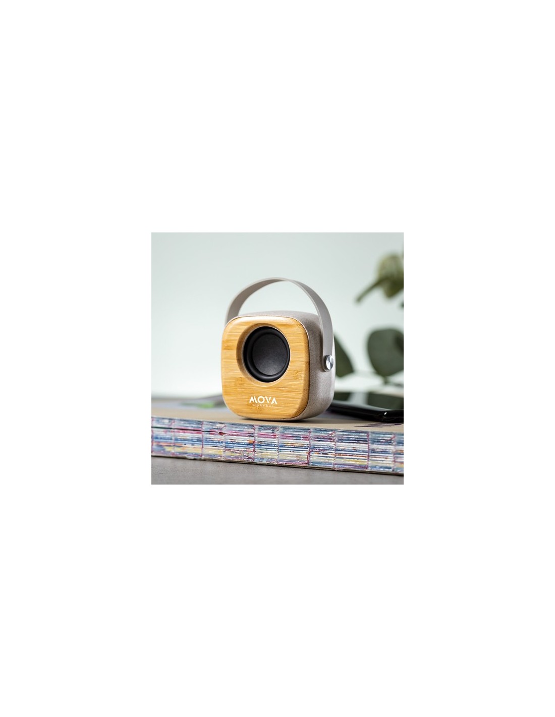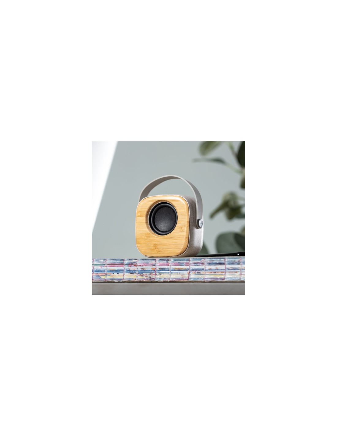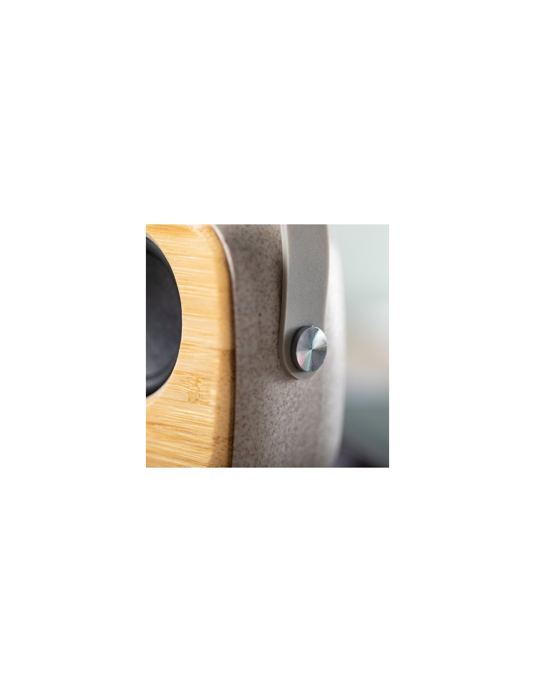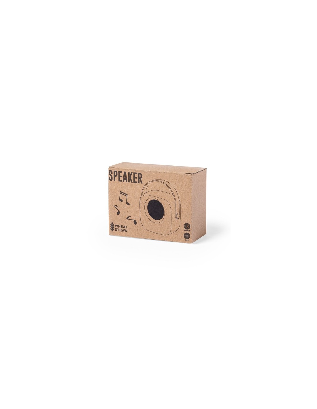 Altavoz Bluetooth en combinación de piezas de bambú de corte nature y carcasa en caña de trigo, para así fomentar la utilización de materias primas naturales y reducir las emisiones contaminantes. De tamaño compacto y con práctica asa de transporte en suave silicona, se convierte en un complemento perfecto para el smartphone. Conexión Bluetooth 5.0 y 3W de potencia, con entrada de línea jack 3,5mm (cable incluido). Compatible con iOS y Android, incluye cable de carga micro USB y viene presentado en atractiva caja de diseño. Disponible manual de instrucciones español e inglés. Conexión Bluetooth. Potencia Sonido 3W. Batería 500 mAh Composition : Caña de Trigo/ ABS/ Bambú.