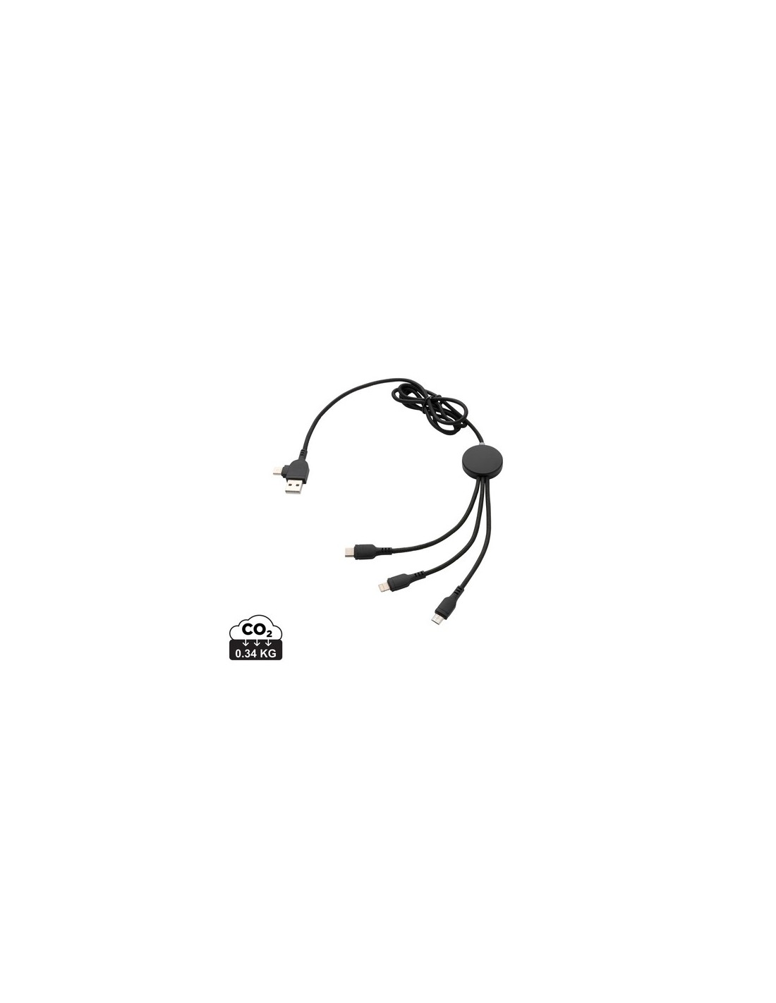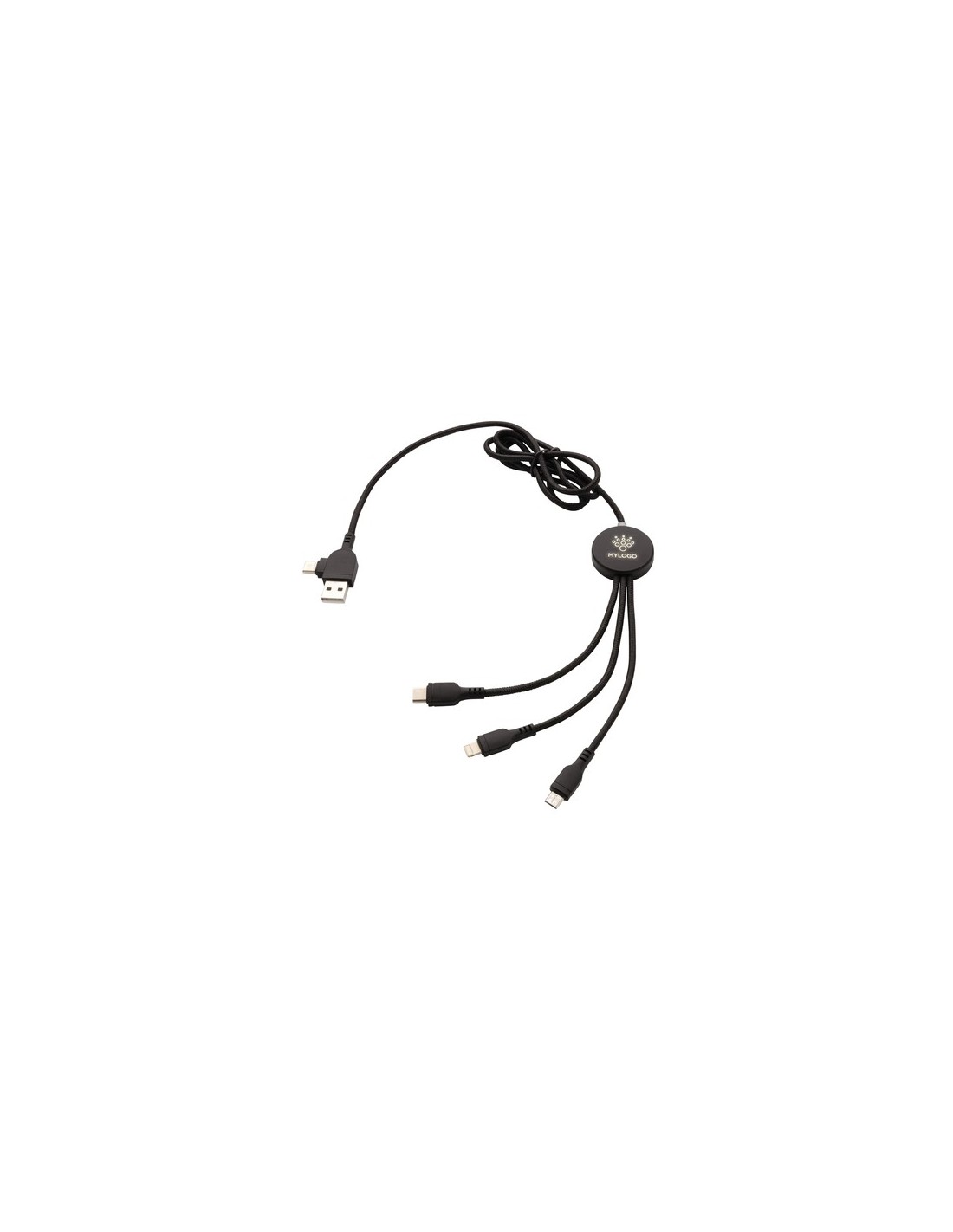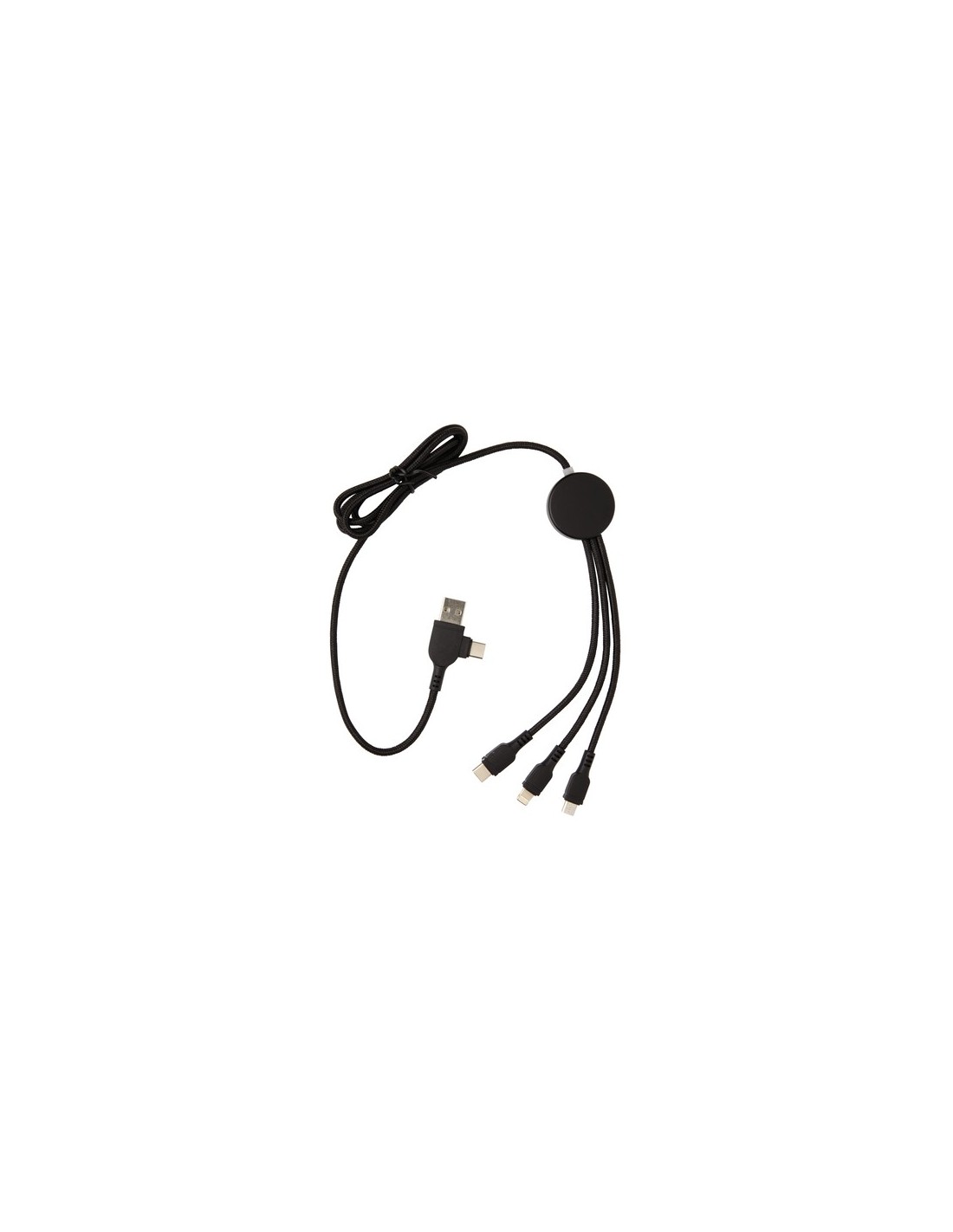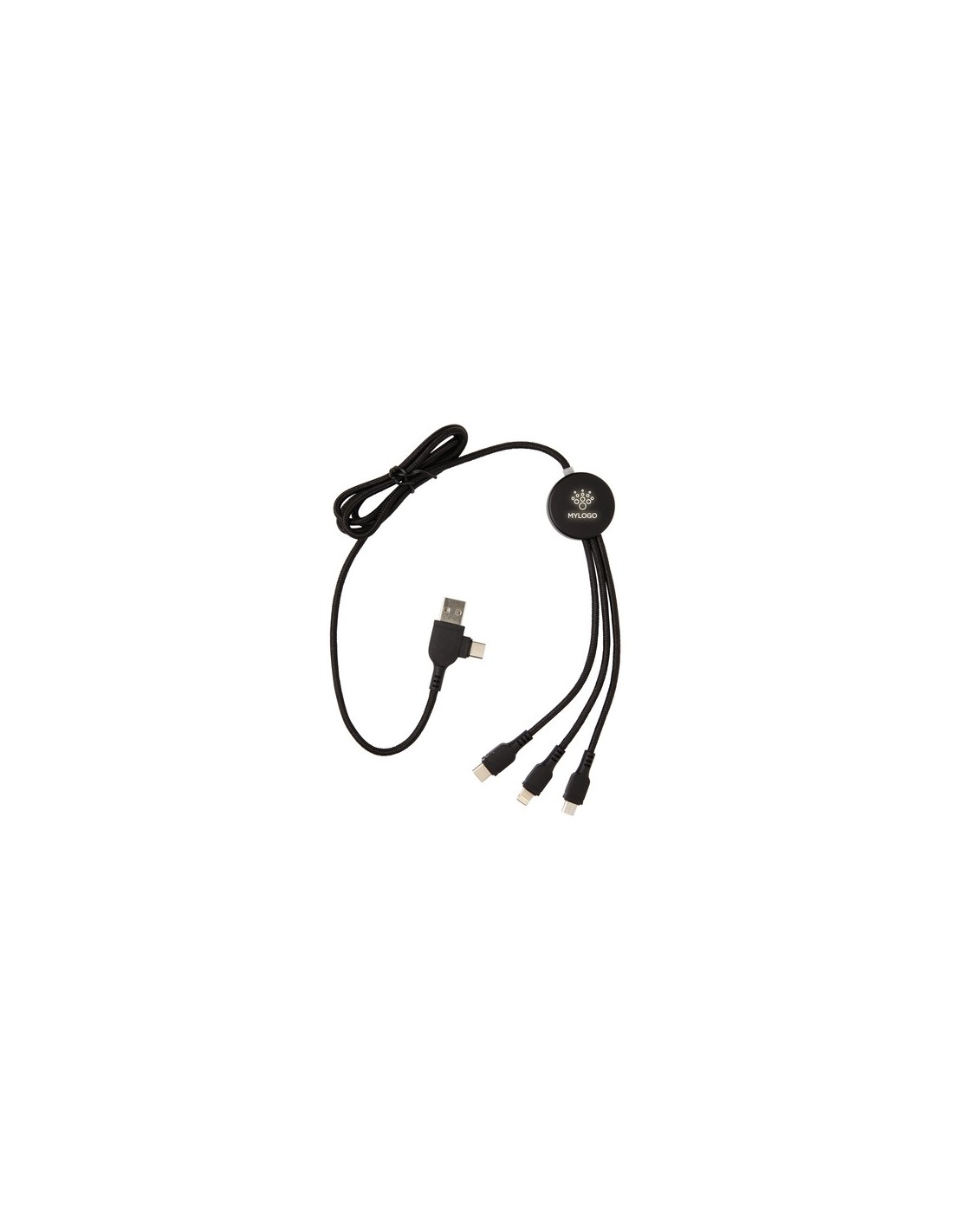 Multicable de nailon trenzado con 5 conectores diferentes: entrada USB C, entrada USB A, salida tipo C, salida IOS y salida micro USB. Esto te permite usar el cable también con dispositivos de salida tipo C que se incluyen en la nueva generación de teléfonos y ordenadores macbook. El cable también tiene una opción de entrada y salida USB A para que puedas cargar cualquier dispositivo desde cualquier fuente de salida. Carcasa de ABS con opción para grabar tu logo que se iluminará cuando se utilice el cable. Sin PVC. Longitud cable 120 cm. Material : ABS, Nailon Recycled Content Percent : 0 Conforme directiva de sustancias peligrosas 2011/65/EC & 2015/863, Conforme PAHS content in Reach & ZEK 01-4-08, Conforme directiva Phtalate content, Libre de parafinas cloradas de cadena corta y media. WEEE Packaging : Polybag y a granel All print codes : Laser Engraving 2,Doming,Pad Print - Print code default : Grabado a láser - parte frontal del artículo - 25 x 25 mm - max color : 1 Social Audits : BSCI Total CO2 emissions : 0,34.