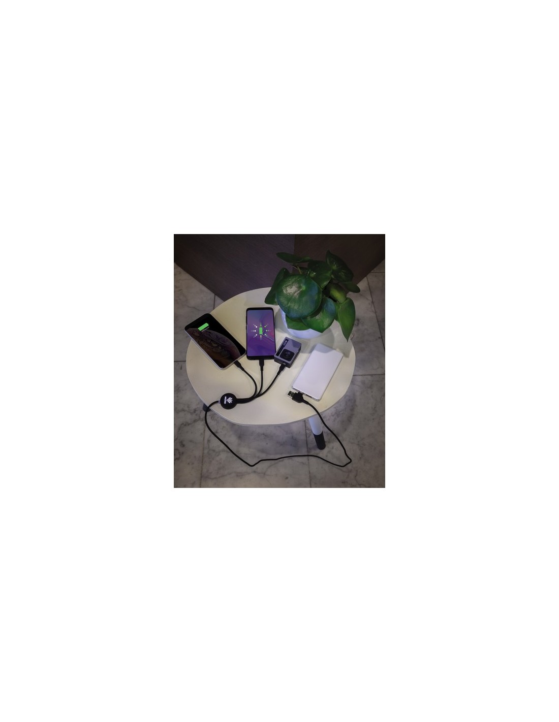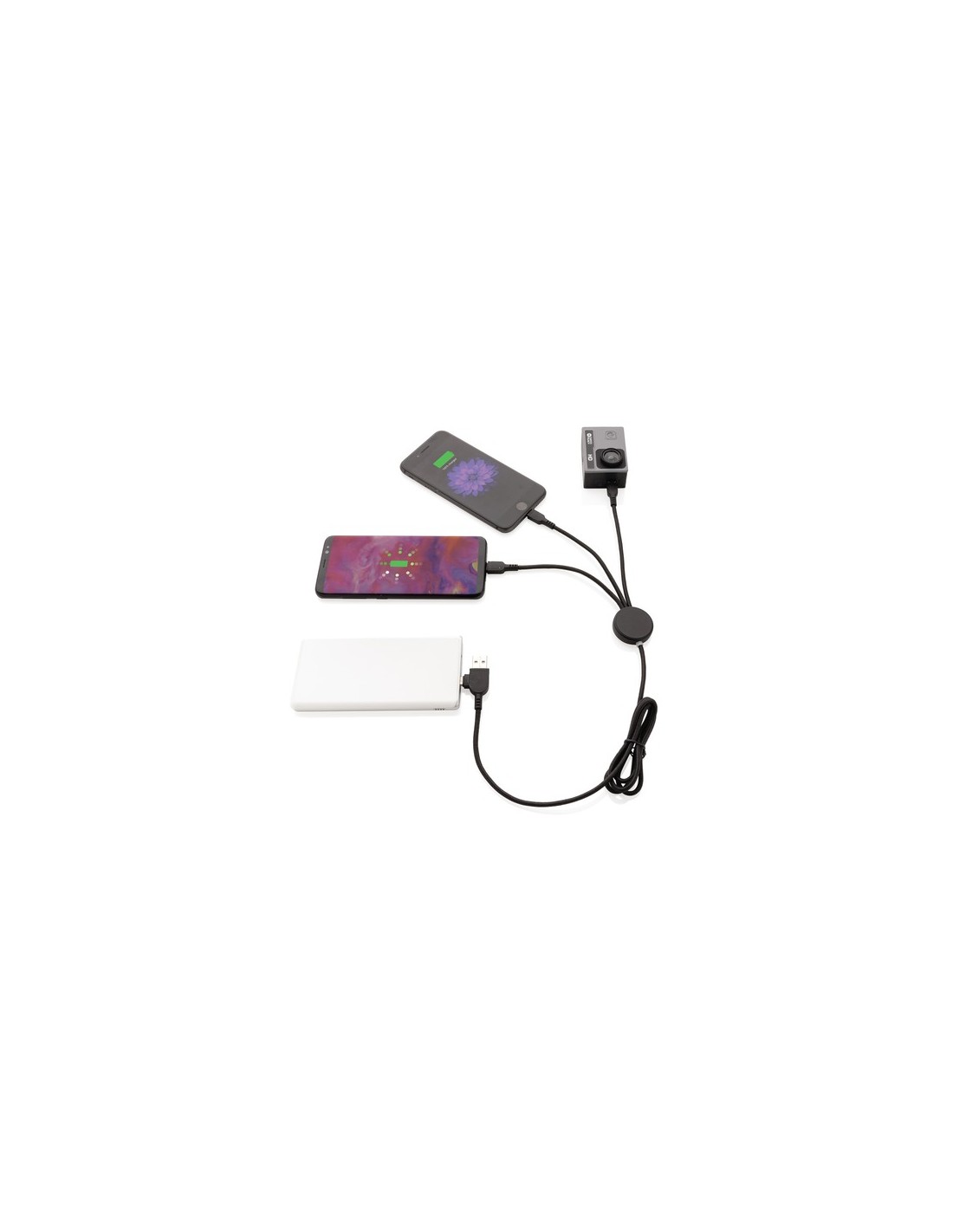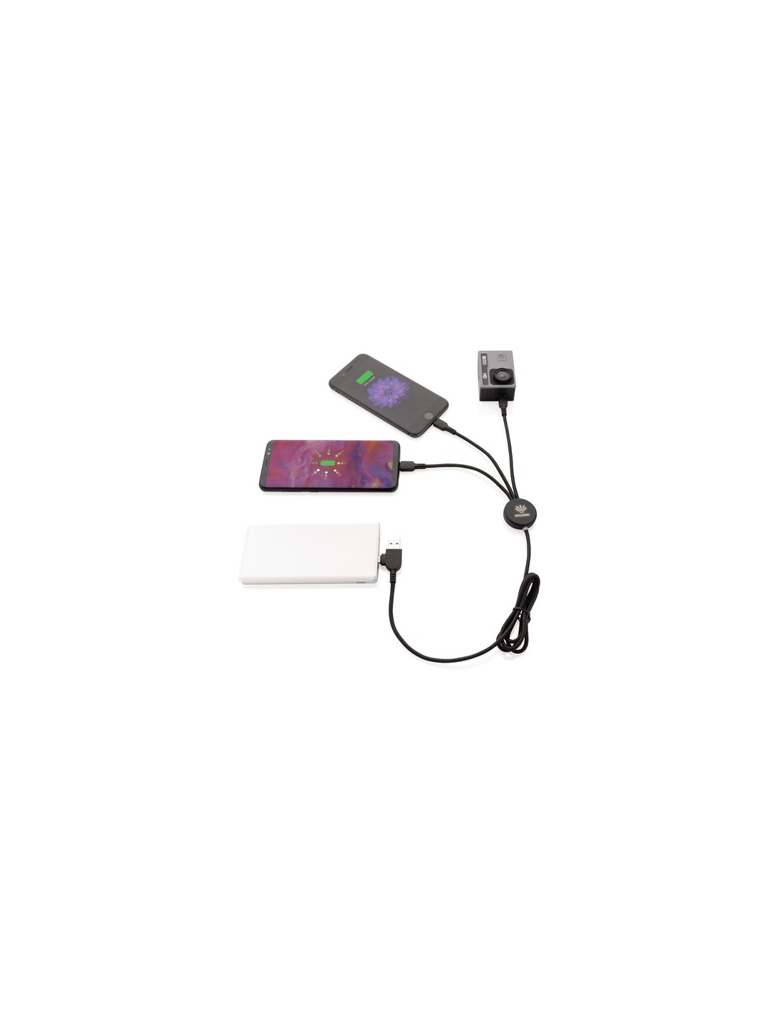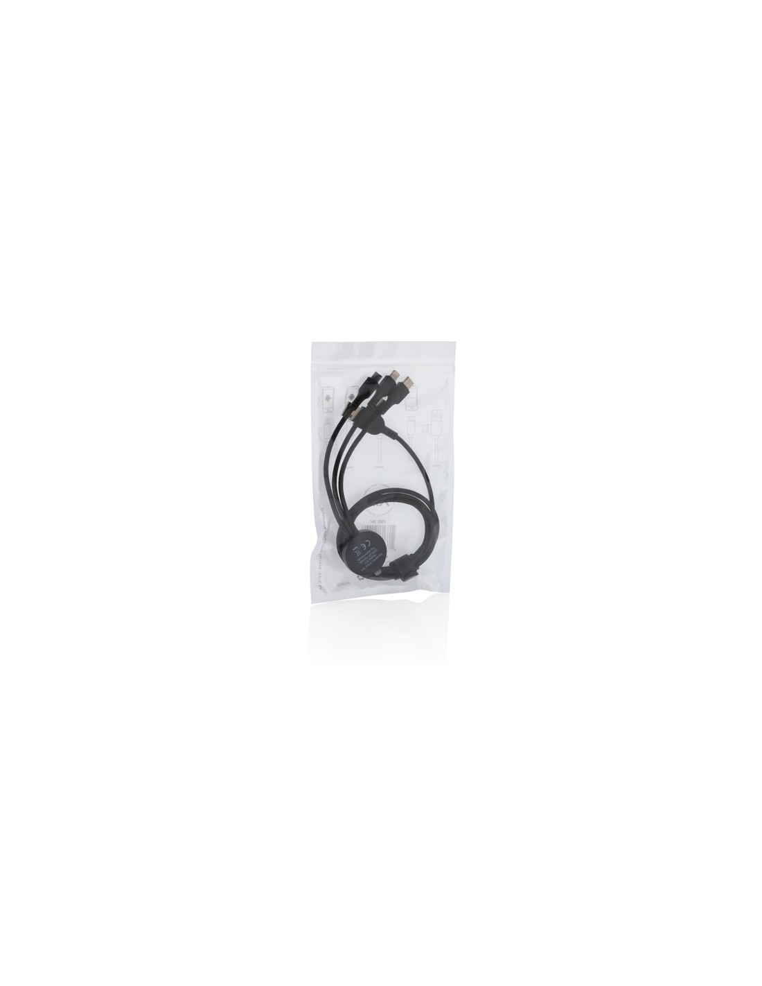 Multicable de nailon trenzado con 5 conectores diferentes: entrada USB C, entrada USB A, salida tipo C, salida IOS y salida micro USB. Esto te permite usar el cable también con dispositivos de salida tipo C que se incluyen en la nueva generación de teléfonos y ordenadores macbook. El cable también tiene una opción de entrada y salida USB A para que puedas cargar cualquier dispositivo desde cualquier fuente de salida. Carcasa de ABS con opción para grabar tu logo que se iluminará cuando se utilice el cable. Sin PVC. Longitud cable 120 cm. Material : ABS, Nailon Recycled Content Percent : 0 Conforme directiva de sustancias peligrosas 2011/65/EC & 2015/863, Conforme PAHS content in Reach & ZEK 01-4-08, Conforme directiva Phtalate content, Libre de parafinas cloradas de cadena corta y media. WEEE Packaging : Polybag y a granel All print codes : Laser Engraving 2,Doming,Pad Print - Print code default : Grabado a láser - parte frontal del artículo - 25 x 25 mm - max color : 1 Social Audits : BSCI Total CO2 emissions : 0,34.