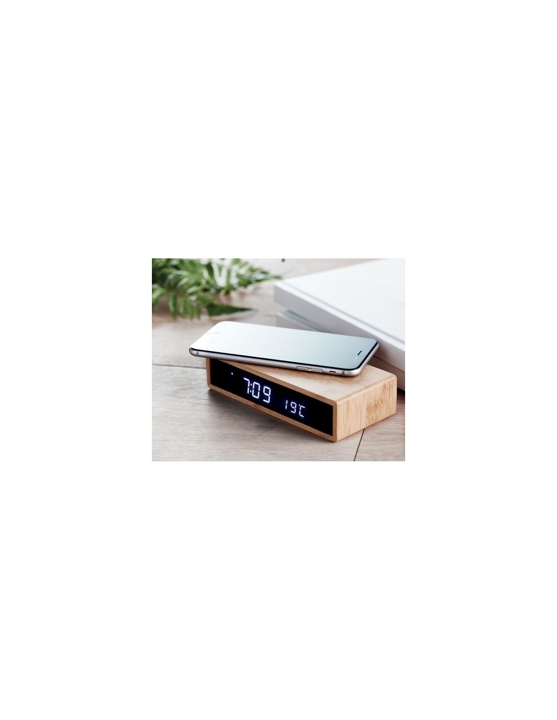 Cargador inalámbrico con carcasa de bambú. Incluye reloj despertador con pantalla LED azul y temperatura. Enchufe adaptador AC-DC. Output inalámbrico: DC5V/1A (5W). Compatible con últimos androids, iPhone® 8, X y más recientes. No apto en Reino Unido. El bambú es material natural, el color del articulo puede variar.