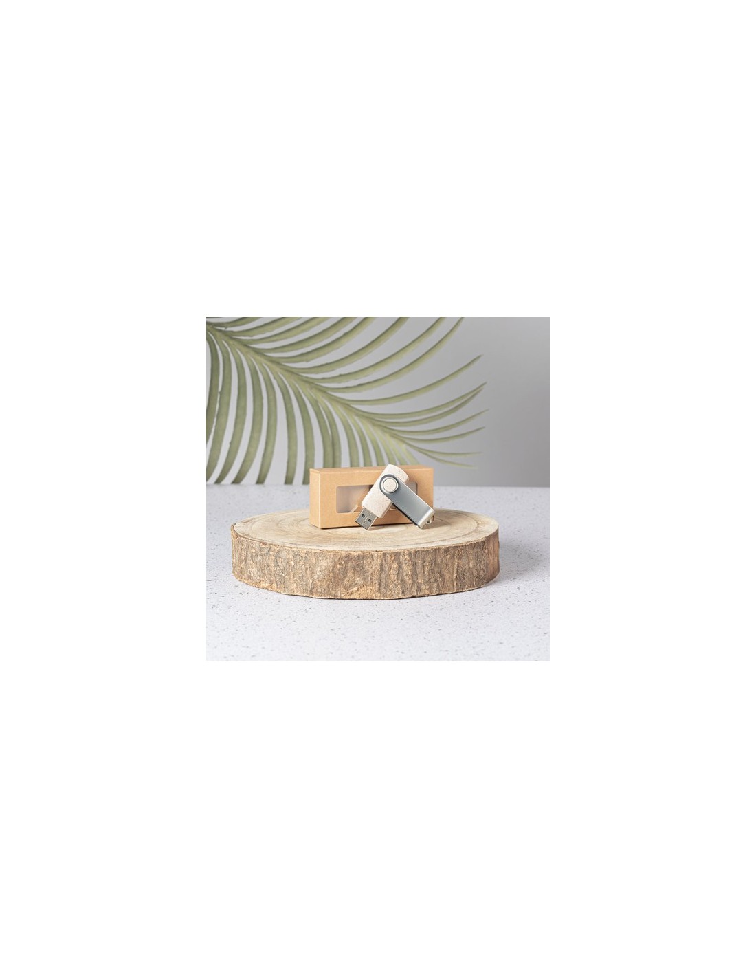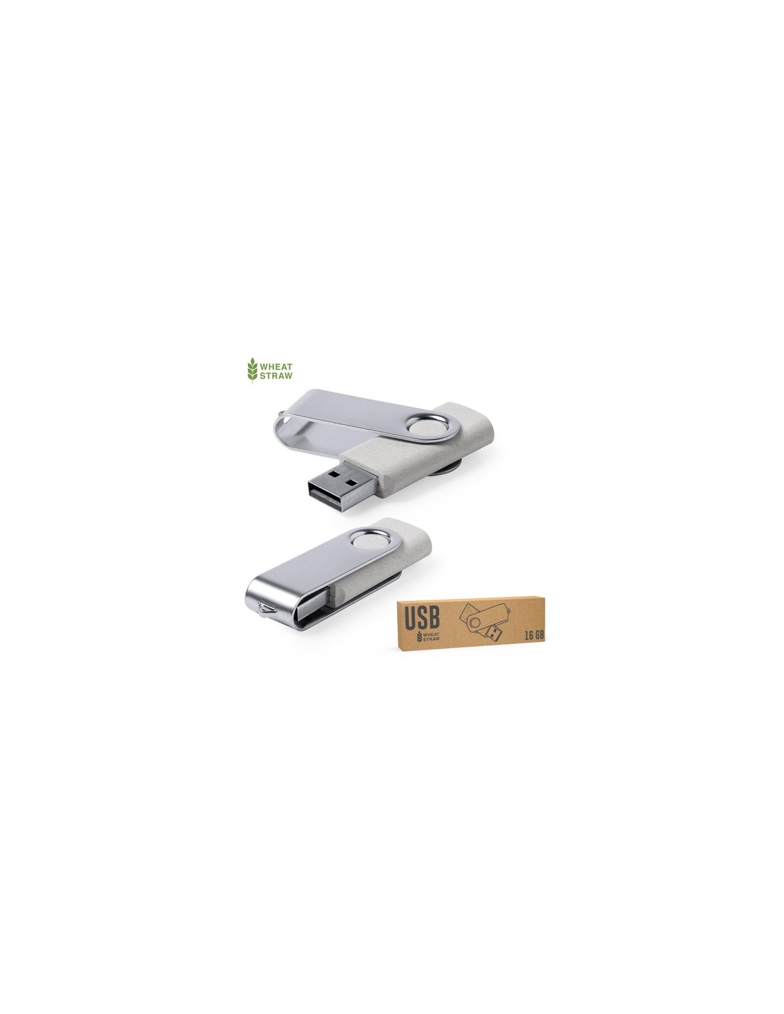 Memoria USB de 16GB de capacidad en línea nature. Cuerpo en caña de trigo, para así fomentar la utilización de materias primas naturales y reducir las emisiones contaminantes y clip metálico de mecanismo giratorio. Presentada en estuche individual de diseño eco. Composition : Caña de Trigo/ ABS.