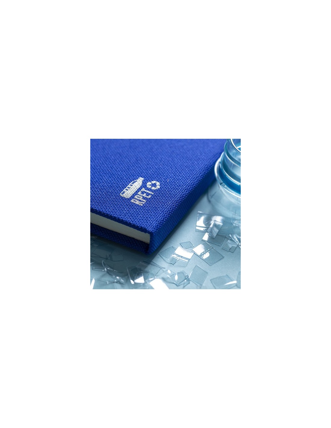 Bloc de notas de línea nature con tapas rígidas en 600D RPET, elaborado a partir de plástico reciclado para así fomentar la reutilización de residuos plásticos y contribuir a la sostenibilidad del planeta. Disponible en amplia gama de colores, incluye 80 hojas con disposición a una raya. Con elástico de sujeción y marcapáginas de tela a juego. Distintivo RPET en parte trasera. Portada Rígida. 80 Hojas Composition : Poliéster 600D RPET.