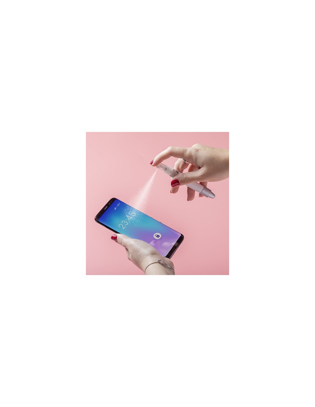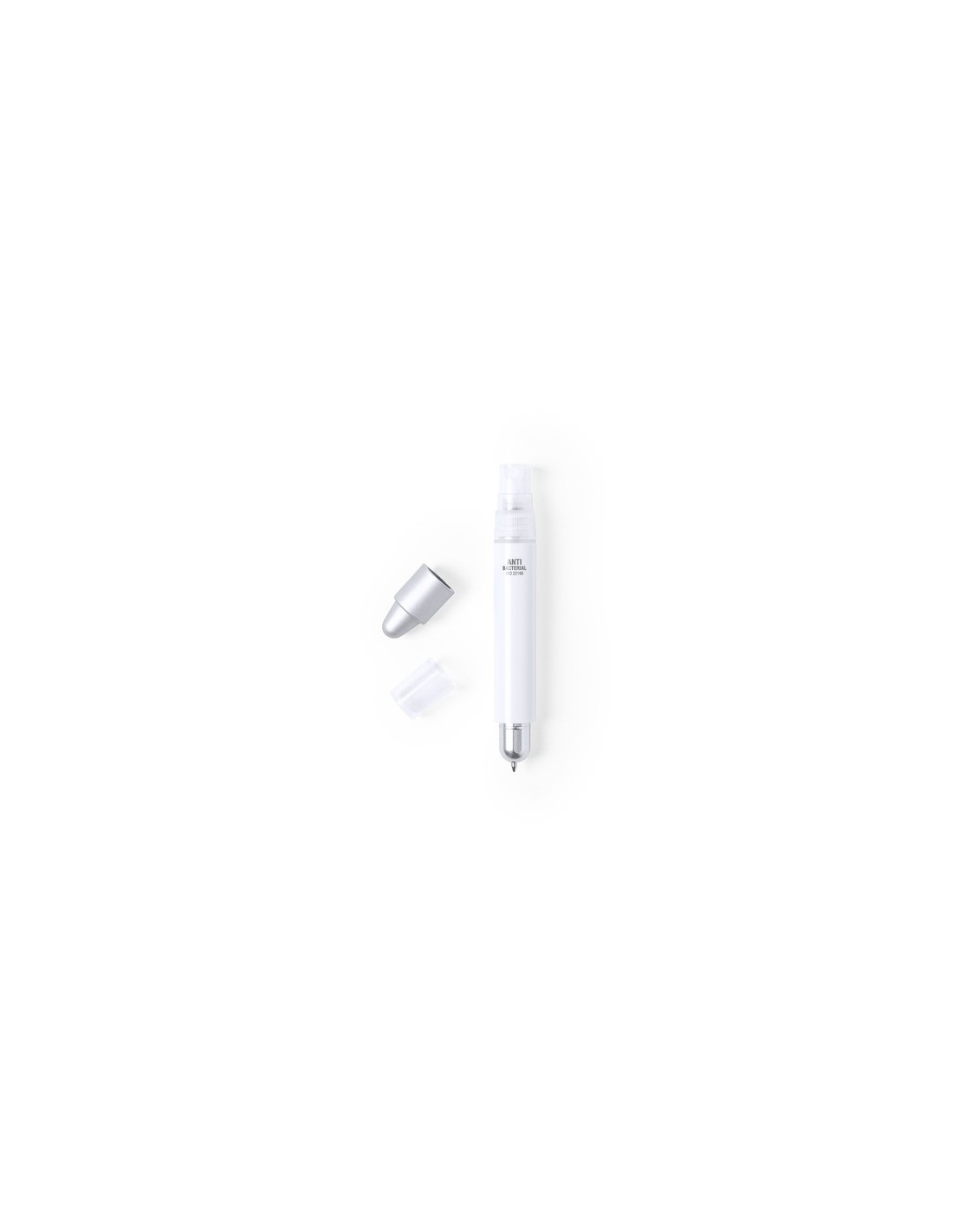 Bolígrafo antibacteriano con pulverizador recargable integrado y capucha protectora con puntero en color gris. Acabado liso en resistente ABS brillante con detalles cromados y escritura en tinta azul. Capacidad del pulverizador 3ml. Líquido no incluido.Los productos con tratamientos antibacterianos son capaces de reducir drásticamente las cargas bacterianas presentes en las superficies de los materiales, gracias a la incorporación de agentes microbianos permanentes estáticos, con alta efectividad para inhibir y prevenir la contaminación bacteriana.Artículo de acuerdo al estándar ISO 22196, que determina la actividad antibacteriana en materiales plásticos y superficies no porosas, lo que permite conocer la efectividad de inhibición microbiana que tienen los aditivos sobre los objetos tratados mediante una evaluación cuantitativa. 3 ml. Líquido No Incluido