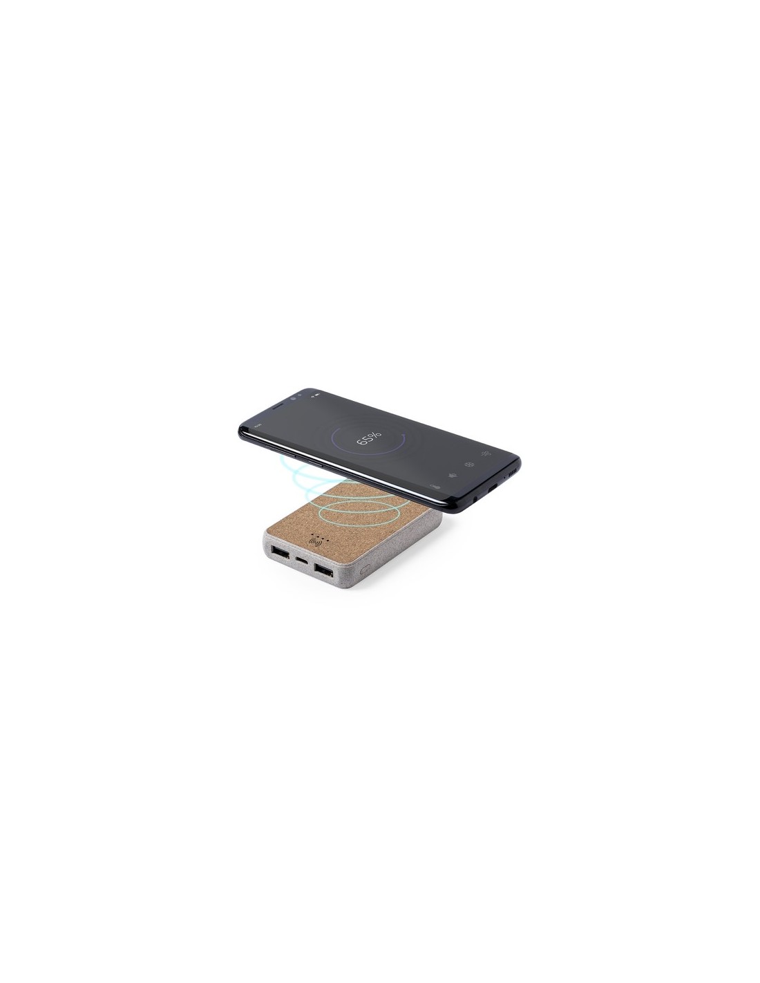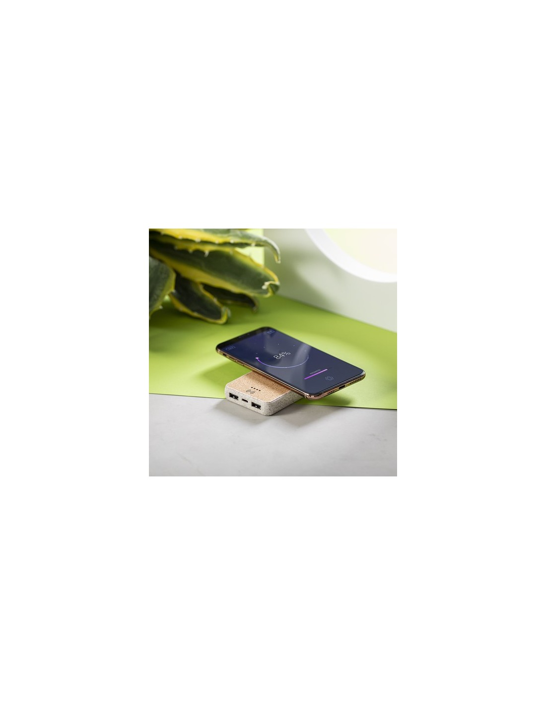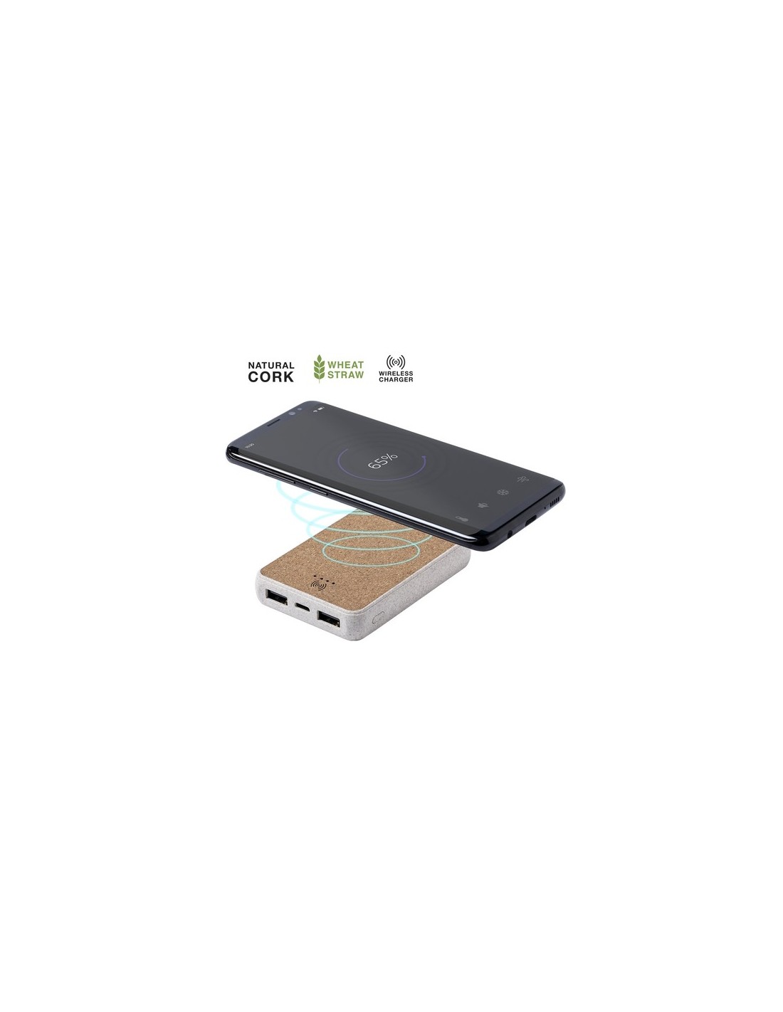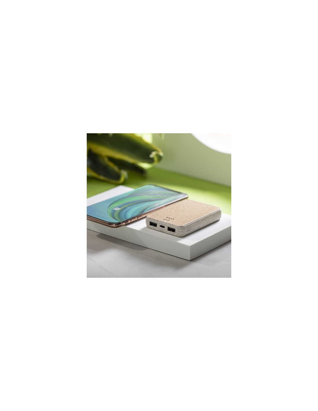 Batería auxiliar externa de línea nature con cargador inalámbrico 5W integrado. Carcasa en combinación de materiales corcho natural y caña de trigo. 5.000 mAh de capacidad e indicador de estado de carga. Doble salida USB y entrada Tipo C. Con amplia superficie de marcaje y presentado en atractiva caja de diseño eco. Las capacidades mostradas en todas nuestras baterías auxiliares externas son reales, incorporando todas ellas baterías de grado A y no recicladas, con una vida útil de al menos 500 ciclos de carga y según normativa CE. Además, están fabricadas conforme a los estándares RoHS y en cumplimiento con los siguientes requisitos de seguridad: Sistema de protección contra sobrecarga del power bank. Sistema de protección contra descarga completa que proporciona una mayor durabilidad del power bank. Sistema de bloqueo para evitar cortocircuitos. Sistema de transferencia de carga constante, acorde con la capacidad del dispositivo de destino. Inalámbrico 5W. 5000 mAh. 2 Salidas USB. Entrada Tipo C Composition : Caña de Trigo/ ABS/ Corcho.