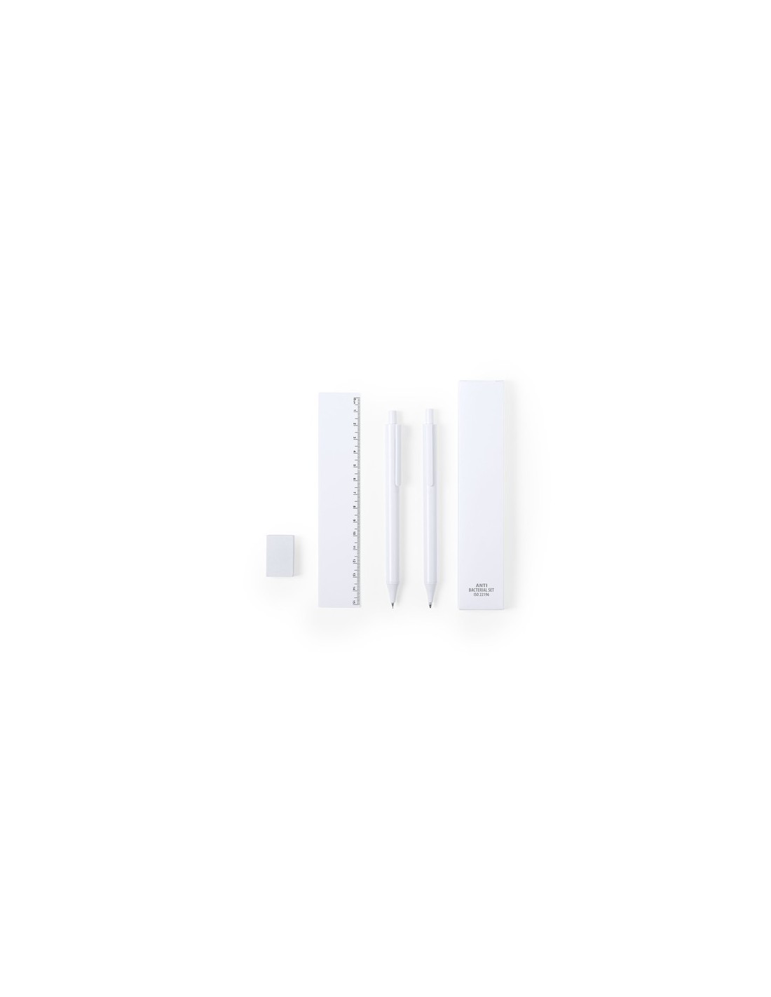 Set antibacteriano en resistente material PP de color blanco. Incluye bolígrafo, portaminas (mina 0,5 mm incluida), regla de 15 cm y goma.Bolígrafo de mecanismo pulsador y tinta azul.Los productos con tratamientos antibacterianos son capaces de reducir drásticamente las cargas bacterianas presentes en las superficies de los materiales, gracias a la incorporación de agentes microbianos permanentes estáticos, con alta efectividad para inhibir y prevenir la contaminación bacteriana.Artículo de acuerdo al estándar ISO 22196, que determina la actividad antibacteriana en materiales plásticos y superficies no porosas, lo que permite conocer la efectividad de inhibición microbiana que tienen los aditivos sobre los objetos tratados mediante una evaluación cuantitativa. 4 Piezas. Bolígrafo. Portaminas: Minas 0,5 mm Incluidas Composition : PP.