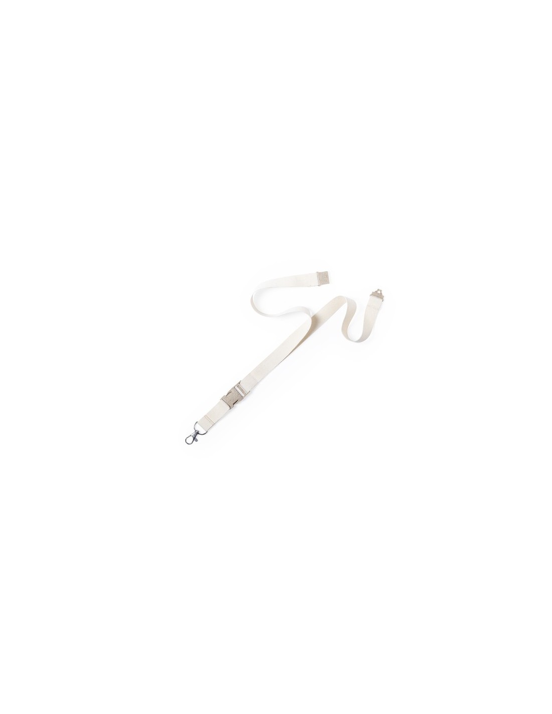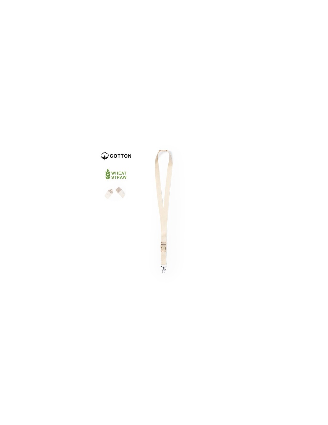 Lanyard de línea nature en material 100% algodón. Hebilla y cierre de seguridad en cuello de caña de trigo/PP, para así fomentar la utilización de materias primas naturales y reducir las emisiones contaminantes. Con mosquetón metálico giratorio y disponible en color natural. Cierre Seguridad Composition : 100% Algodón/ Caña de Trigo/ PP.