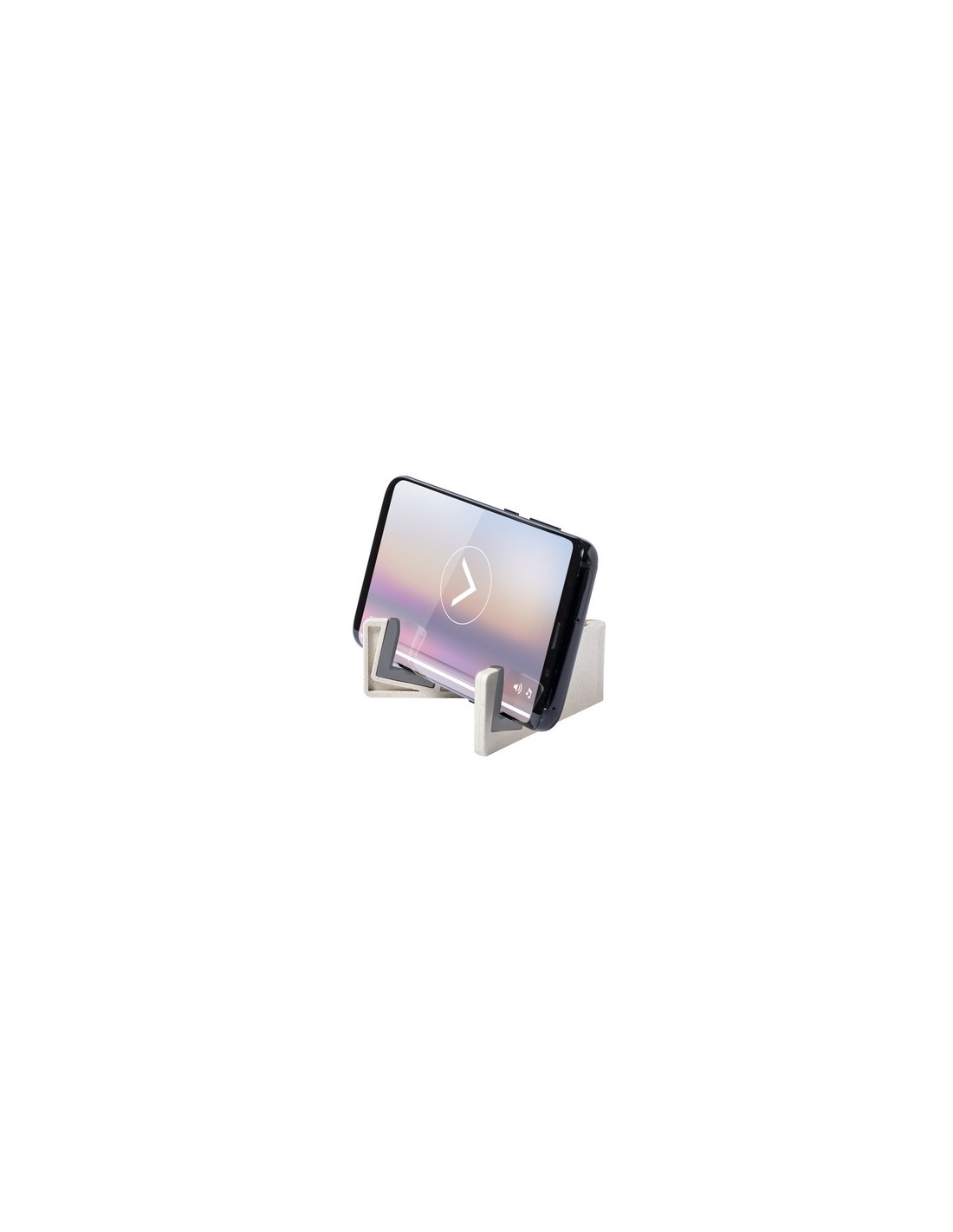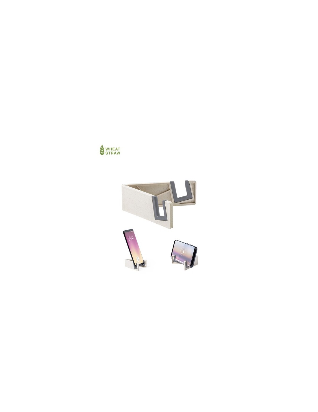 Soporte para dispositivo móvil de línea nature. Fabricado en caña de trigo/PP, para así fomentar la utilización de materias primas naturales y reducir las emisiones contaminantes.Patas plegables con topes antideslizantes en PVC, especialmente diseñado para marcaje en tampografía. Composition : Caña de Trigo/ PP.