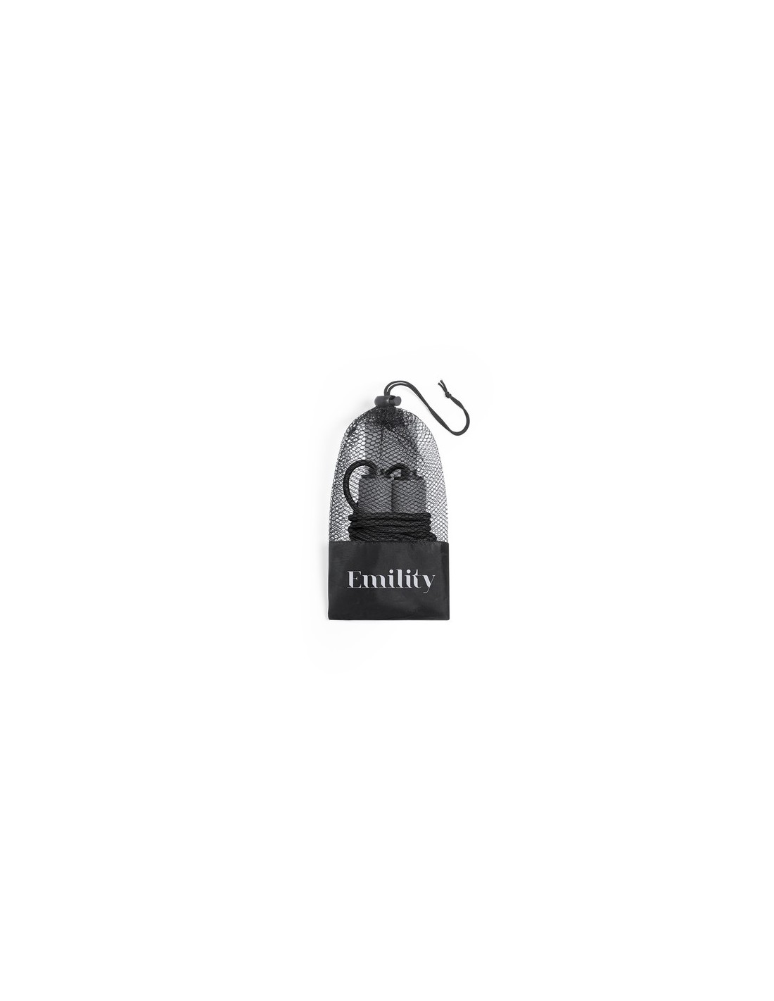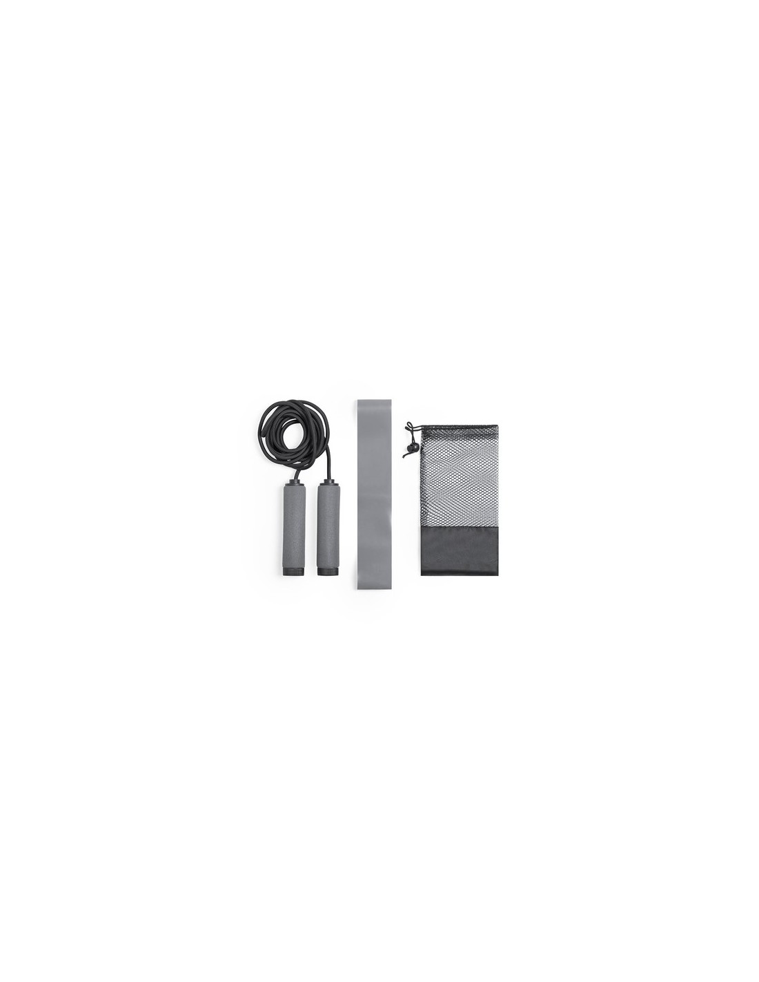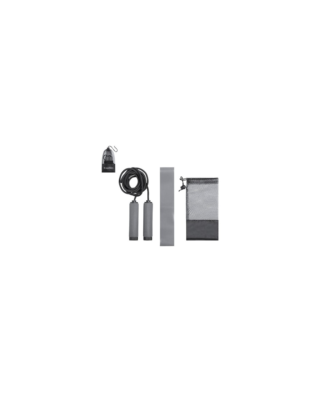 Set de goma elástica y comba para los más deportistas. Incluye: 1 cinta de 25x5 cm fabricada en resistente material TPE y resistencia media 1 comba de 260 cm, con mangos en resistente material HIPS forrados en EVA. Presentado en funda de poliéster con cierre de cordón y accesorio de ajuste. 2 Piezas. Goma Elástica Resistencia Media. Funda Poliéster Composition : TPE/ EVA.
