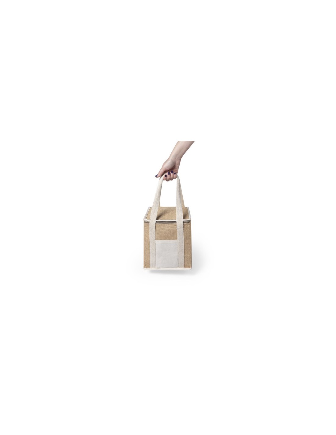 Nevera de línea nature con altura extra. Fabricada en yute laminado resistente a la humedad, con interior isotermo acabado en aluminio y cremallera a juego. Asas y bolsillo exterior para marcaje en algodón. Composition : Yute Laminado/ Algodón/ Aluminio.