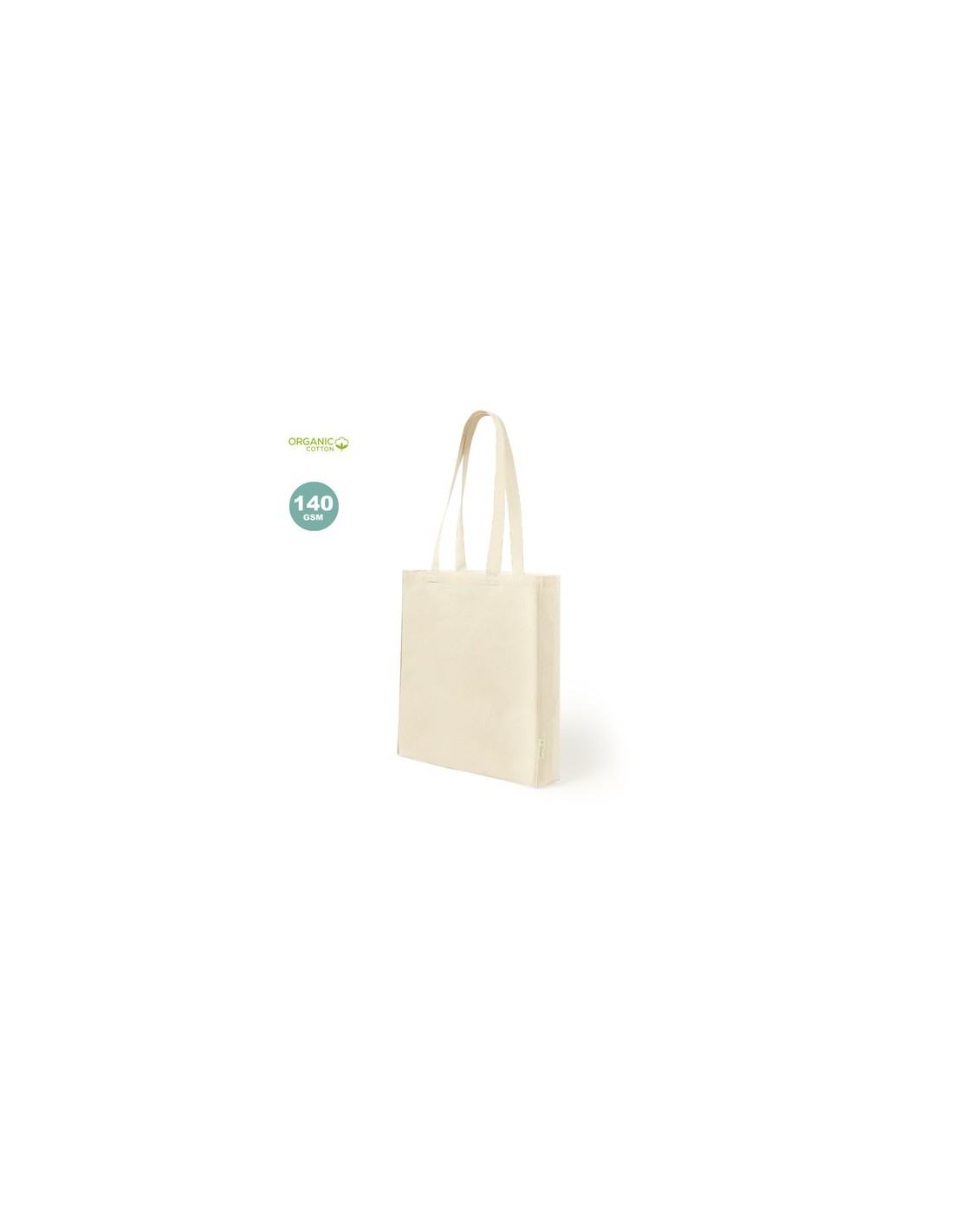 Bolsa de línea nature en algodón orgánico de 140g/m2. Asas largas en algodón orgánico, de 70 cm y reforzadas. Acabado cosido y resistencia de hasta 8kg de peso, con distintivo algodón orgánico en la etiqueta. Composition : 100% Algodón Orgánico 140 g/ m2.