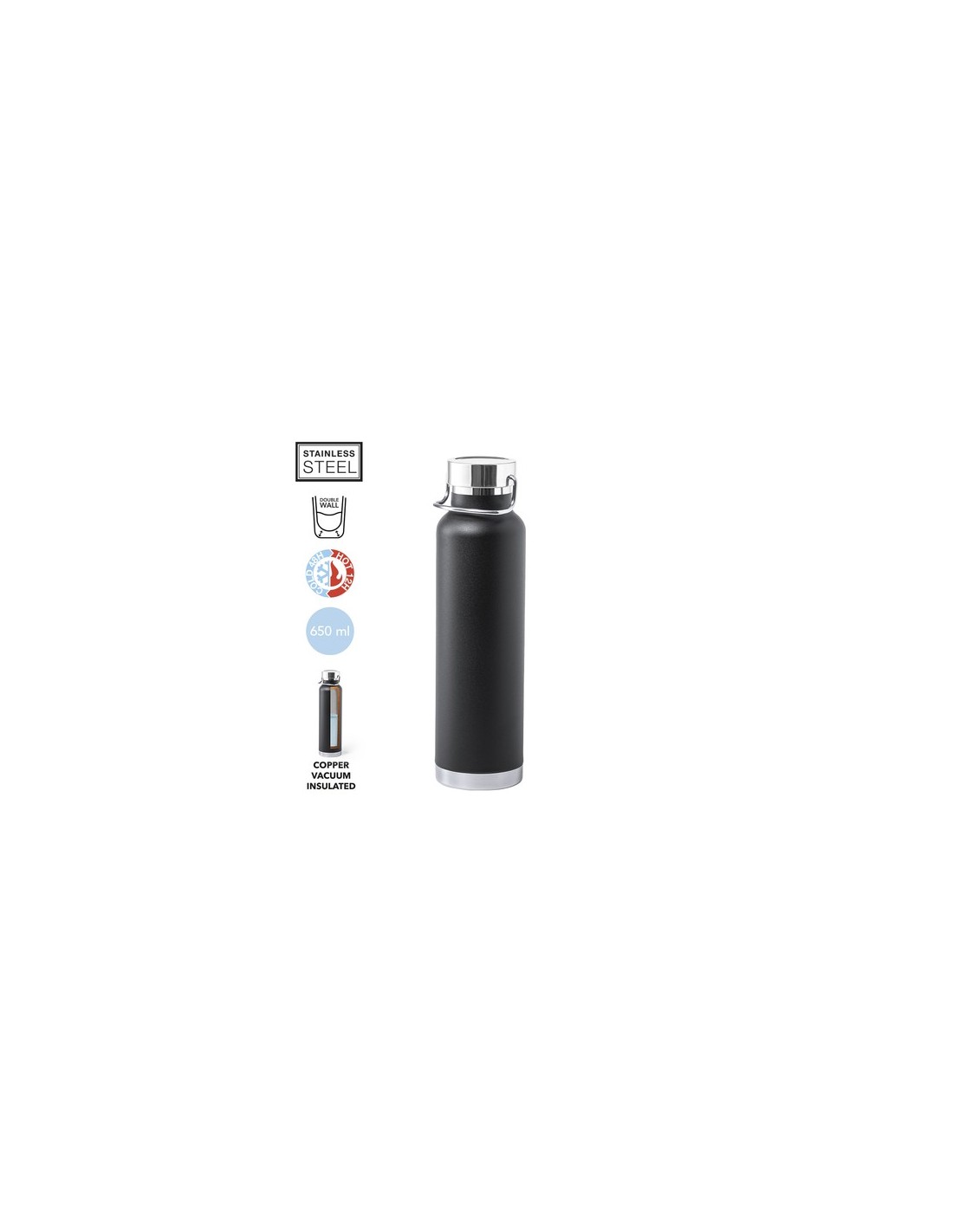 Bidón térmico de acero inox, con doble capa y aislamiento de cobre al vacío. El mismo le permite mantener el calor y el frio durante un tiempo más prolongado, llegando a las 12 y 48 horas respectivamente. De 650ml de capacidad, y disponible en variada gama de colores metalizados. Presentado en atractiva caja de diseño. 650 ml. Aislamiento de Cobre al Vacío Composition : Acero Inox.