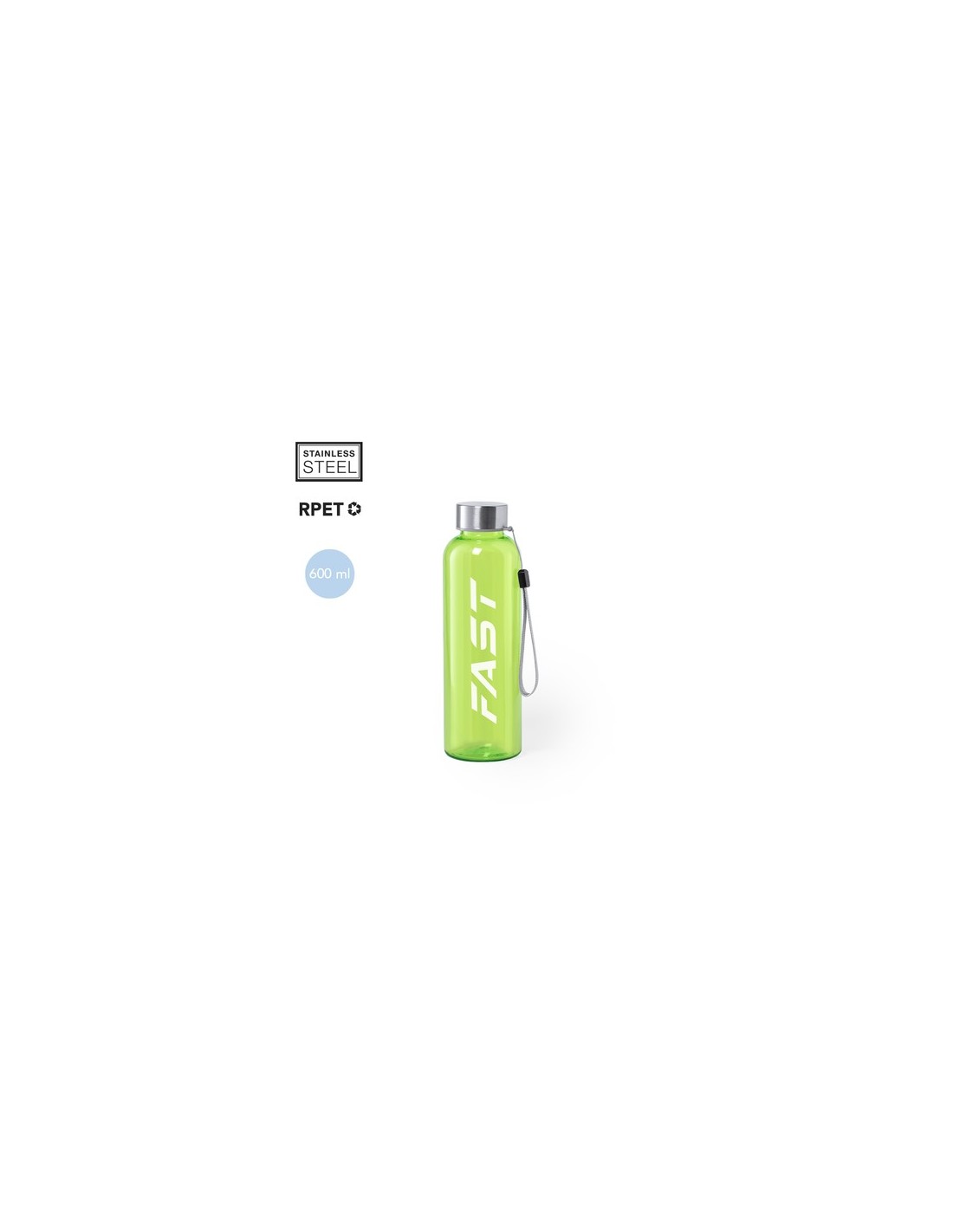 Bidón fabricado en RPET de 600ml de capacidad, libre de BPA. Tapón a rosca en acero inox, con cordón de transporte. Disponible en variada gama de colores.Elaborado a partir de plástico reciclado, para así fomentar la reutilización de residuos plásticos y ayudar a la sostenibilidad del planeta. 600 ml Composition : RPET/ Acero Inox.