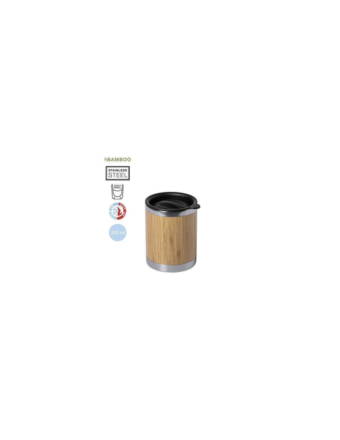 Vaso con 300ml de capacidad. Cuerpo en combinación bambú y acero inox de doble pared para mejor y más duradera conservación de la temperatura. Con original tapón dosificador de fácil apertura en negro. Es ideal para tener en tu escritorio, mesa o en cualquier superficie donde disfrutar tranquilamente de tu bebida favorita. 300 ml Composition : Bambú/ Acero Inox.