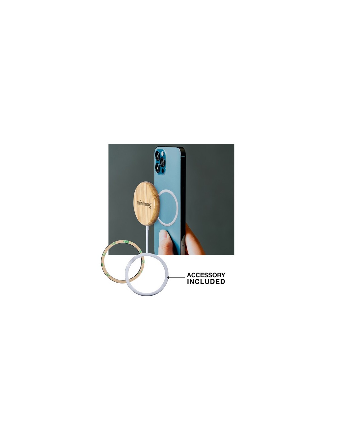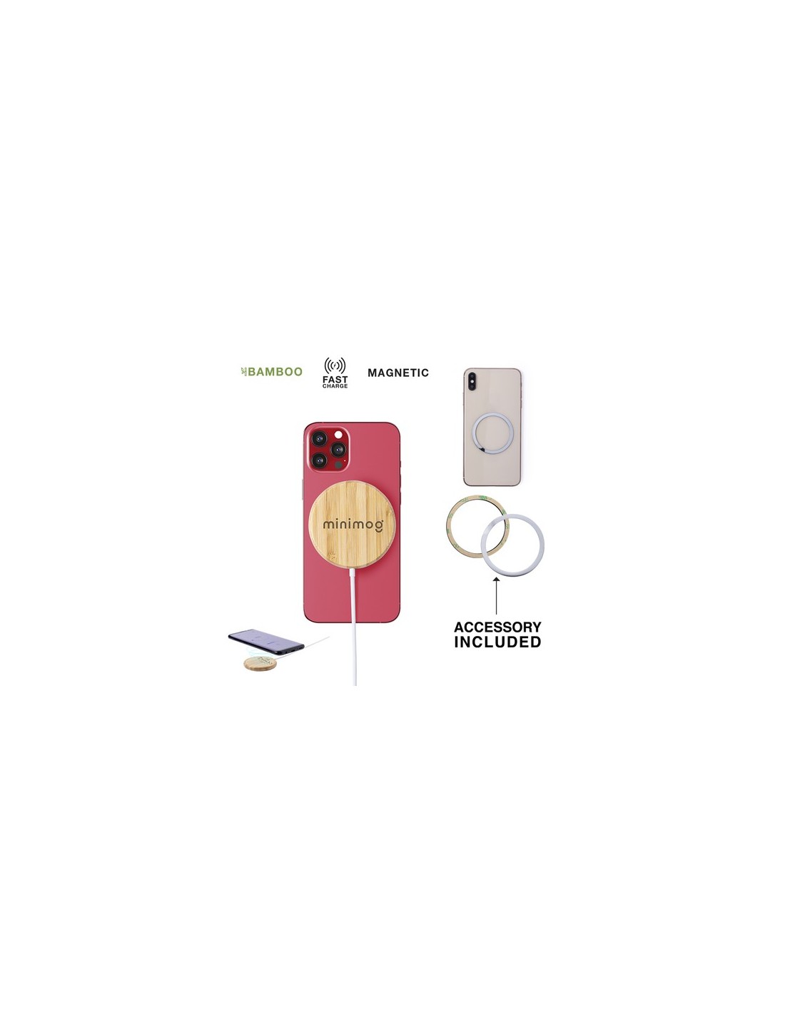 Cargador inalámbrico magnético 10W de línea nature, con carcasa fabricada en resistente bambú. Con indicador de estado de carga y cable USB de 1m. Incluye accesorio metálico con adhesivo 3M, de fijación extra fuerte y libre de residuo al despegarlo del dispositivo, permitiendo así el uso de la función magnética del cargador en cualquier dispositivo móvil. Compatible con terminales equipados con tecnología de carga inalámbrica. Amplia superficie de marcaje y presentado en atractiva caja de diseño eco. Disponible manual de instrucciones en español e inglés. Inalámbrico 10W. Magnético Composition : Bambú.