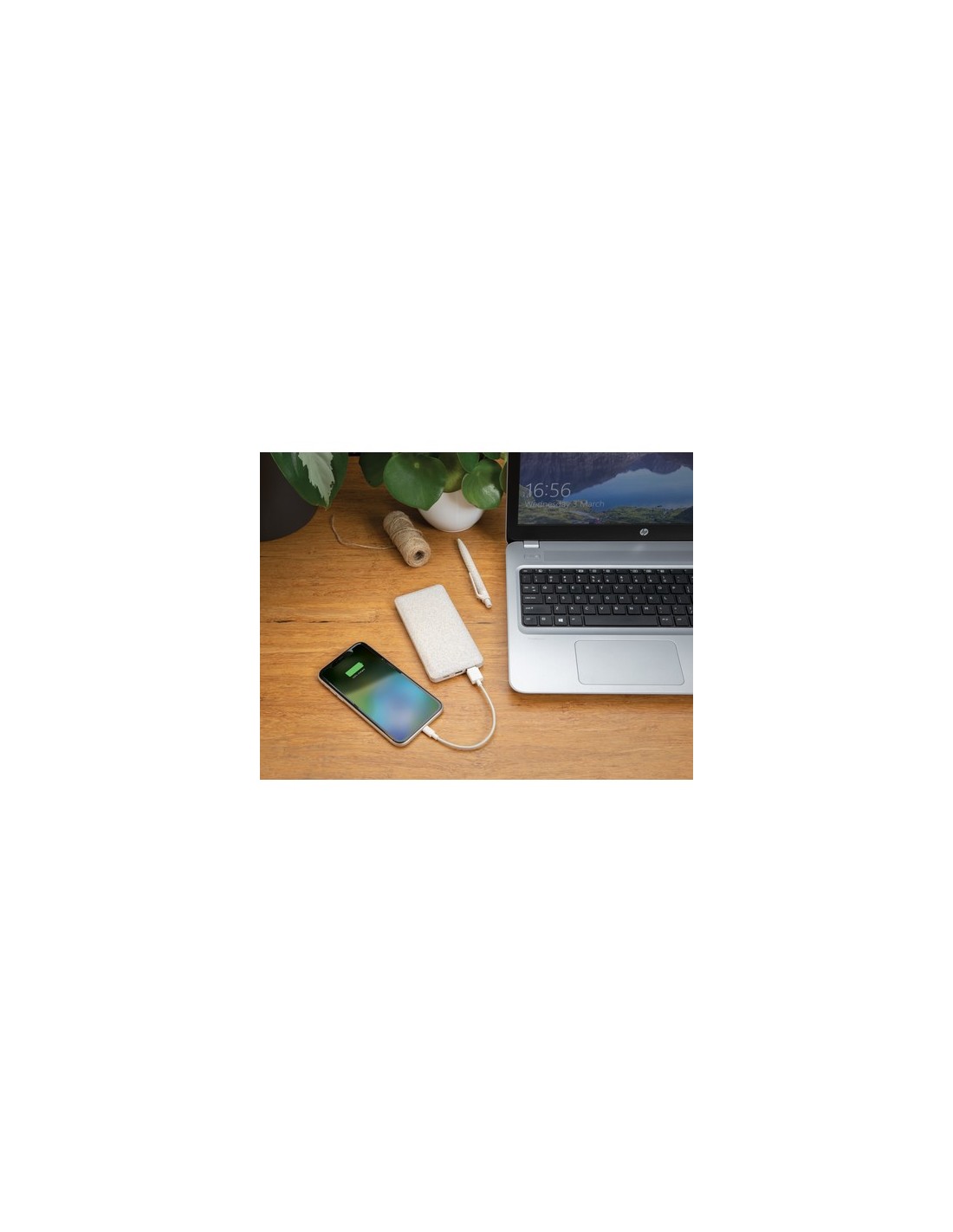 Powerbank ultraplano de 10.000 mAh fabricado con fibra de trigo natural (35%) mezclado con ABS. Cuando esté completamente cargado, te proporcionará suficiente energía para recargar tu teléfono móvil hasta cuatro veces. El powerbank contiene una batería de polímero de litio de alta densidad de 10.000 mAh de grado A de larga duración. Con puerto USB dual que incluye una salida tipo C para todos los teléfonos móviles nuevos. Los indicadores de energía indicarán el nivel de energía restante para que siempre sepas cuándo recargar. Incluye cable de material micro USB TPE para cargar. Entrada Micro USB 5V/2A; Entrada tipo C 5V/2A; Salida USB 5V/3A; Salida tipo C 5V/2A; Artículo y accesorios sin PVC. Material : Paja de trigo, ABS Recycled Content Percent : 0 Conforme directiva bateria 2006/66EC, Conforme directiva Electromagnética 2014/30/EU, Conforme directiva de sustancias peligrosas 2011/65/EC & 2015/863, Hoja de datos de seguridad del material disponible, Conforme PAHS content in Reach & ZEK 01-4-08, Conforme directiva Phtalate content, Conforme directiva Battery transportation safety UN38.3, Certificado para transporte aéreo, Conforme directiva seguridad baterias Alcalinas EN62133, Libre de parafinas cloradas de cadena corta y media., Conforme directiva EN60950-1 a la protección contra descargas eléctricas y peligros de energía WEEE Battery : 1 Li-poli - 169,1 g. Packaging : Bolsa de plástico y caja individual All print codes : Pad Print,Digital Print 2 - Print code default : Tampografía - parte frontal del artículo - 80 x 40 mm - max color : 5 Social Audits : BSCI Total CO2 emissions : 3,75.