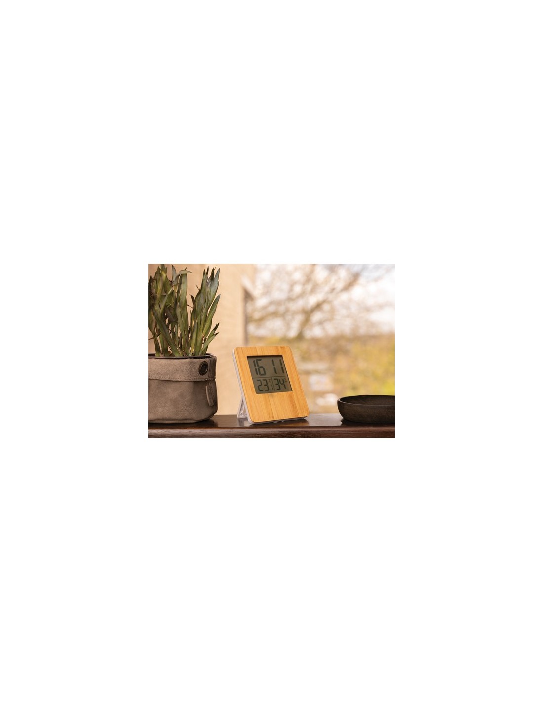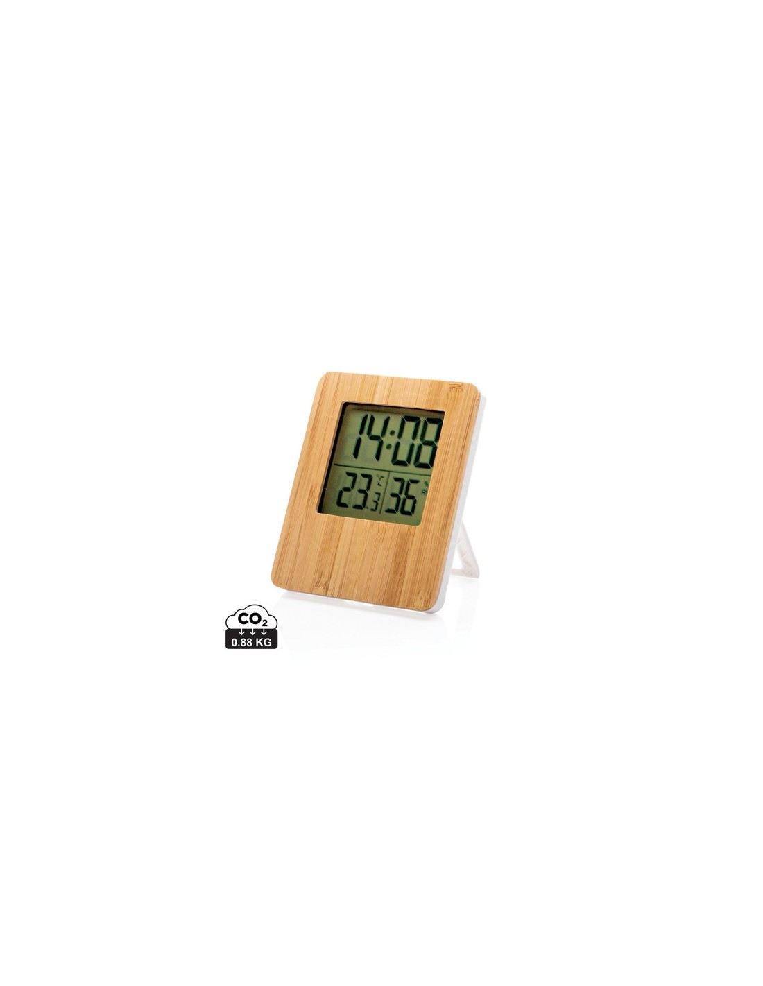 Estación meteorológica de bambú con 3 funciones: hora/fecha, humedad interior y temperatura. Incluye 2 pilas AAA para uso directo. Material de bambú y ABS. Tolerancia a la humedad de 5%. Material : Bambú, ABS Recycled Content Percent : 0 Libre de parafinas cloradas de cadena corta y media., Certificado para transporte aéreo, Conforme directiva Phtalate content, Conforme PAHS content in Reach & ZEK 01-4-08, Hoja de datos de seguridad del material disponible, Conforme directiva de sustancias peligrosas 2011/65/EC & 2015/863, Conforme directiva Battery transportation safety UN38.3, Conforme directiva equipamientos Radio y Telecomunicaciones 2014/53/EU WEEE Battery : 2 AAA - LR03 - 13 g. Packaging : Bolsa de plástico y caja individual All print codes : CO2 Engraving 2,Pad Print - Print code default : Grabado CO2 - parte frontal y baja del artículo - 80 x 35 mm - max color : 1 Social Audits : BSCI Total CO2 emissions : 0,88.