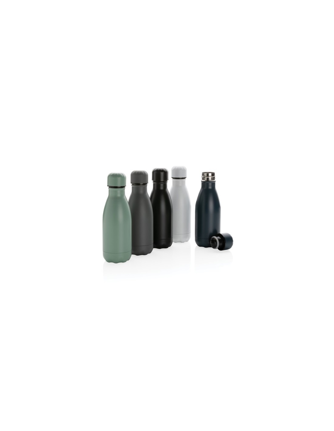 Aumenta tu consumo diario de agua con esta botella de acero inoxidable aislada al vacío de color sólido. La botella mantiene las bebidas frías hasta 15 horas y las bebidas calientes hasta 5 horas. Con una base que se adapta a la mayoría de los portavasos, esta elegante botella de agua te mantendrá hidratado dondequiera que estés. Con su capacidad de 260ml ideal para niños o para meter en tu bolso. Material : Acero inoxidable Recycled Content Percent : 0 Libre de parafinas cloradas de cadena corta y media., Conforme directiva Phtalate content, Conforme legislación alimentos Alemania, Sin materiales Bisphenol A Packaging : Caja de regalo All print codes : Pad Print Drinkware,Laser Engraving 3,Doming,Digital round 360-2,SilkScreen Round - Print code default : Tampografía - parte frontal del artículo - 25 x 60 mm - max color : 5 Social Audits : BSCI Total CO2 emissions : 2,29.