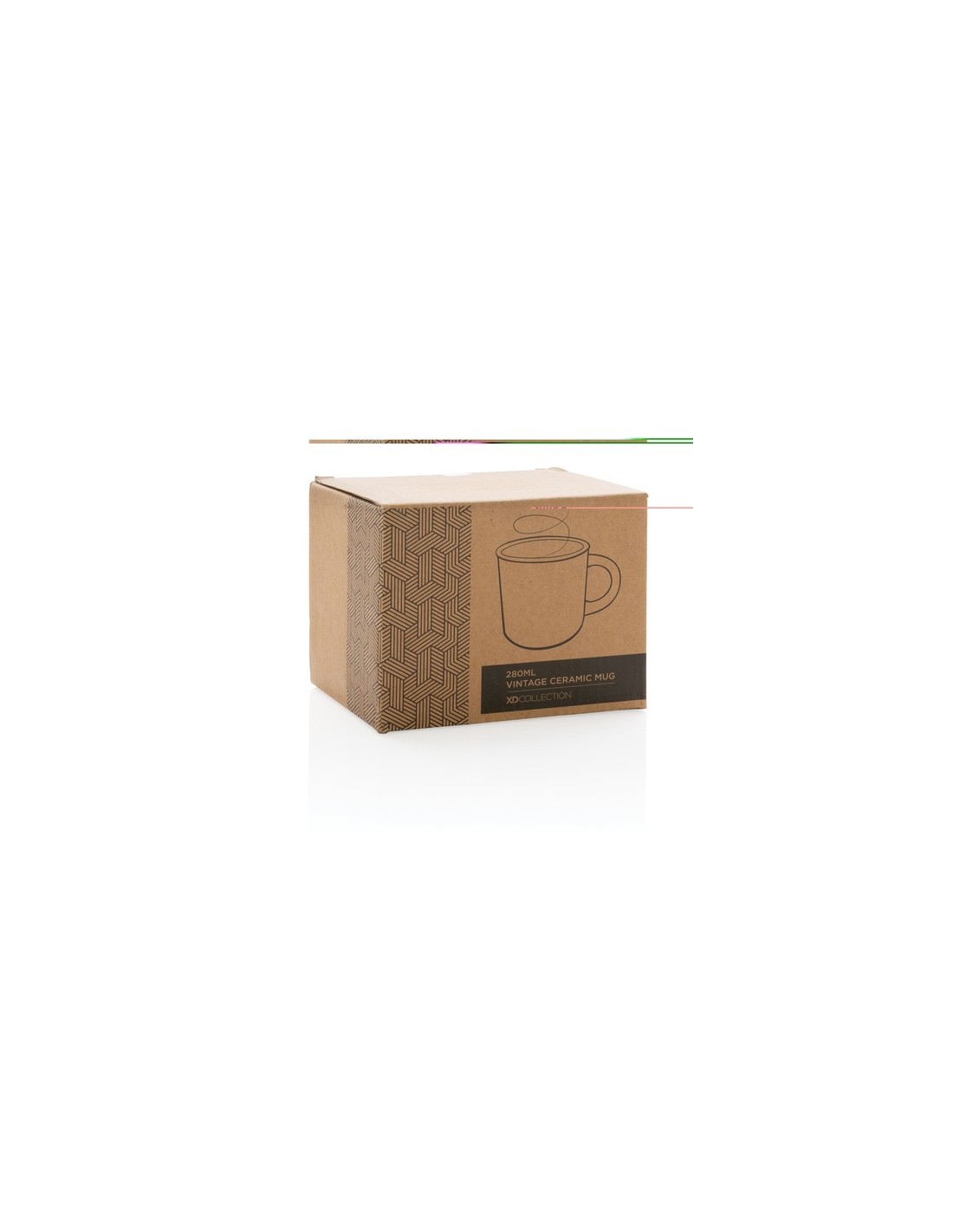 Esta taza está hecha de cerámica para mayor durabilidad. La taza tiene un aspecto vintage y un asa curvada para un fácil agarre. Apto para lavavajillas de acuerdo con EN12875-1 (al menos 125 ciclos de lavado) para todos los métodos de marcaje. Presentado en caja de regalo. Capacidad 280ml. Material : Cerámica Recycled Content Percent : 0 Conforme contenido de plomo U.S, Conforme legislación alimentos Alemania Packaging : Caja individual All print codes : Pad Print Drinkware,Laser Engraving 3 - Print code default : Tampografía - parte frontal del artículo - 30 x 50 mm - max color : 5 Social Audits : BSCI Total CO2 emissions : 1,43.