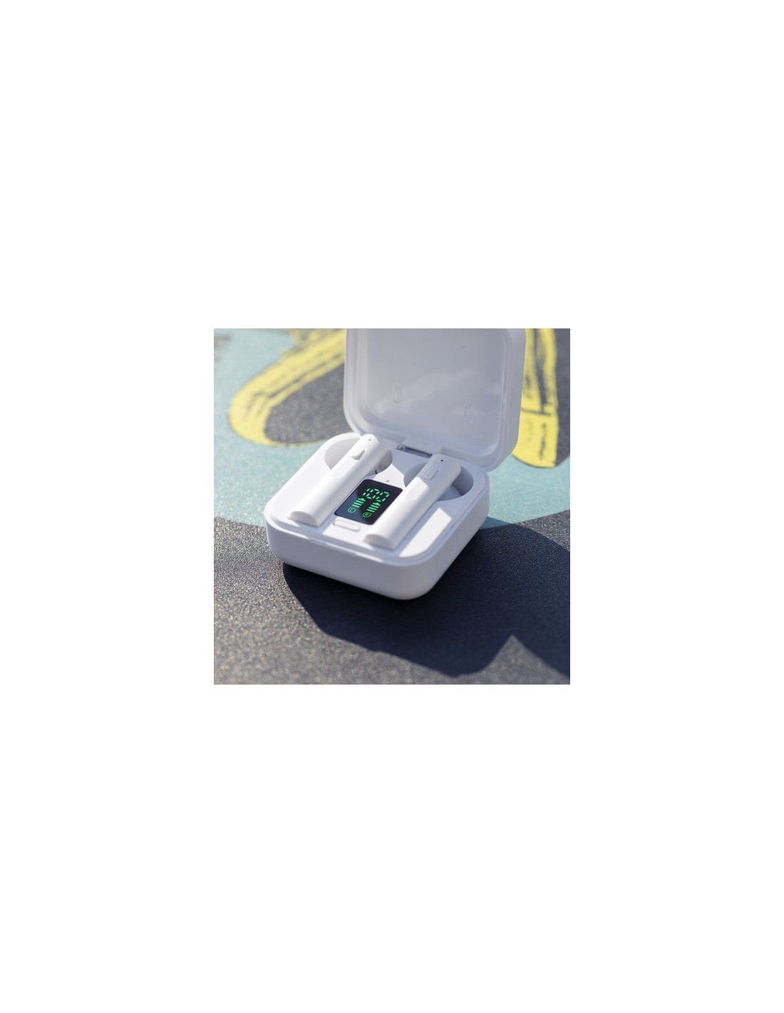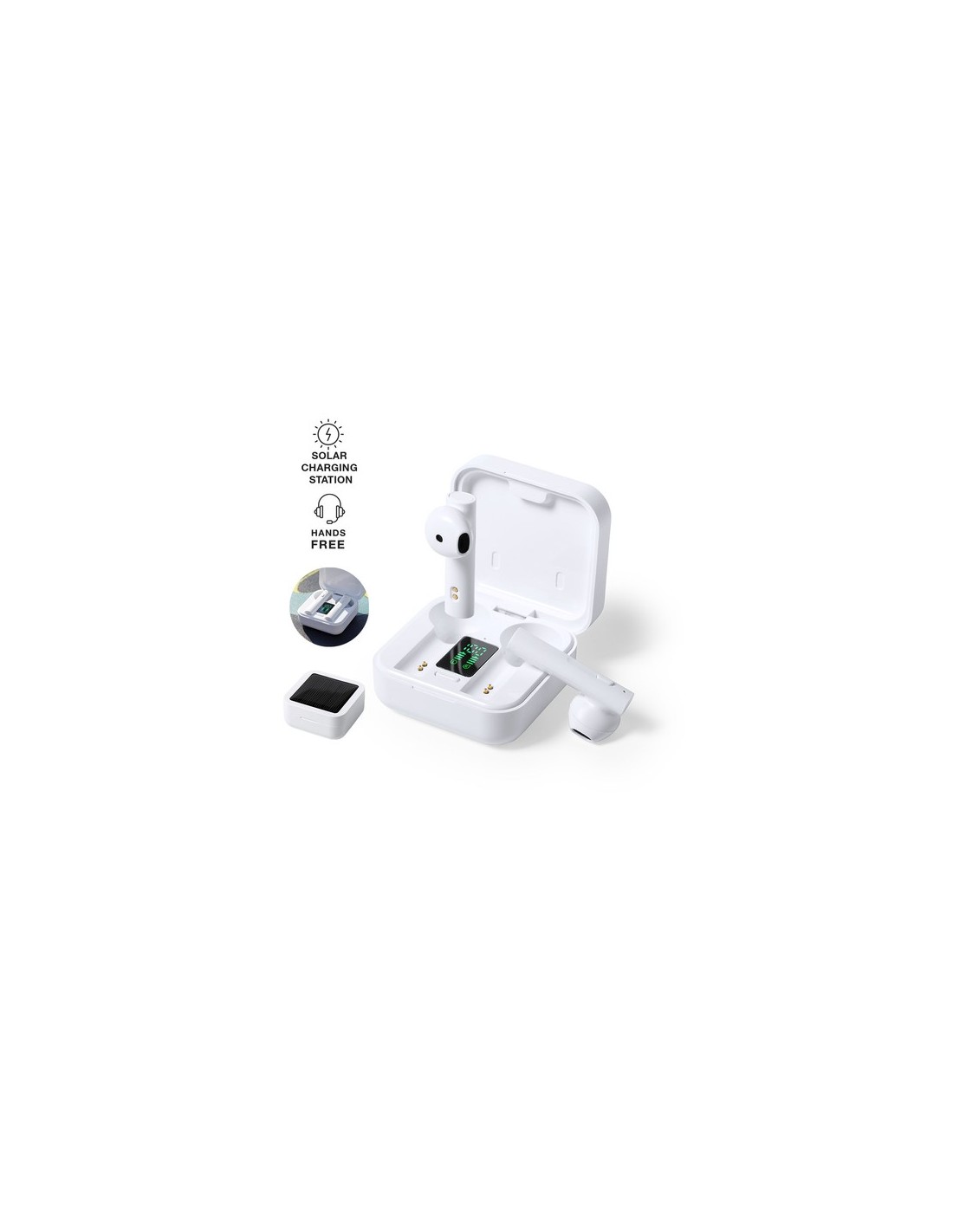 Auriculares intraurales en elegante acabado blanco y conexión Bluetooth 5.0. Con panel de carga solar integrado en la tapa y pantalla LCD interior con indicador de estado de carga. De diseño ergonómico, incluyen botón de control integrado en el auricular, con base a juego. Función manos libres y recargables con energía solar o mediante cable micro USB -incluido-. Presentados en estuche individual premium con apertura de bisagra y en atractiva caja de diseño, con manual de instrucciones en español e inglés. Conexión Bluetooth. Carga Solar. Batería 40 mAh/ Base Carga 260 mAh