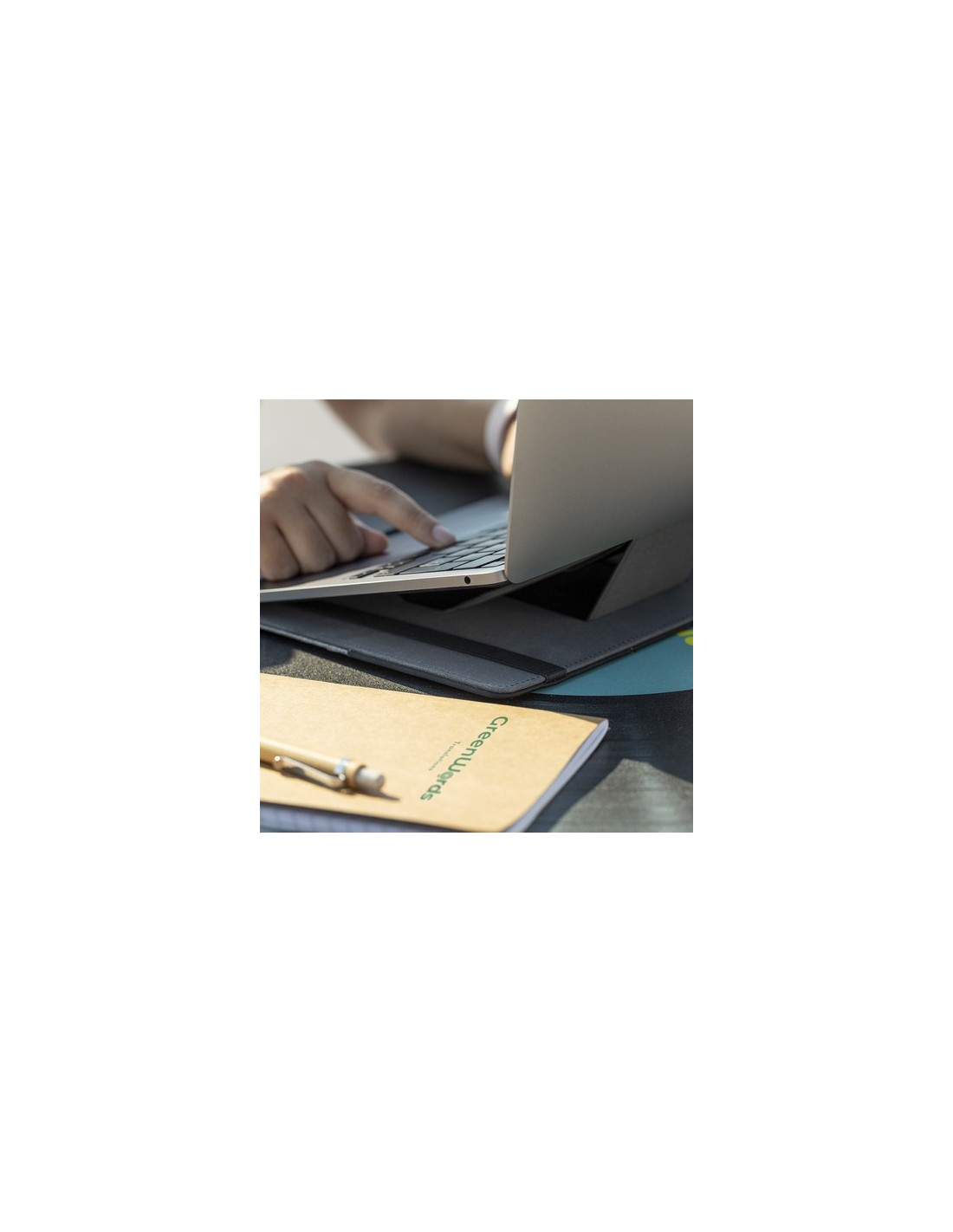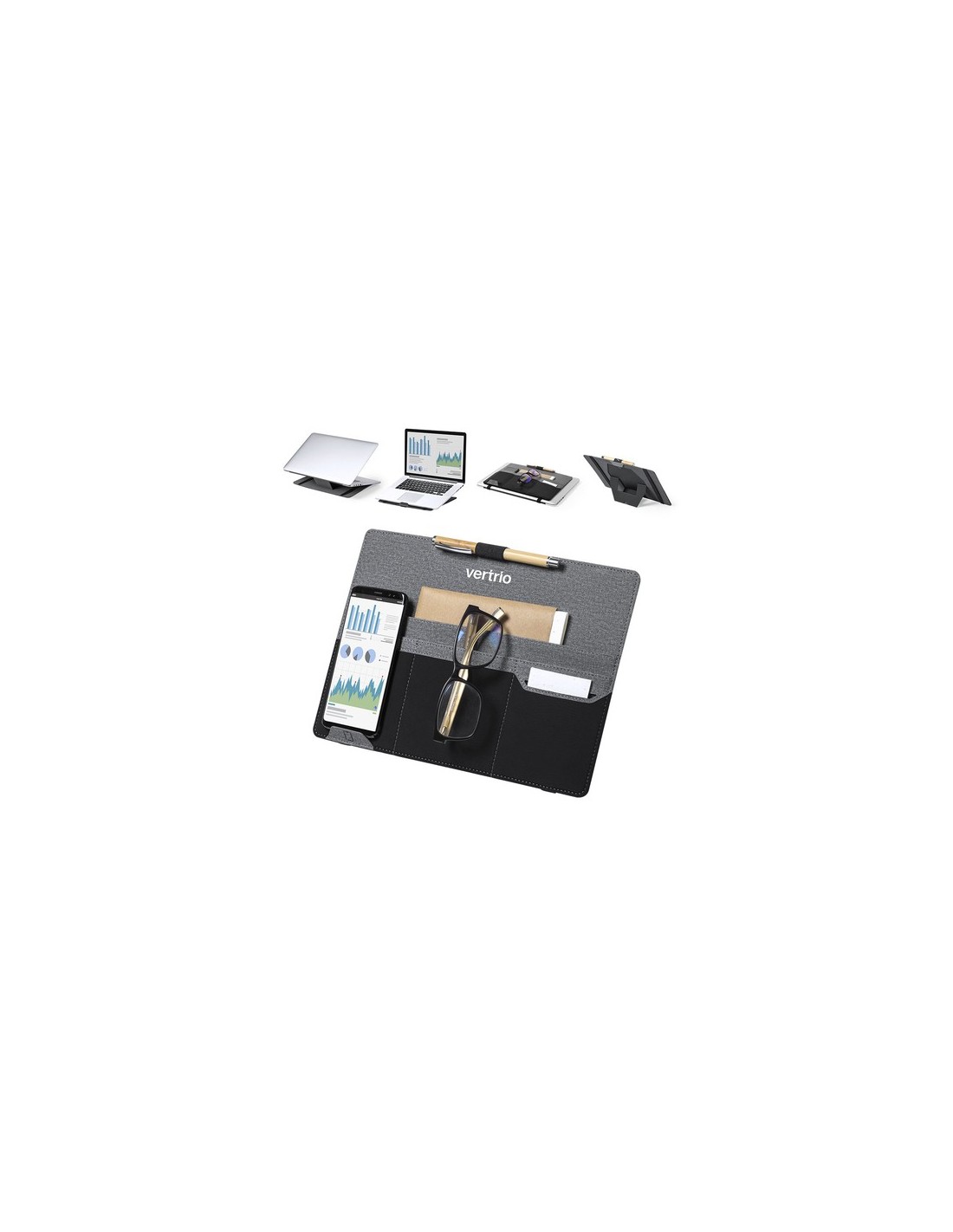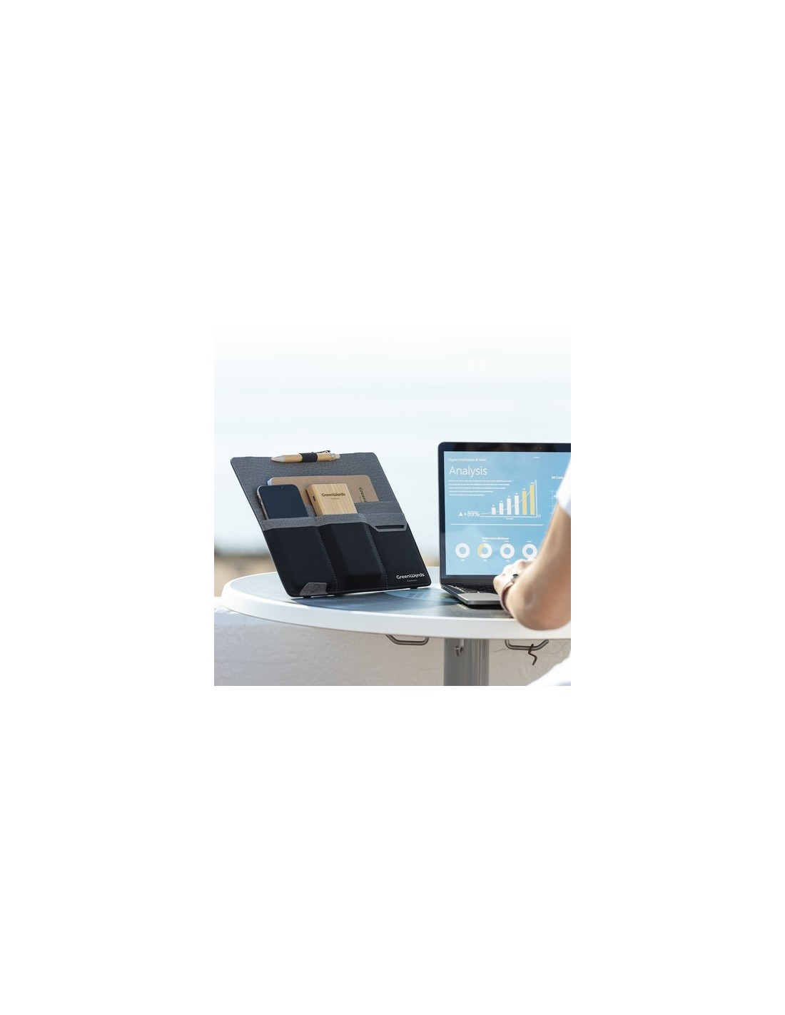 Elegante y práctico organizador con soporte imantado, ideal para facilitar el trabajo o uso de portátil en cualquier lugar o espacio. Fabricado en resistente poliéster gris jaspeado con detalles en polipiel de color negro. Incluye soporte para bolígrafo y smartphone, con 4 bolsillos elásticos para el almacenamiento de diferentes gadgets. Composition : Poliéster/ Polipiel.